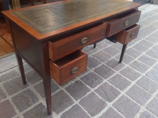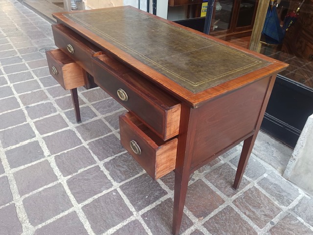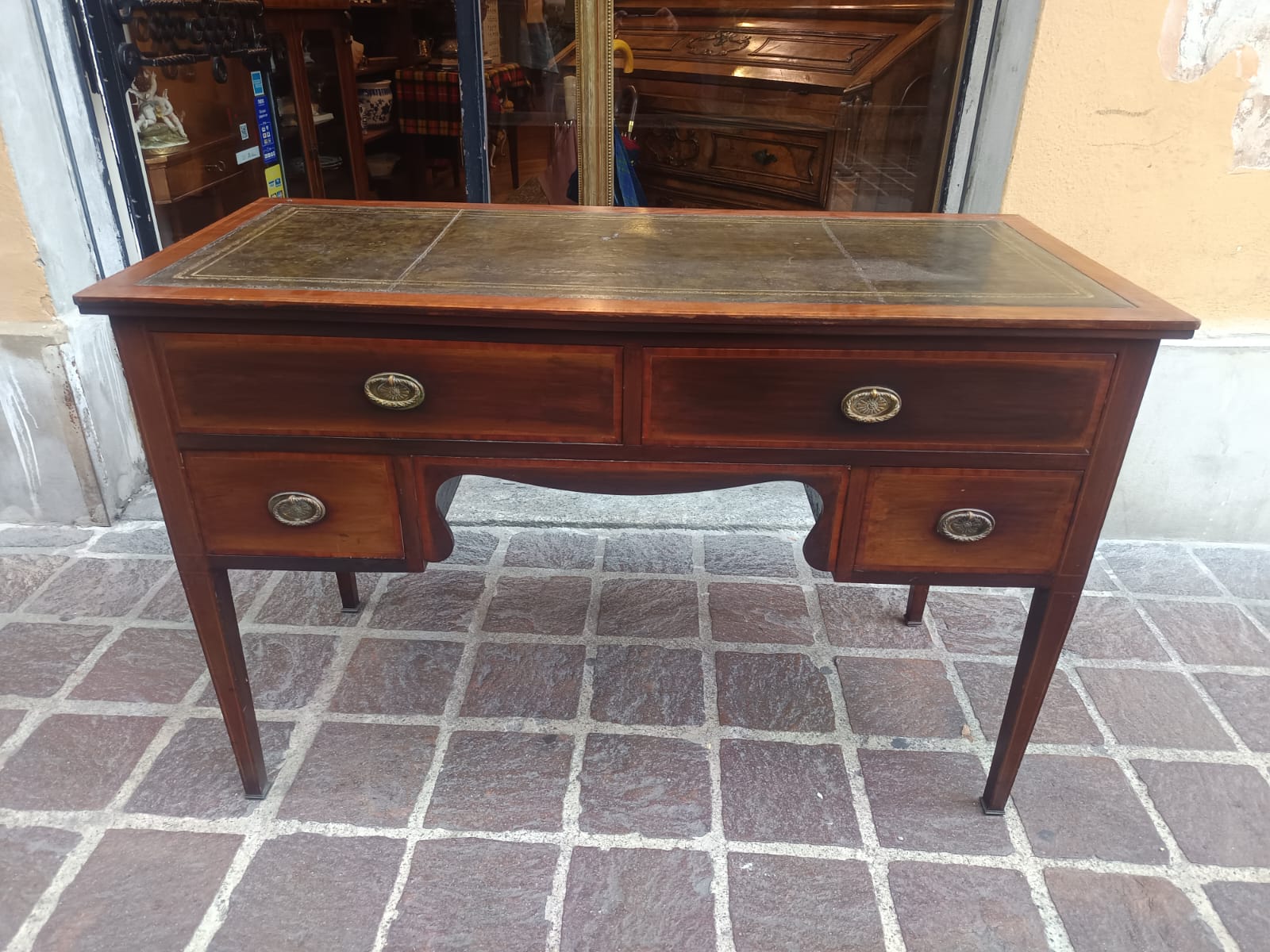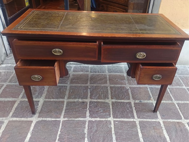 Scrivania Edoardiana in mogano con piano in pelle in ottimo stato. Misure: cm 122 x 54 x 79