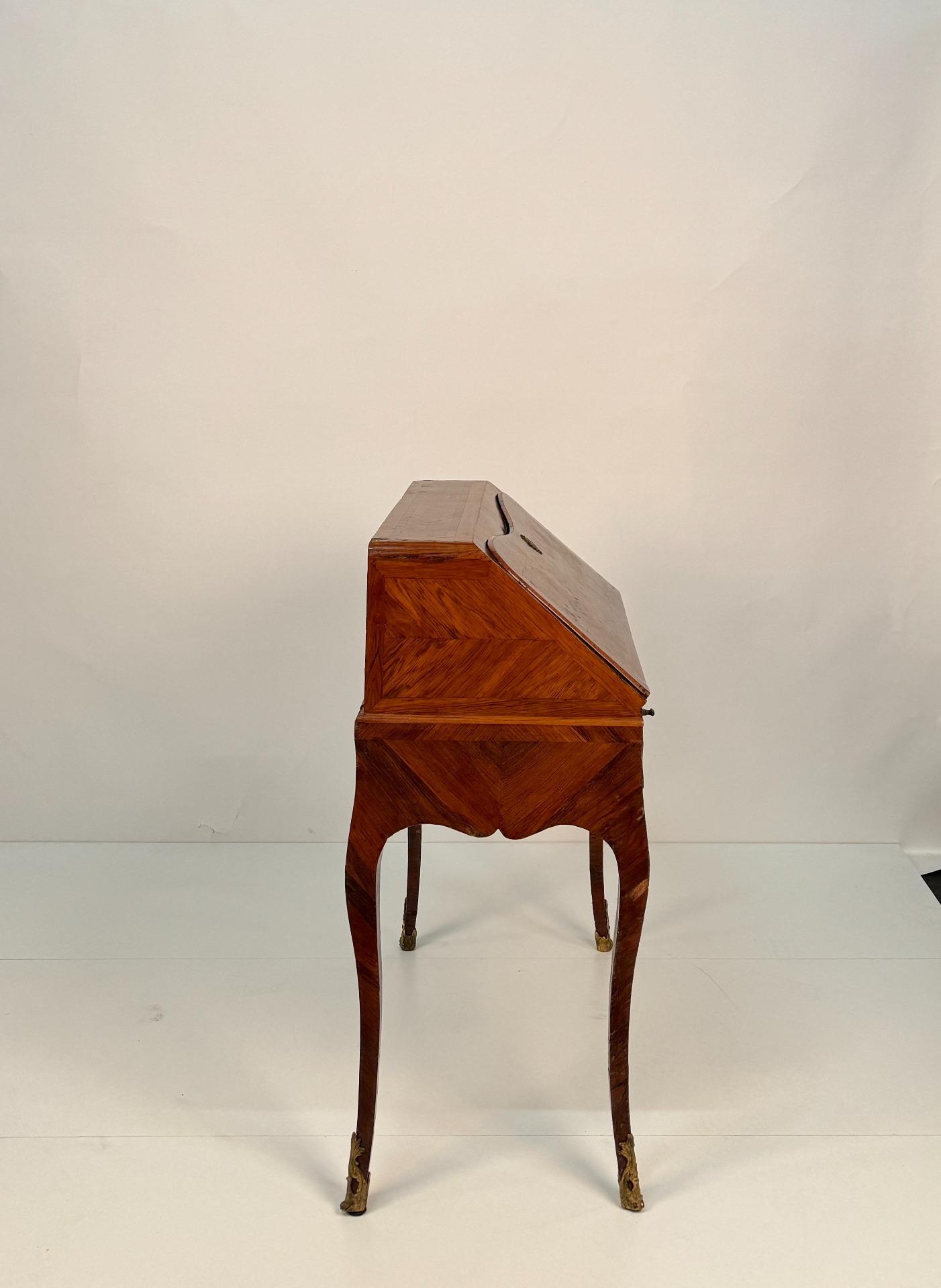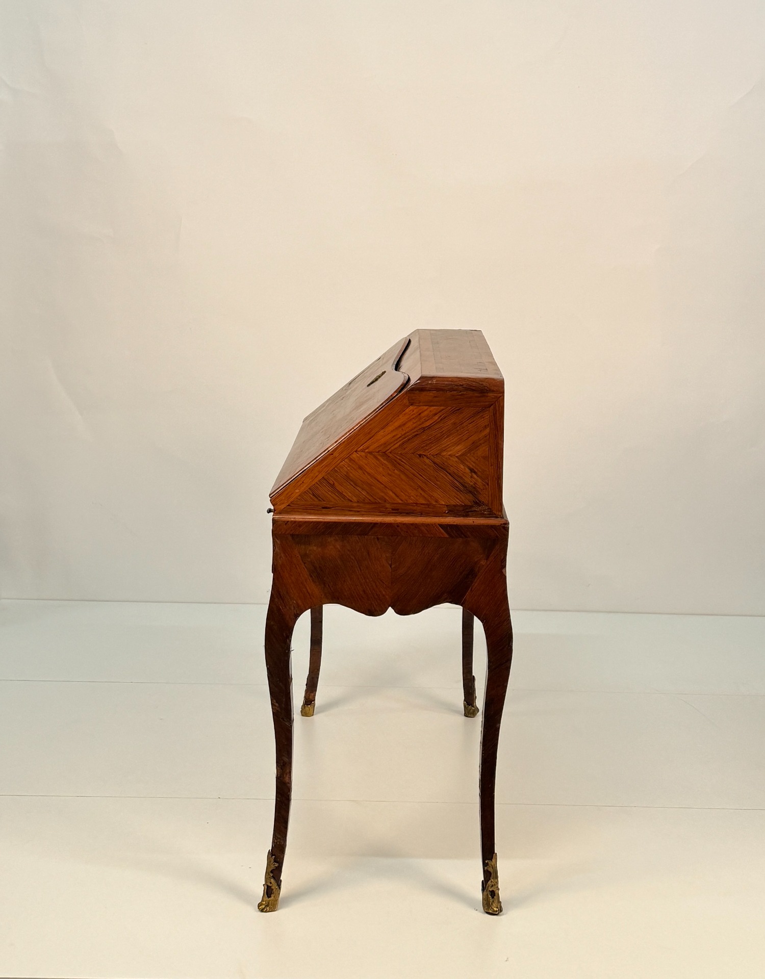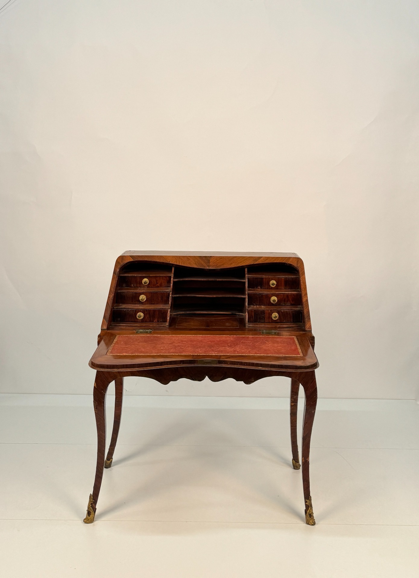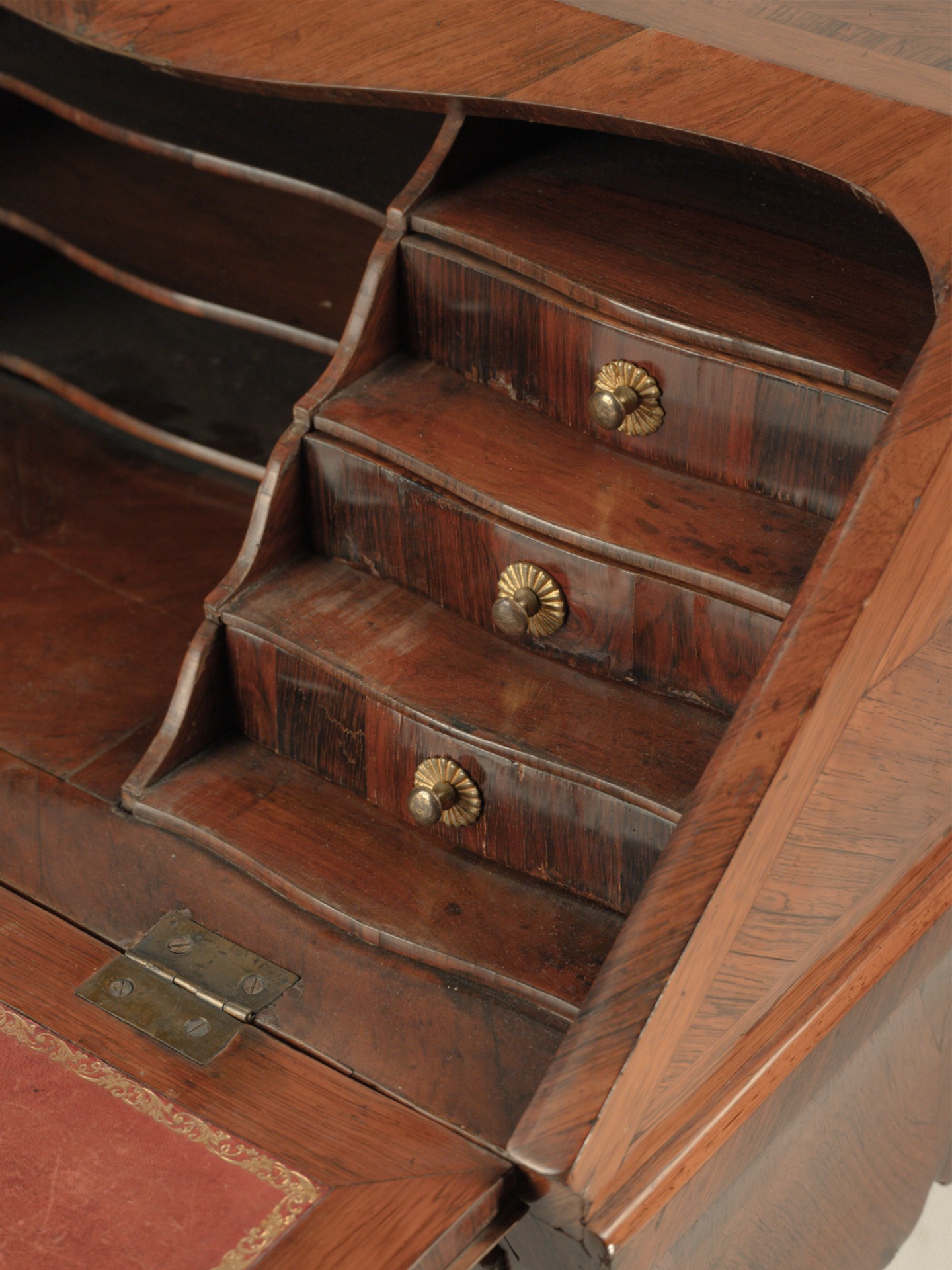 Small drop-front desk veneered in bois de violette, Genoa, 18th century. The shaped drop-front is inlaid with diamond motifs and conceals a structure with six small drawers, three compartments, and a secret. In the shaped belt are two drawers, arched legs ending in metal shoes, cm 94.5x82x45. 2021.42.2. To supplement the descriptions, the "Antichità Giglio" gallery makes available, upon request, condition reports on the state of conservation of its goods and national and international transport estimates.