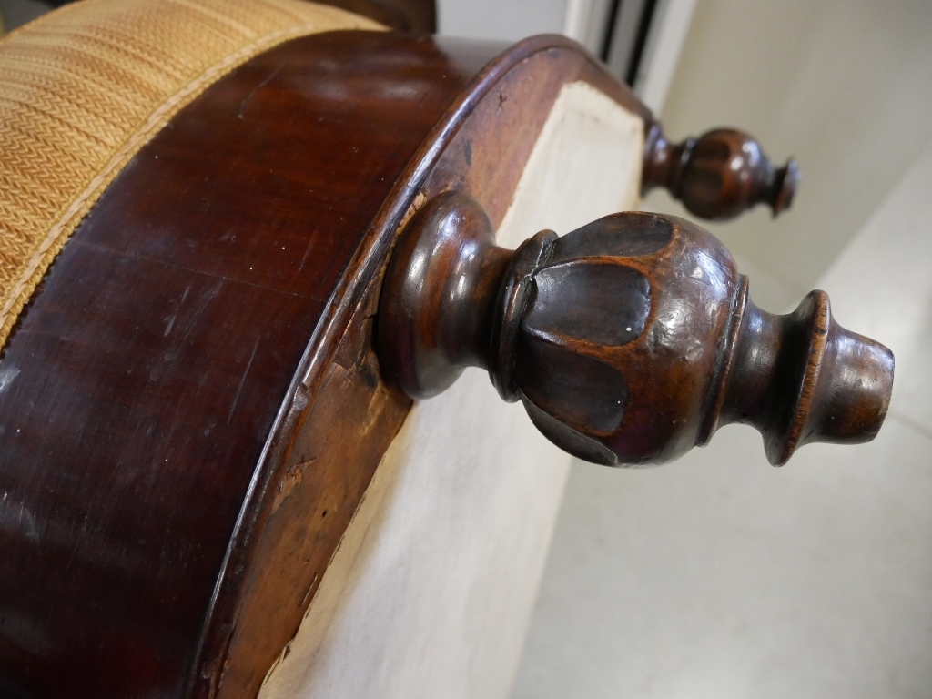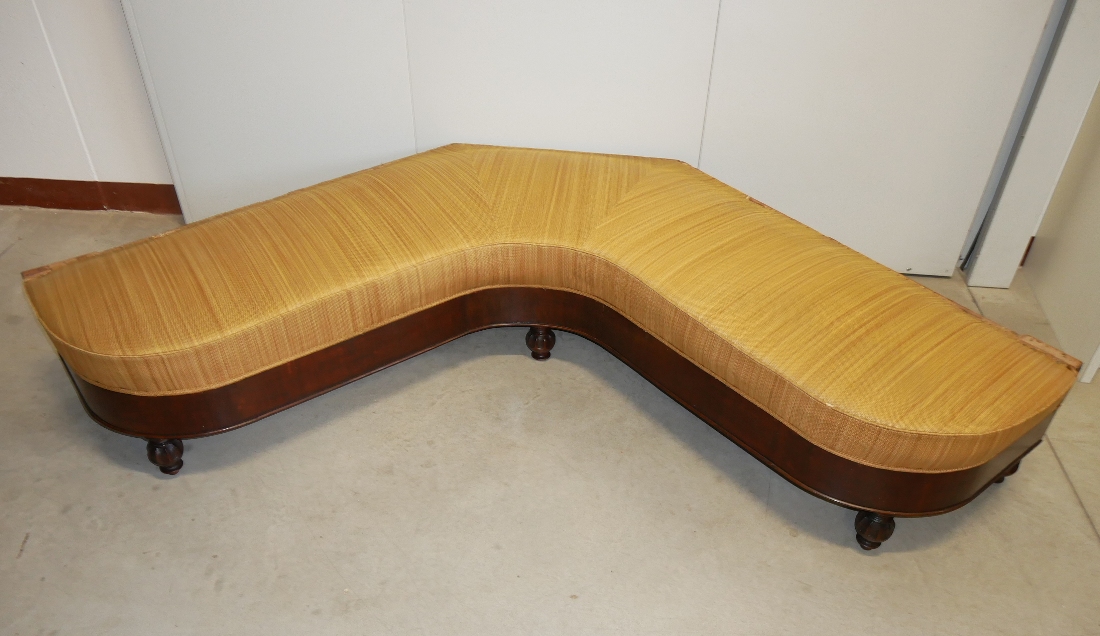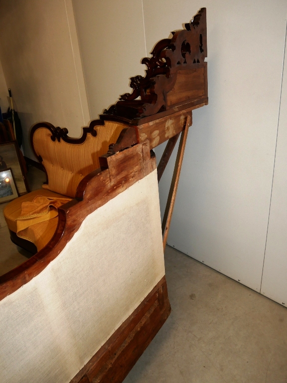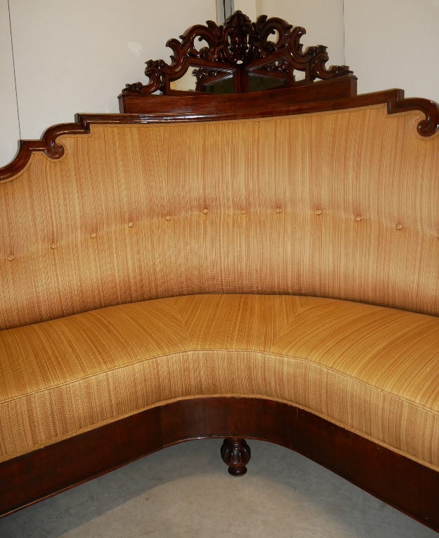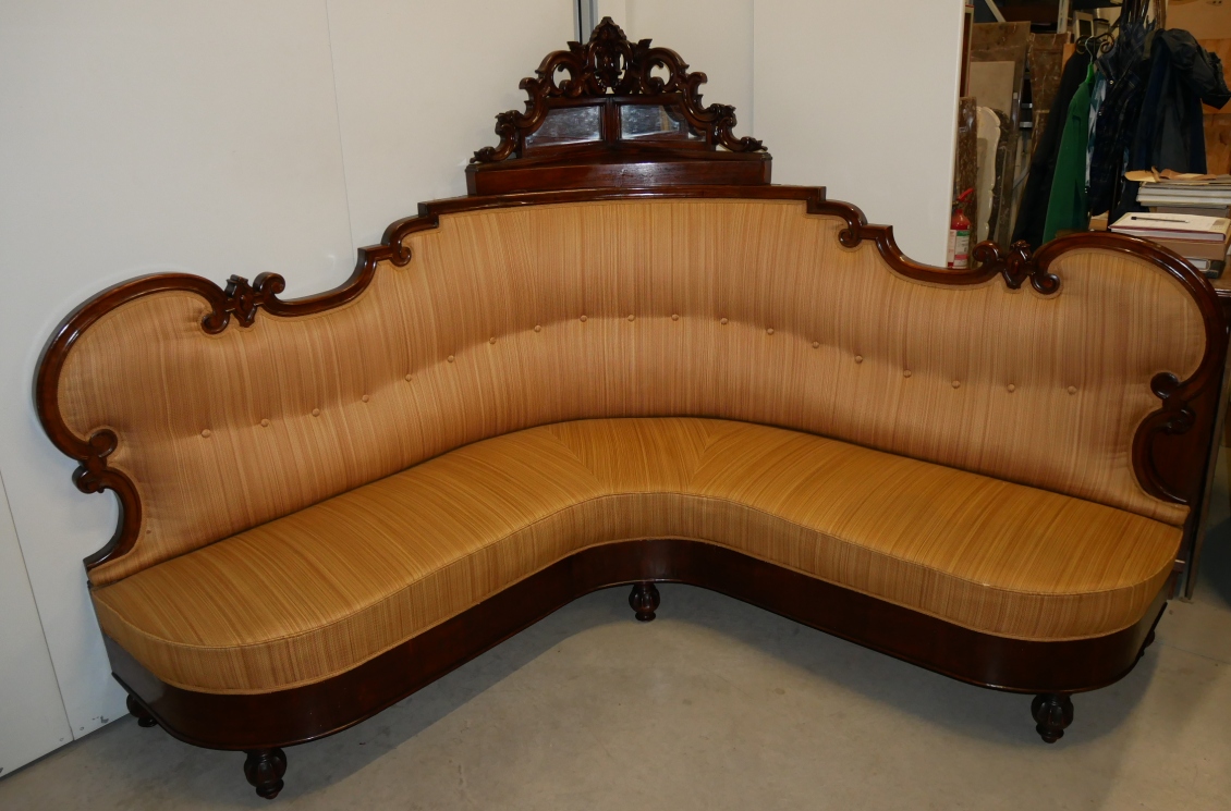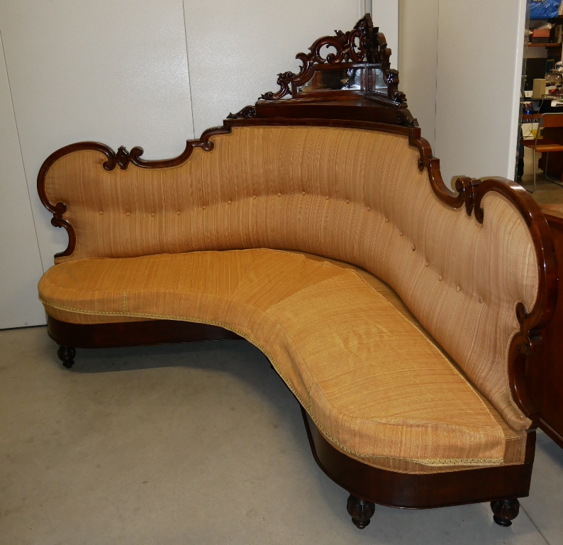 COD. 2688 Rare antique corner sofa with central frieze. Period: mid-1800s, Louis Philippe era. Solid walnut wood with veneered parts. Beautiful shaped backrest, with a shelf in the corner and carved frieze behind it. Each side at the back, overall size cm.175 Front cm.120 on the right, cm. 63 in the center and cm. 120 on the left. Depth on the sides cm. 60 approx. Seat height cm. 45. Max height in the center cm. 145 approx. It can be disassembled into various parts. The upholstered seat is a single piece. In good general condition, UNRESTORED Small losses, worn paint due to age. Upholstery in good condition with small somewhat worn parts. - Available for further photos and info - The color in the photos is not always the real one - Shipping with careful packaging - Viewing and collection on site is welcome - Possibility to rent the item The items can be viewed and collected at our warehouse. IF YOU WANT TO BUY, GO TO THE CART OF WWW.ANTIQUARIEIN.COM COD. 2688