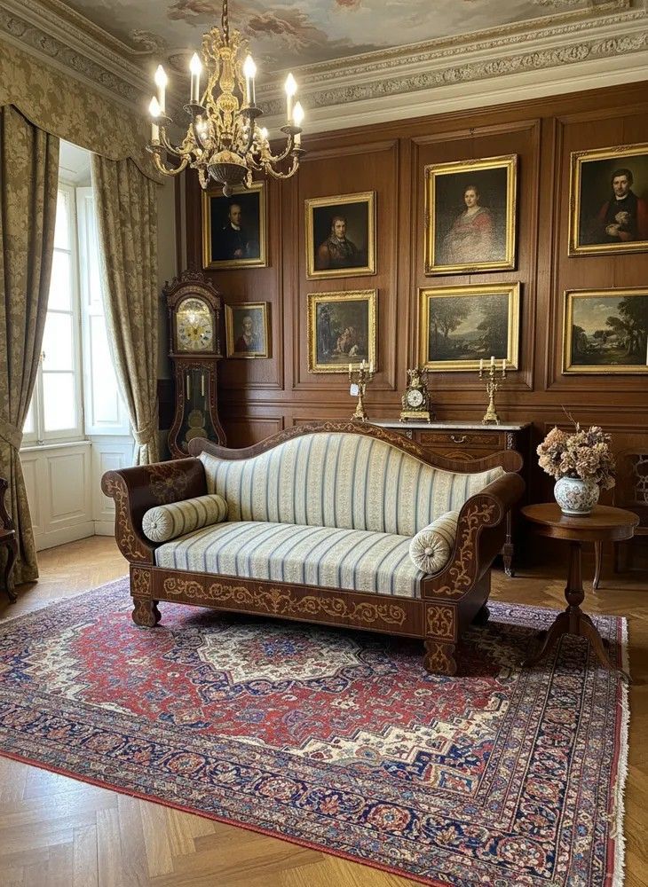 Un capolavoro dell'ebanisteria ottocentesca, questo divano a barca Carlo X unisce la sobria eleganza neoclassica alle nuove linee morbide che introdurranno lo stile Luigi Filippo. La struttura, lunga 210 cm, è realizzata in un ricco palissandro la cui venatura calda dialoga con la preziosa intarsia a volute fogliate in legno chiaro che corre su braccioli, fascione e piedi a mensola. Il profilo mosso dello schienale ricorda la chiglia di una barca, da cui l'appellativo, e garantisce una seduta avvolgente e scenografica.Il rivestimento è stato rinnovato con una sontuosa stoffa damascata a righe nei toni celeste, avorio e oro, arricchita da due rulli coordinati rifiniti con rosetta centrale; il risultato è una combinazione cromatica luminosa che esalta la finezza delle intarsiature.Epoca: metà XIX secolo (1850 ca.)Stile: Carlo XDimensioni: H 105 cm × L 210 cm × P 63 cmMateriali: palissandro, intarsi in acero e bosso, imbottitura in crine, tappezzeria in stoffaCondizioni: restaurato, pronto per l'usoIdeale per:un salone nobiliare o una residenza d'epocaun hotel di charme che voglia offrire un accento musealescenografie cinematografiche o shooting fotografici ambientati nell'OttocentoLa purezza delle forme Carlo X, l'equilibrio tra austerità e grazia floreale e la qualità dei materiali lo rendono un investimento di alto valore collezionistico, destinato a crescere nel tempo.Stile: Carlo X Materiale: LegnoAltezza (cm): 105Larghezza (cm): 210Profondità (cm): 63Epoca: XIX Secolo - 1800