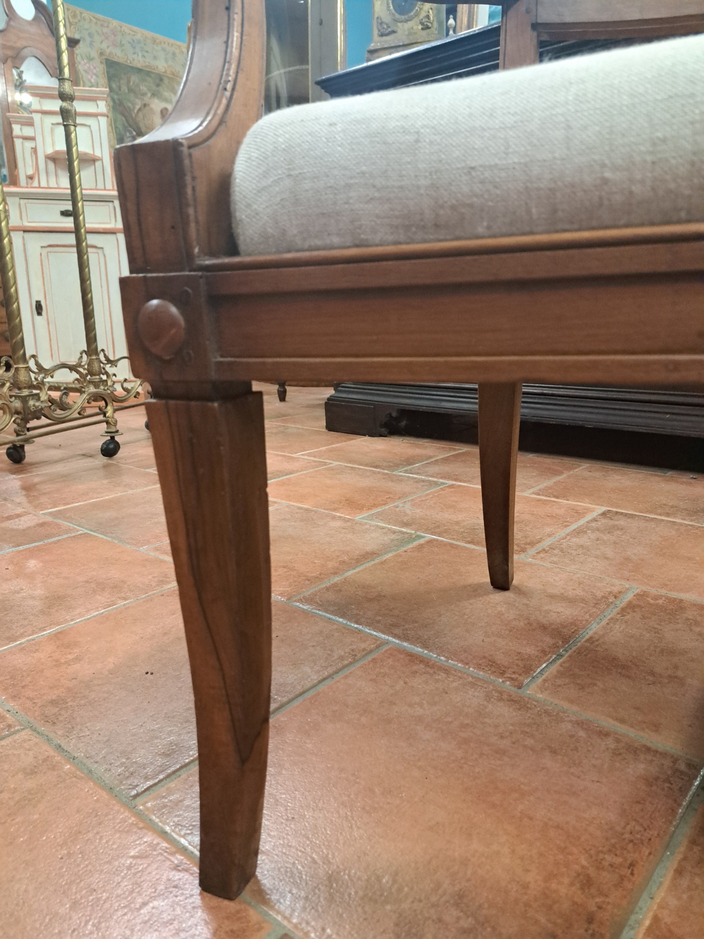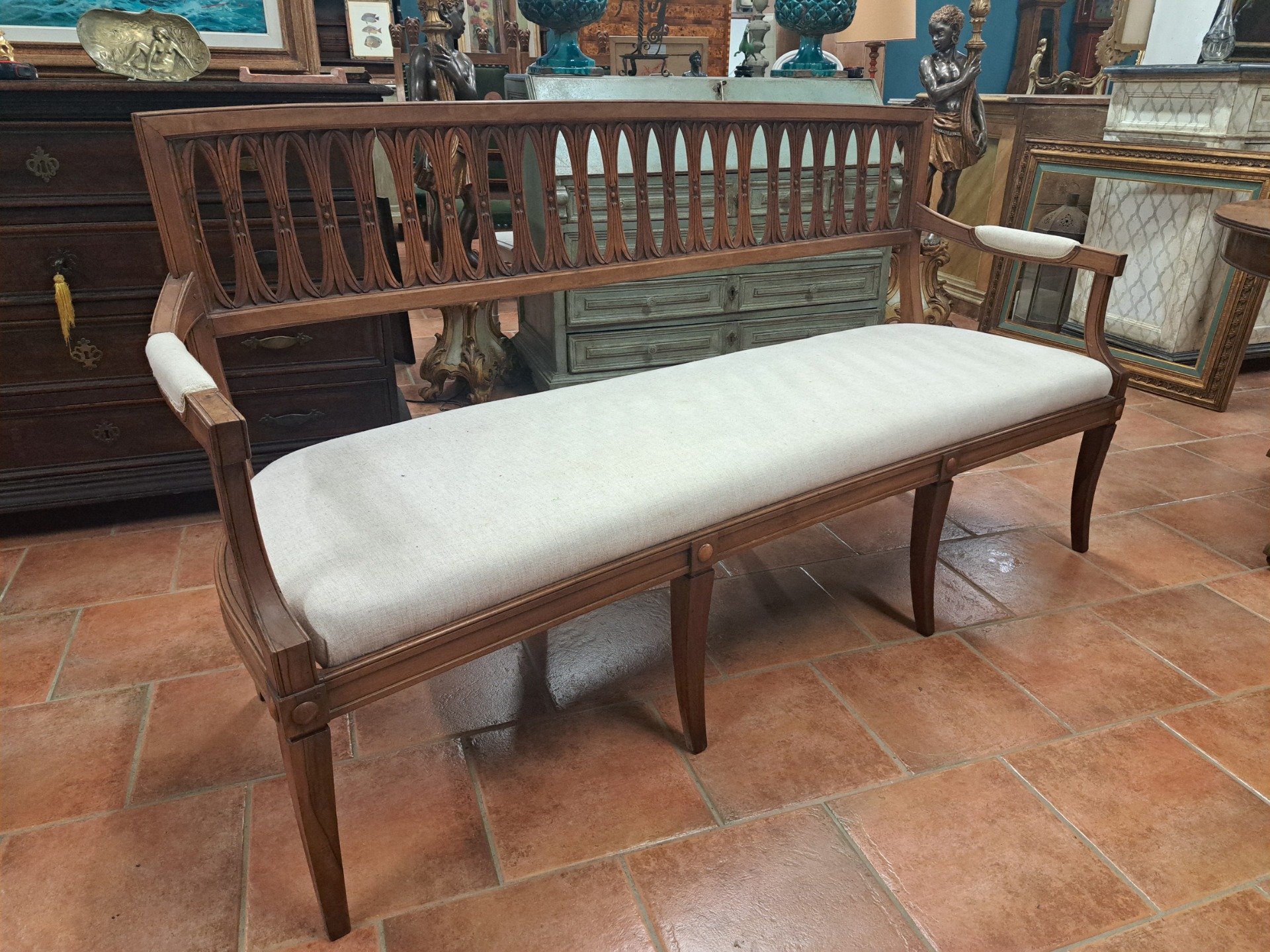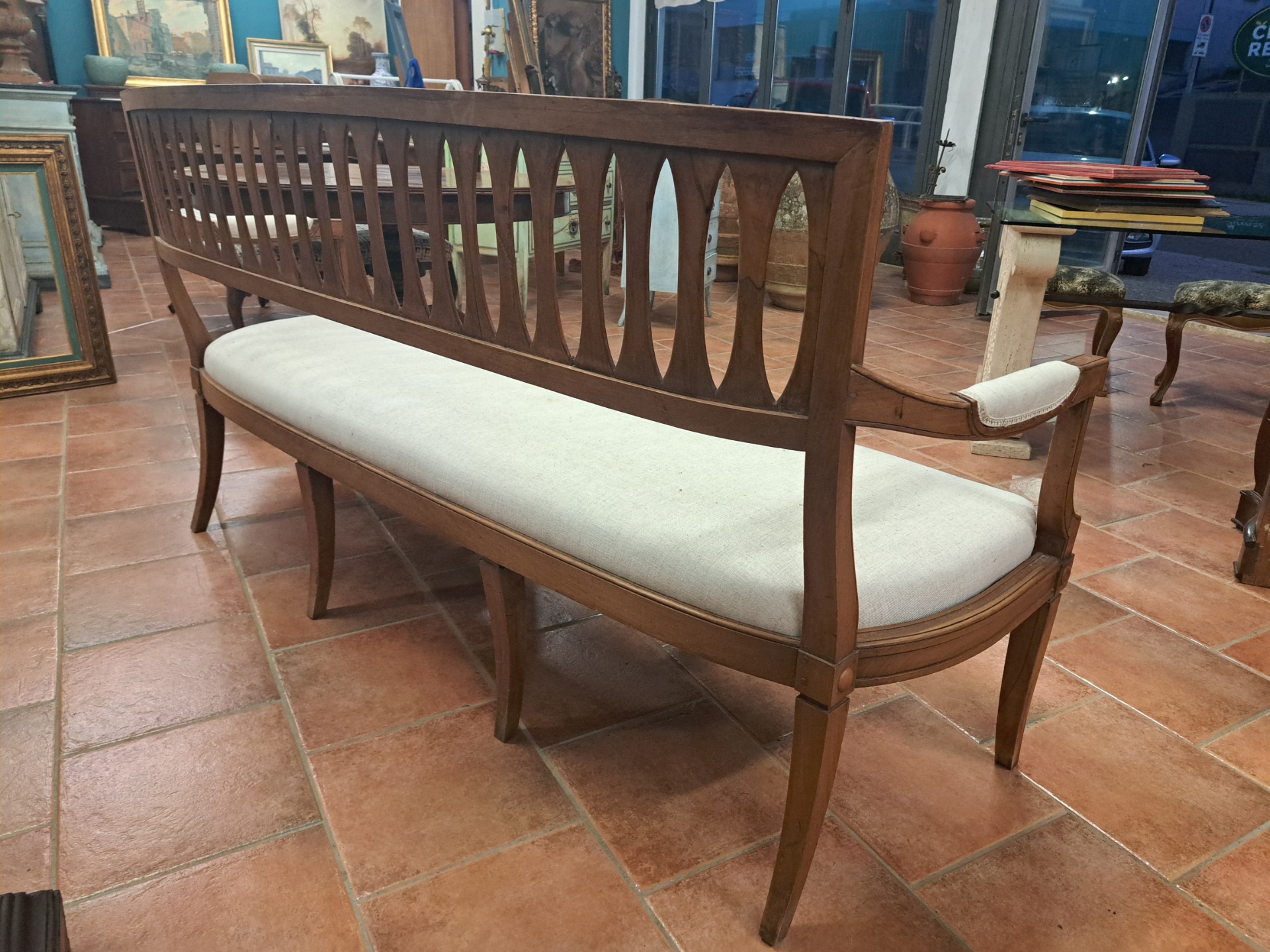 Bellissimo divano in stile Neoclassico in noce dalle tipiche linee sobrie ma caratterizzato da uno schienale scolpito in noce con motivo floreale molto particolare. Misure: 194 x 58, altezza 101