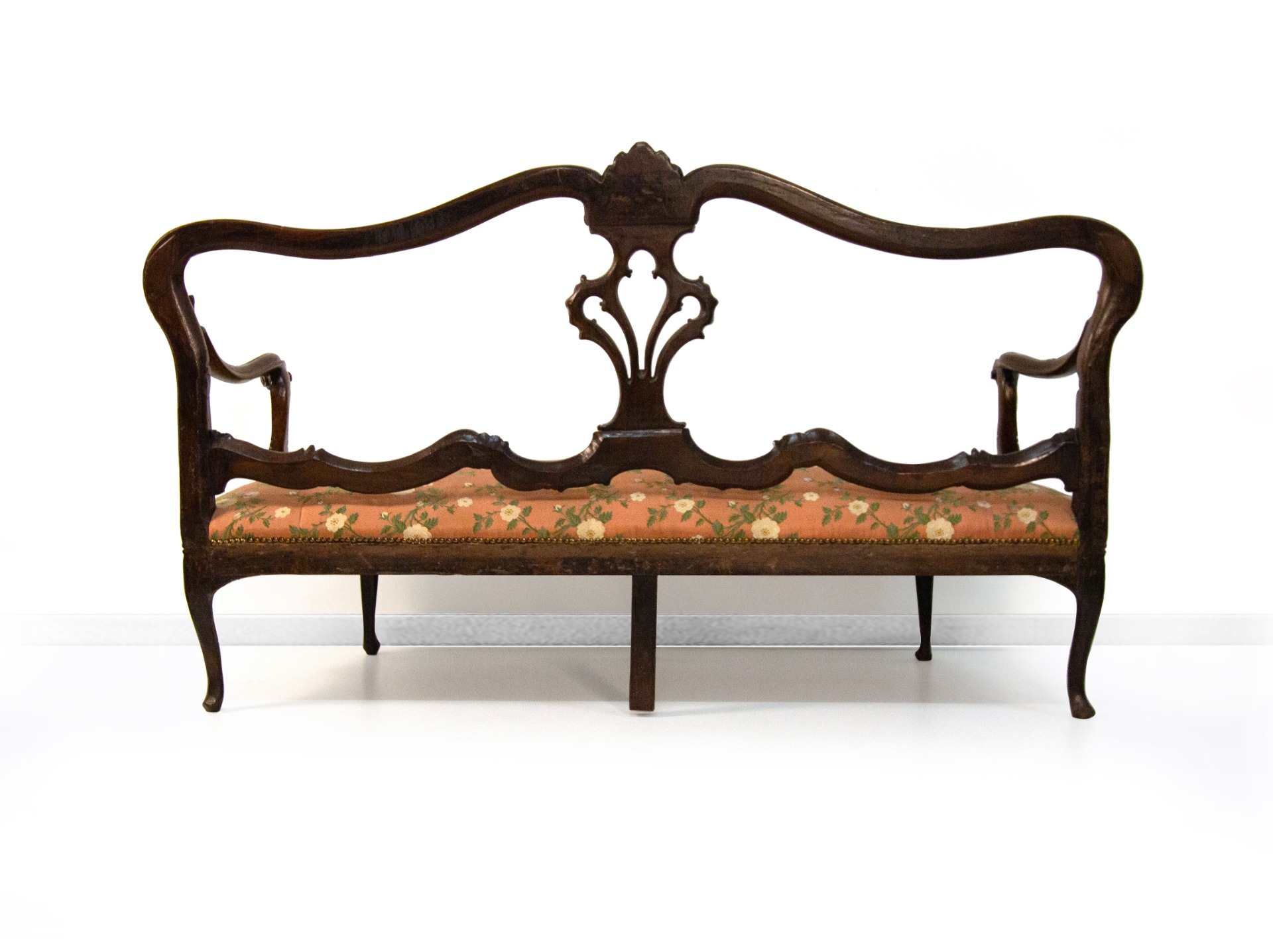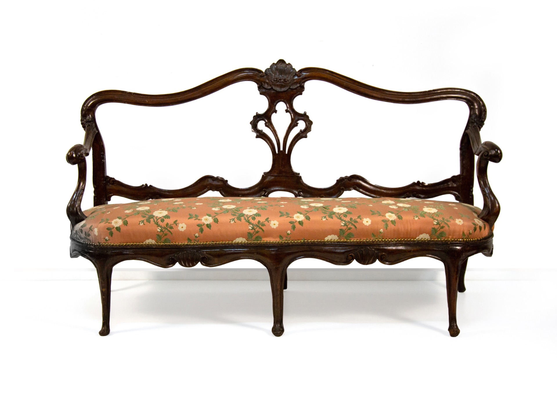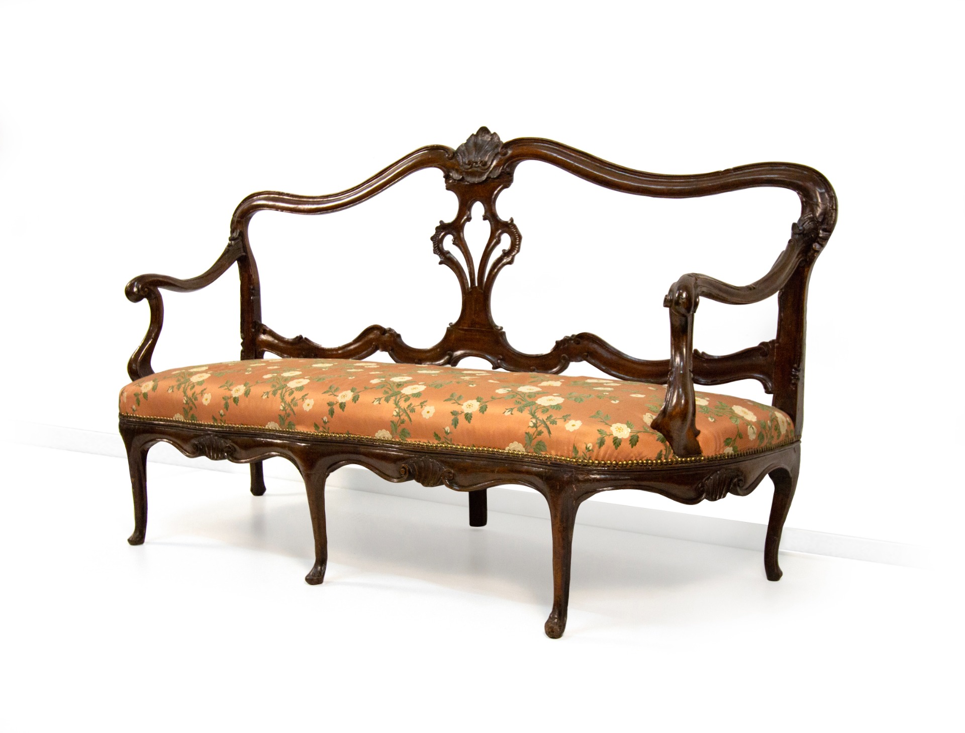 Walnut sofa, Veneto, 18th century, open back with a shaped profile centered by a carved folder; armrests on moving uprights, belt with volutes and slightly arched legs. Seat padded and covered in floral fabric on a pink background, cm 105x183x65