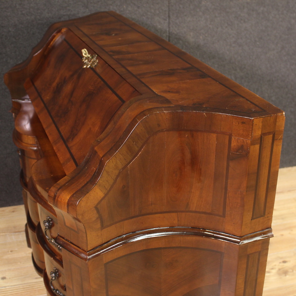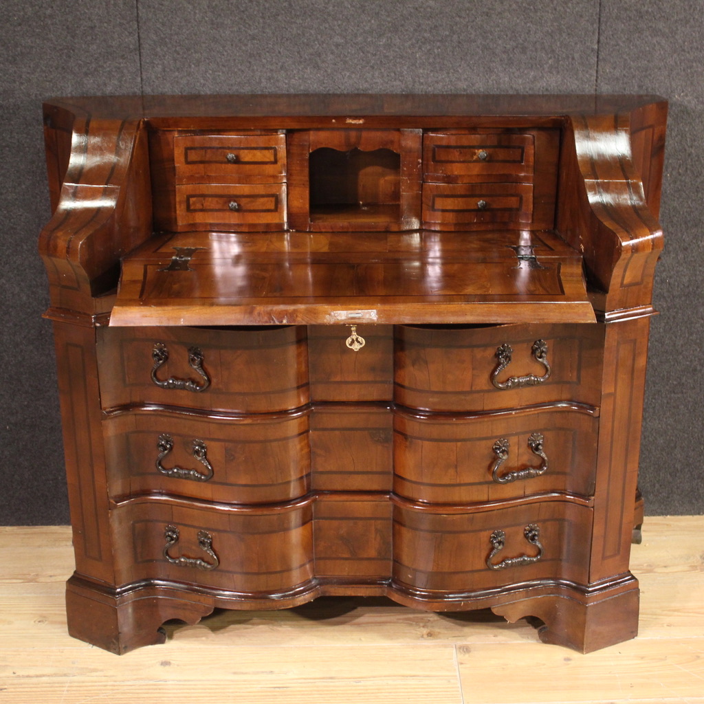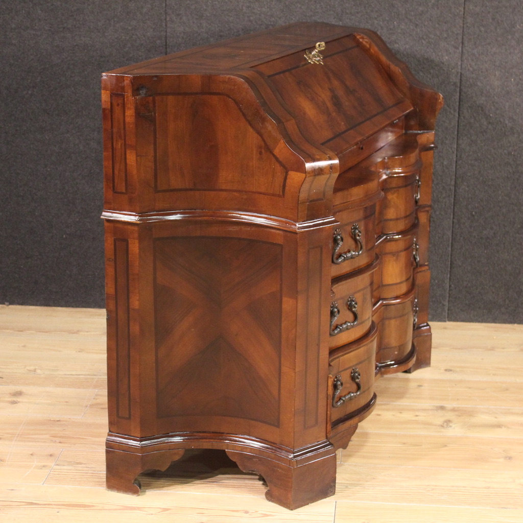 Venetian bureau from the mid-20th century. Furniture with a wavy front and sides, inlaid with walnut and mahogany wood, beautiful lines and pleasant furnishings. Bureau equipped with three large external drawers plus fall-front. The interior of the furniture is equipped with four small drawers, a central compartment for documents and a writing surface of good size and service. Desk for the living room or study, for antique dealers and interior decorators, of good size and great impact. Complete with a working key, it shows some signs of wear. Overall in good condition.