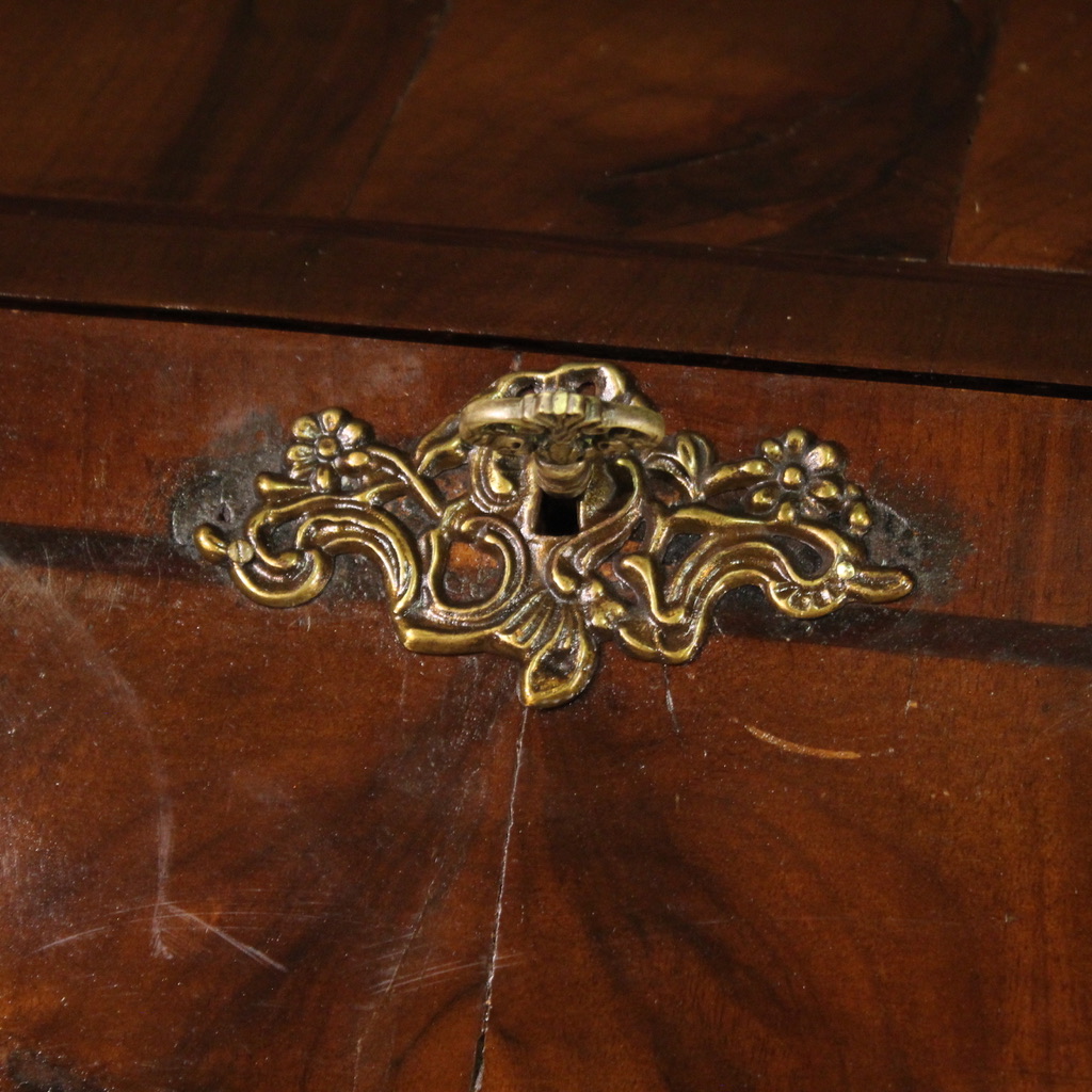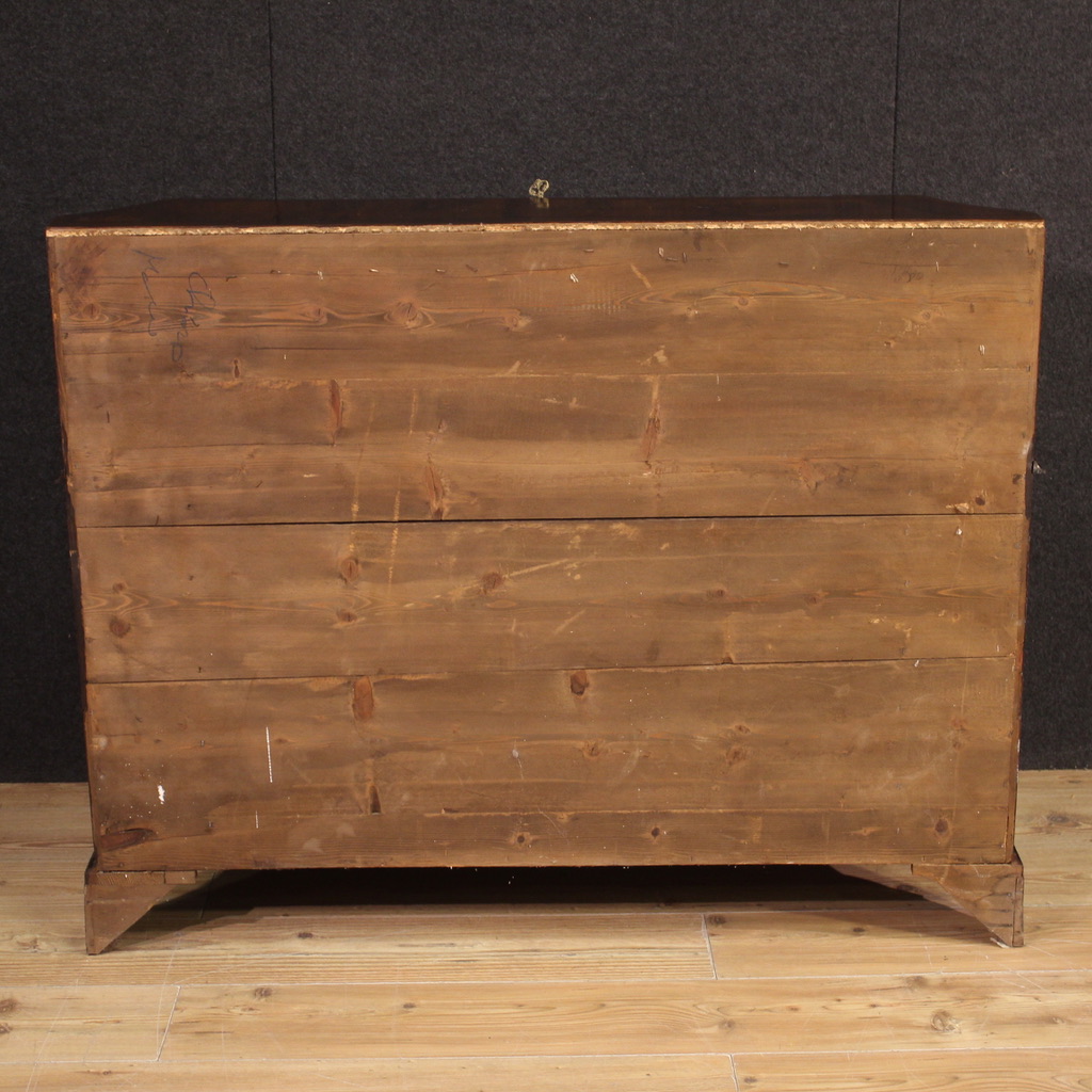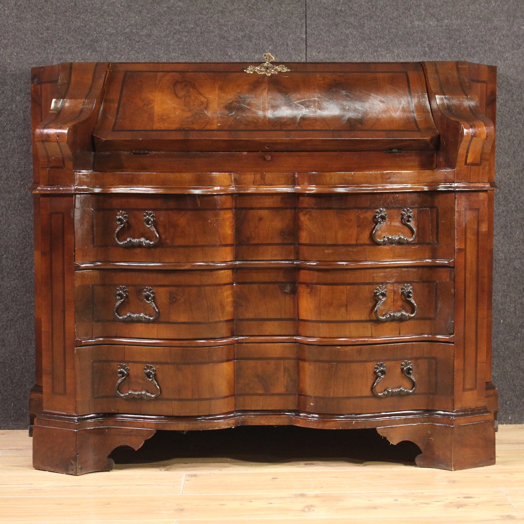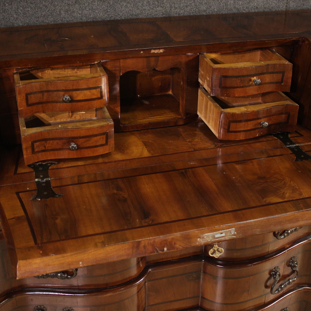 Venetian bureau from the mid-20th century. Furniture with a wavy front and sides, inlaid with walnut and mahogany wood, beautiful lines and pleasant furnishings. Bureau equipped with three large external drawers plus fall-front. The interior of the furniture is equipped with four small drawers, a central compartment for documents and a writing surface of good size and service. Desk for the living room or study, for antique dealers and interior decorators, of good size and great impact. Complete with a working key, it shows some signs of wear. Overall in good condition.