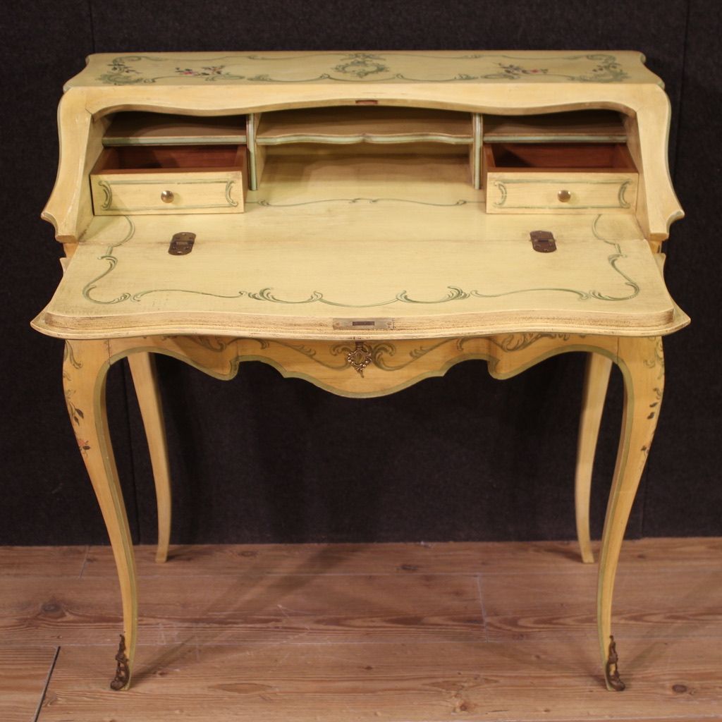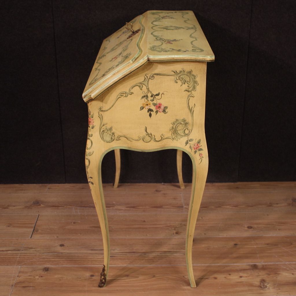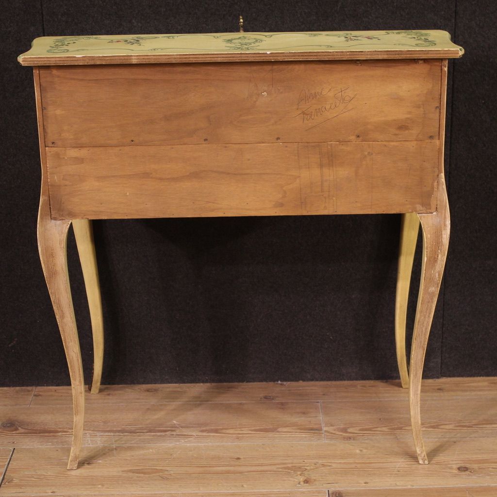 Venetian secretary desk from the second half of the 20th century. Beautifully crafted piece of furniture, pleasantly lacquered and hand-painted with floral decorations. High-legged secretary desk equipped with an external drawer plus a drop-front writing surface. Interior complete with two small drawers, four document compartments, and a decent-sized, serviceable writing surface (see photo). Furniture of excellent proportion, easily placed in various parts of the house, ideal for a bedroom or living room. In good condition, complete with a working key.