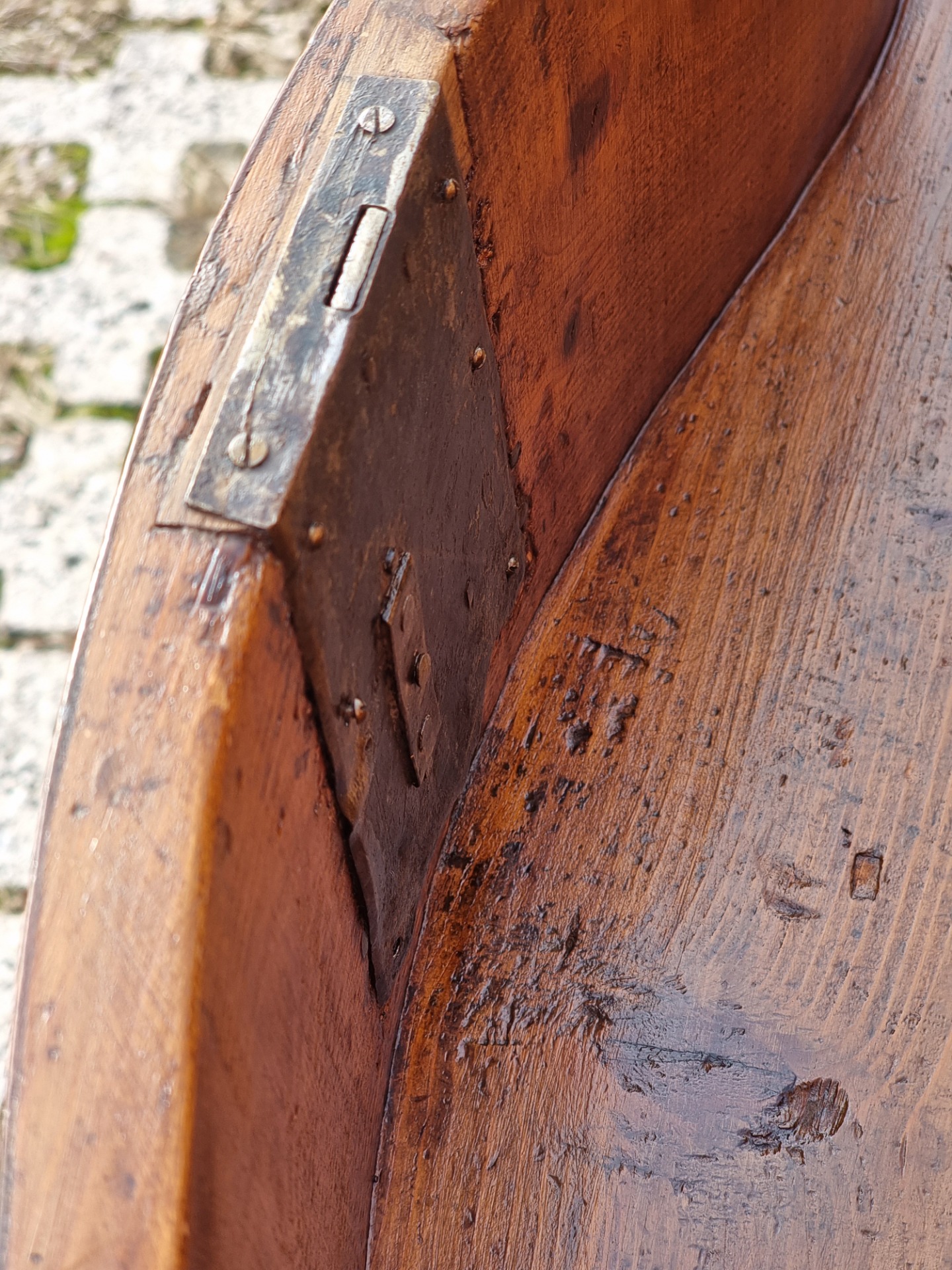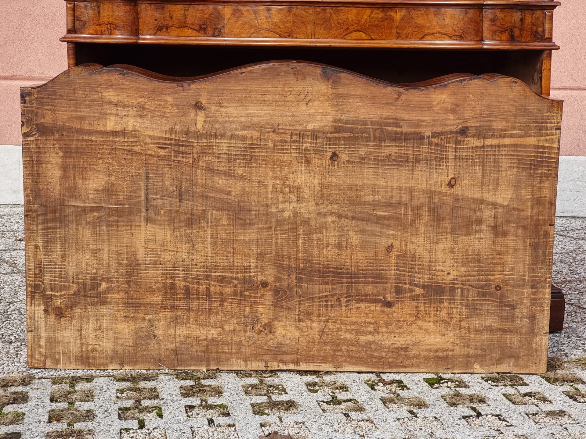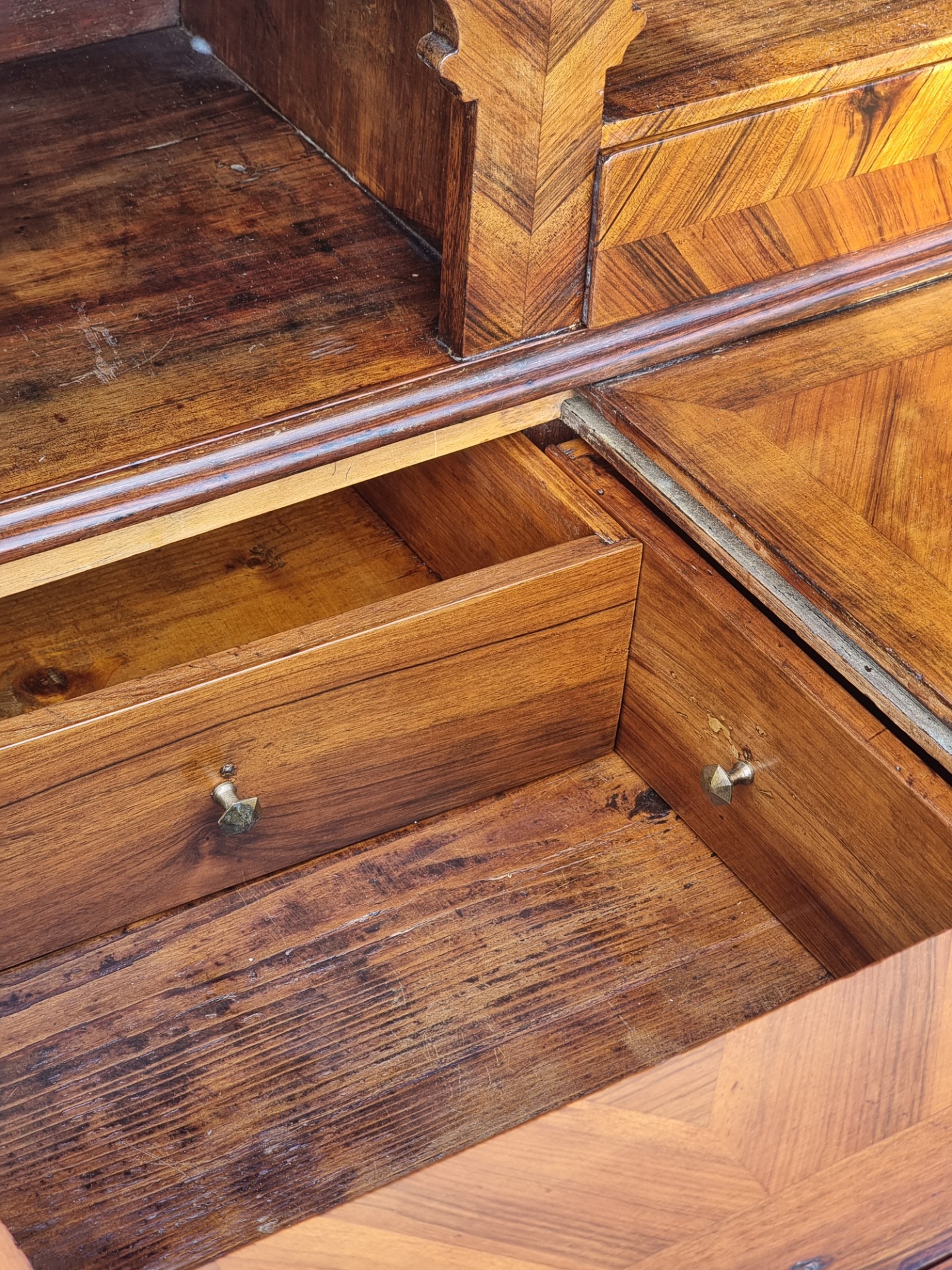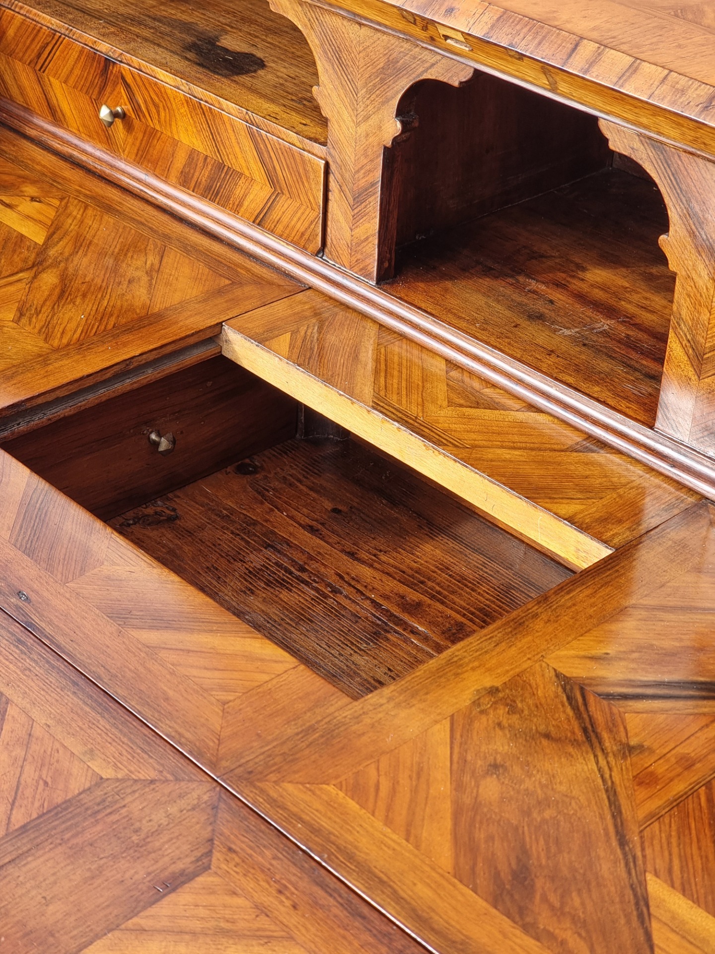 The drop-leaf top, also veneered and inlaid, conceals an architectural interior with two upper drawers and a central compartment. A perfectly functioning sliding panel gives access to a hidden compartment that houses six original secret drawers, made of walnut and still intact.