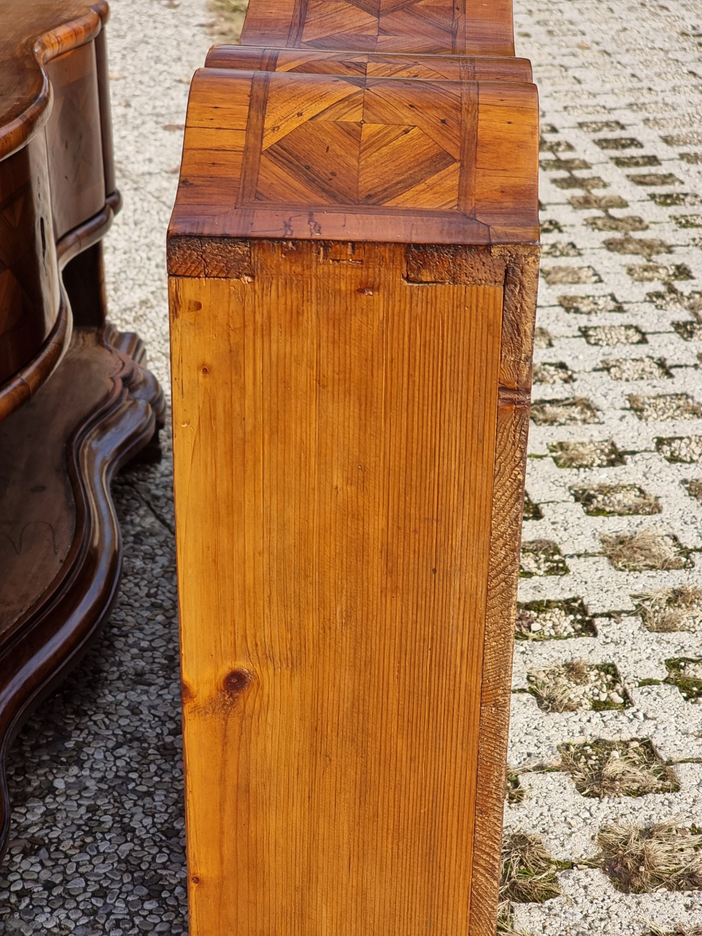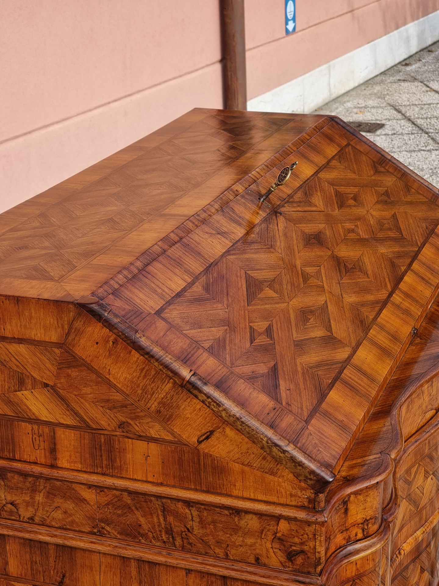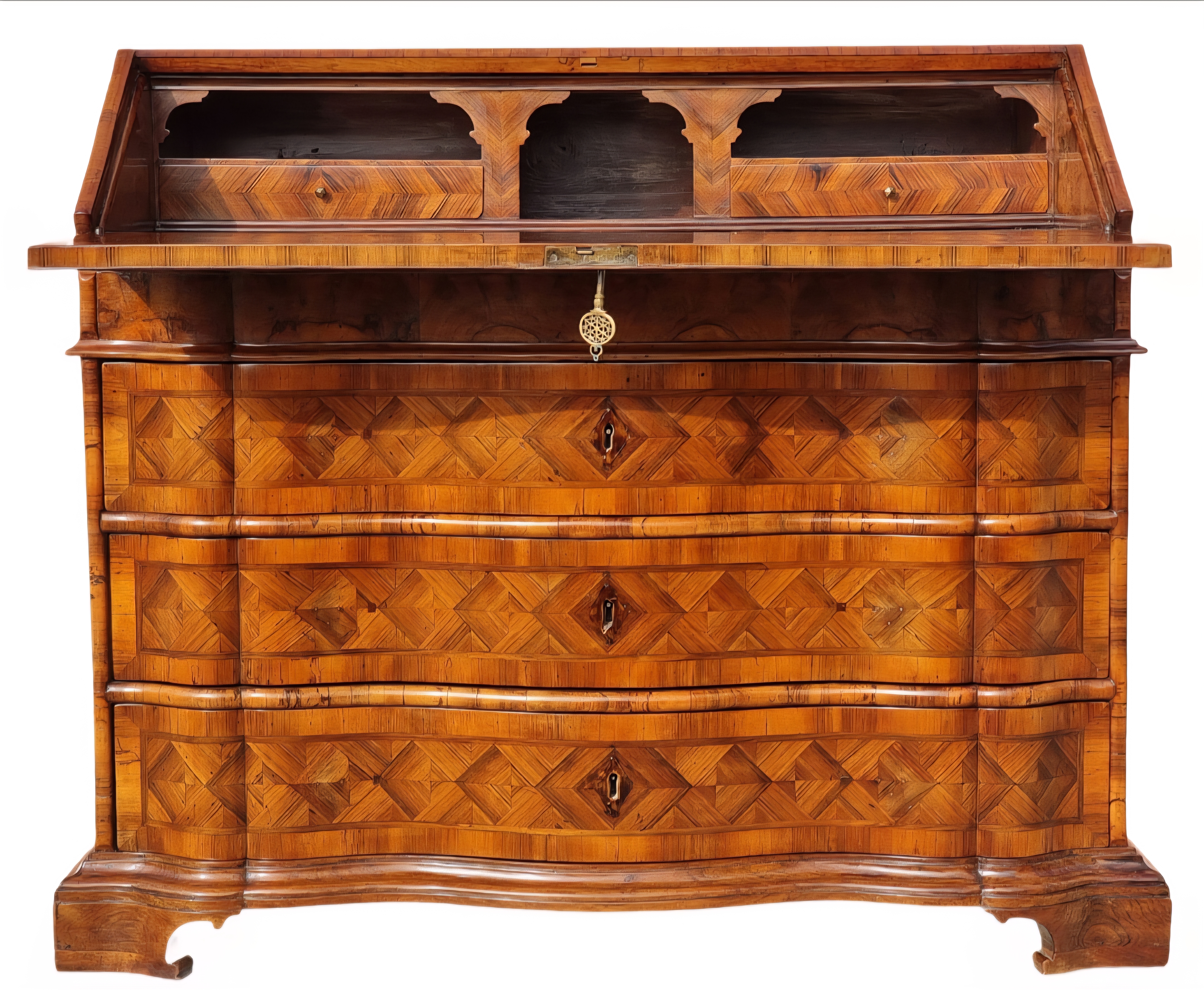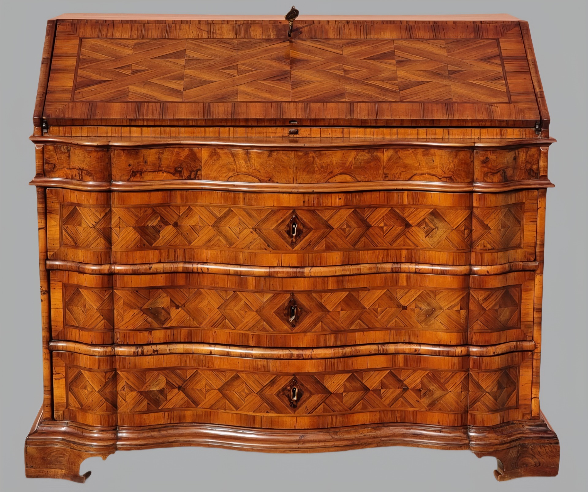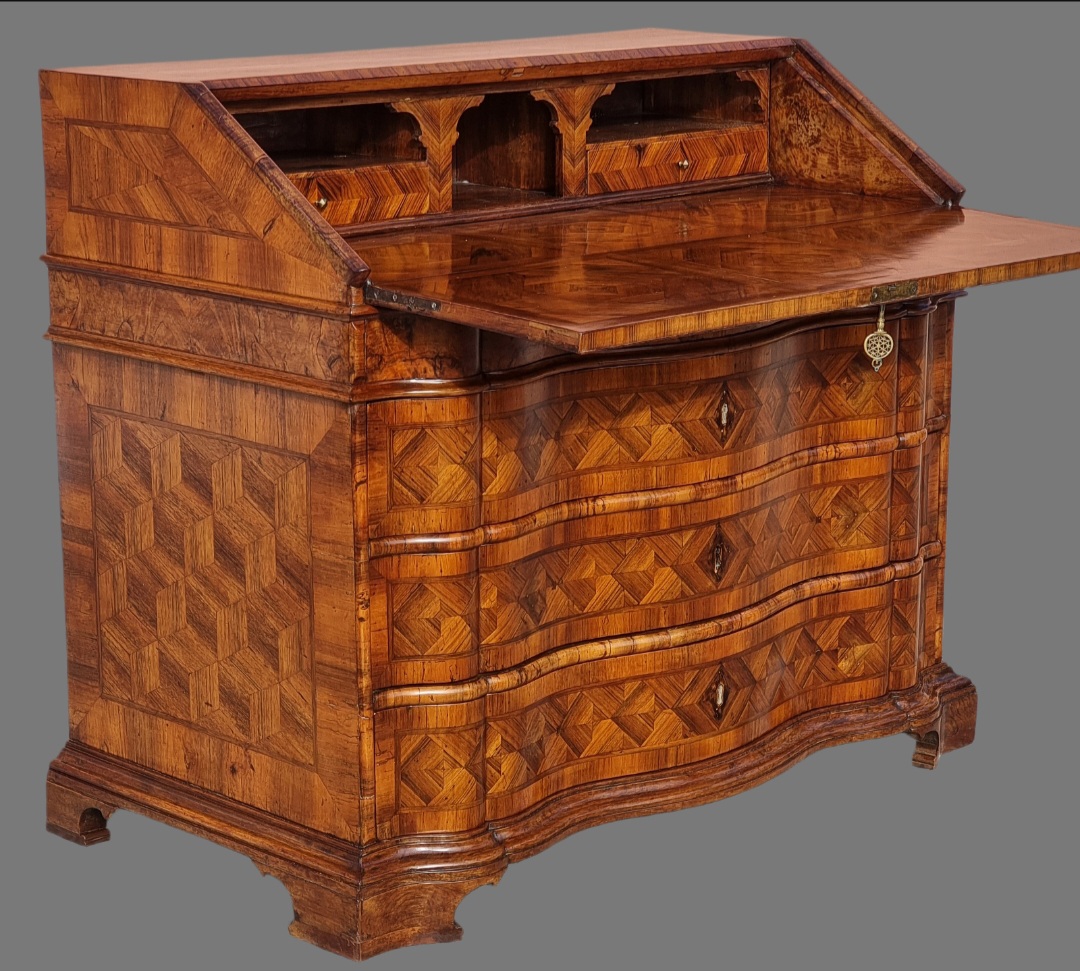 Elegant Venetian fall front desk from the first half of the 18th century, entirely veneered and inlaid in walnut and walnut burl, with refined continuous geometric patterns on the front and sides. The curved front features three large shaped drawers, enriched by an elaborate diamond and panel design, characteristic of quality Venetian production.