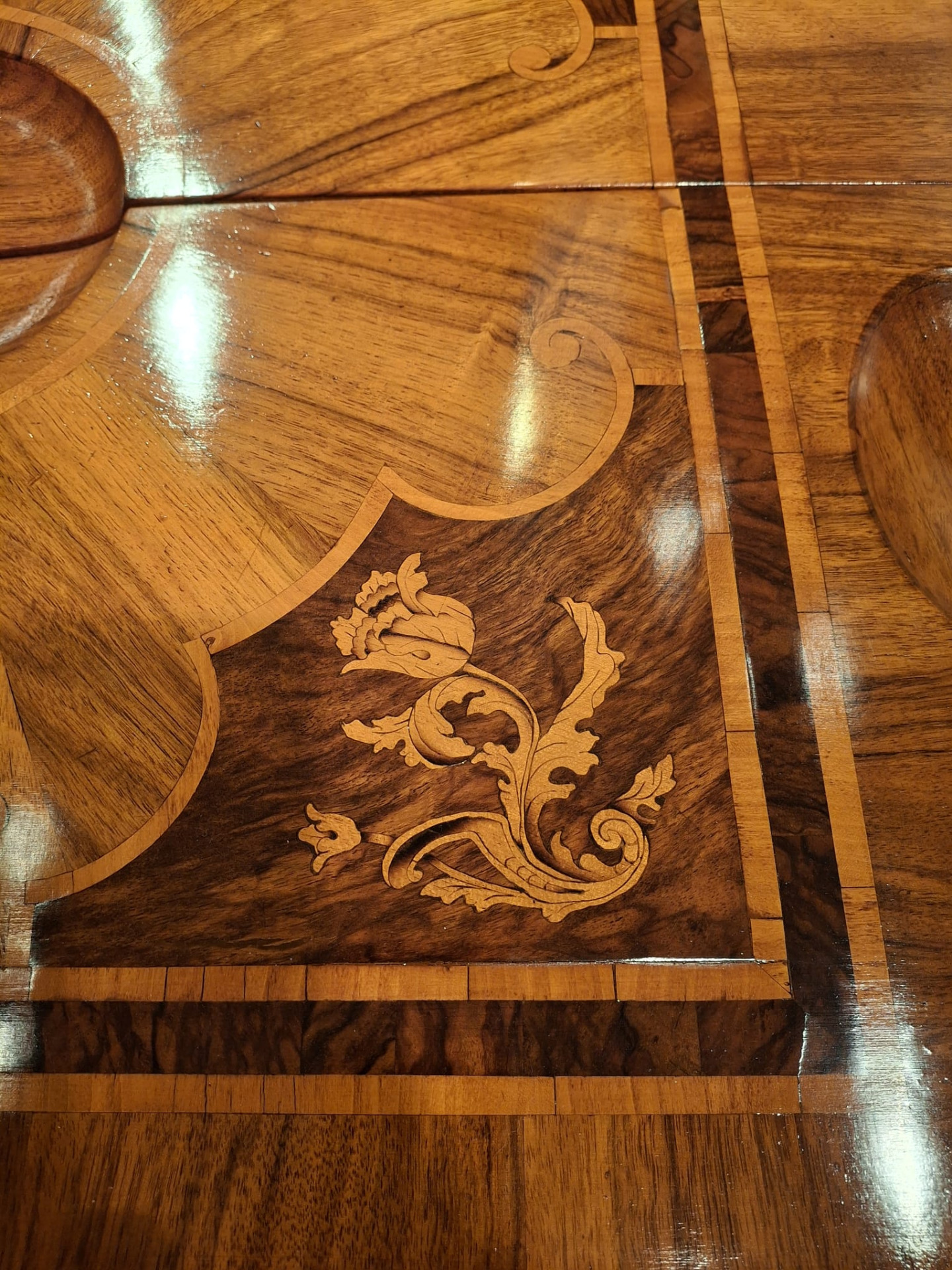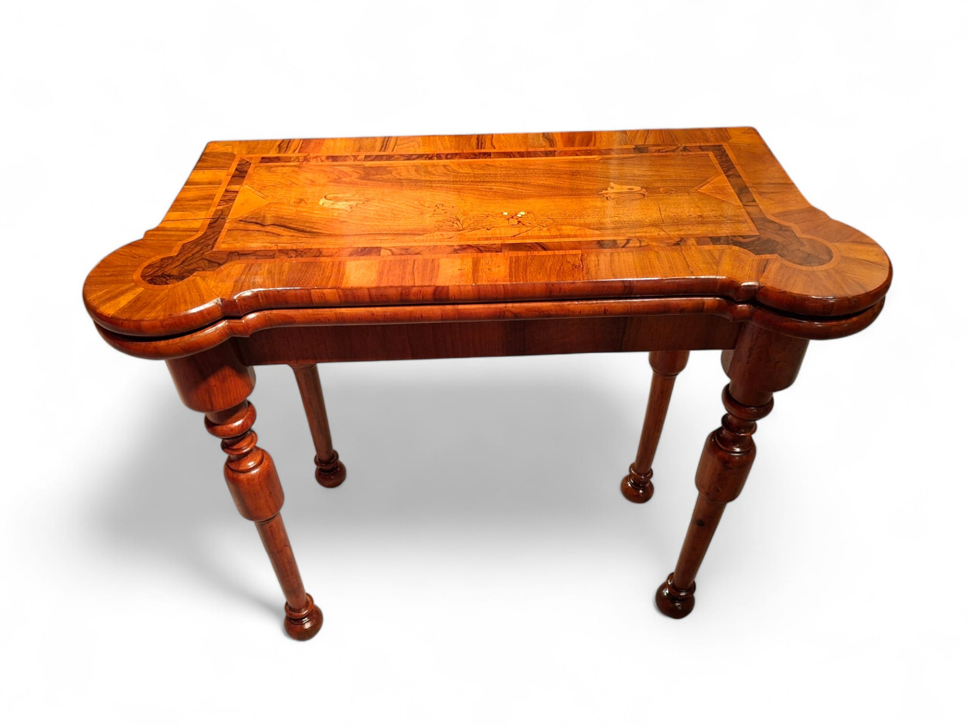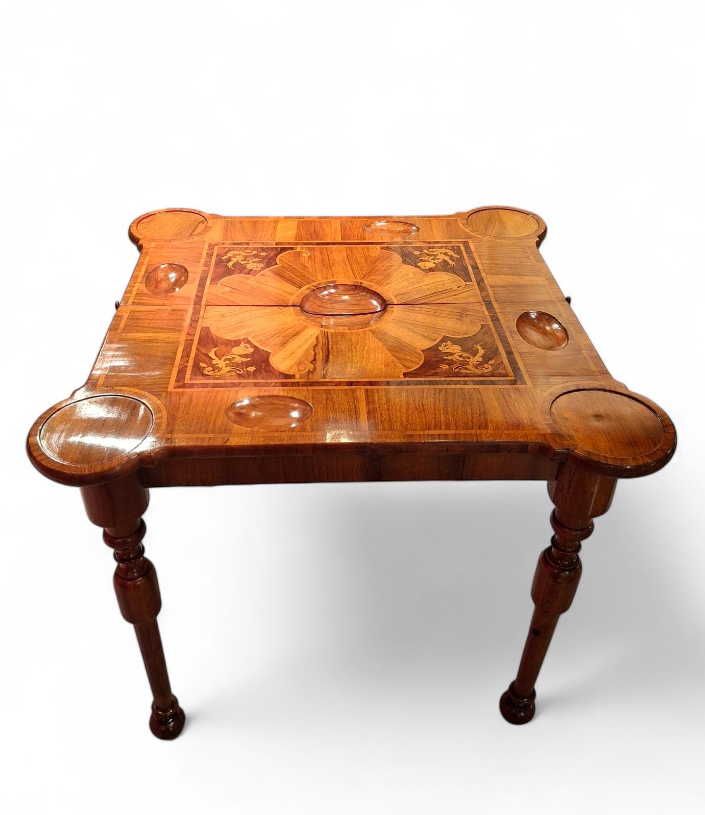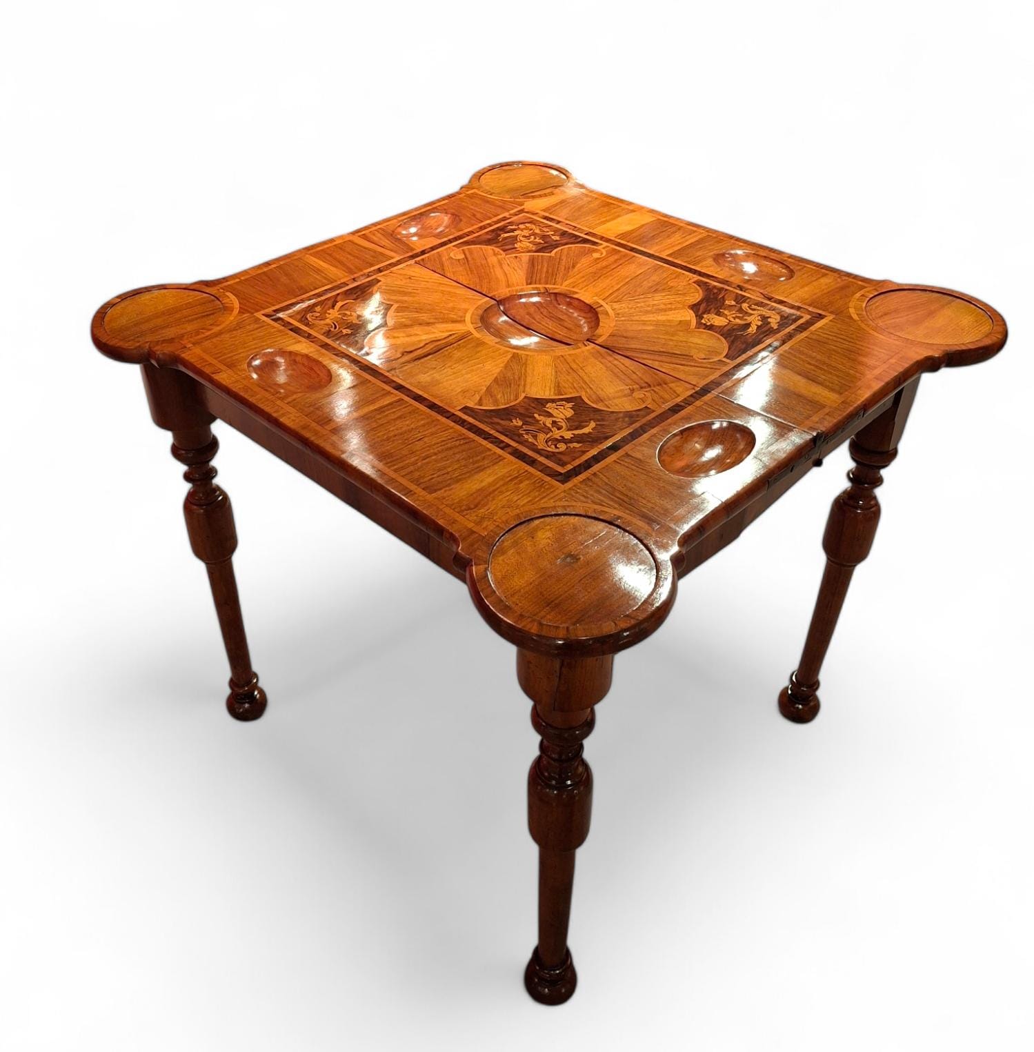 Louis XV game table, veneered and finely inlaid wood, Venetian cabinetmaking, 18th century, very good condition, maximum dimensions of the open table 88.5x84 cm, height 74 cm.