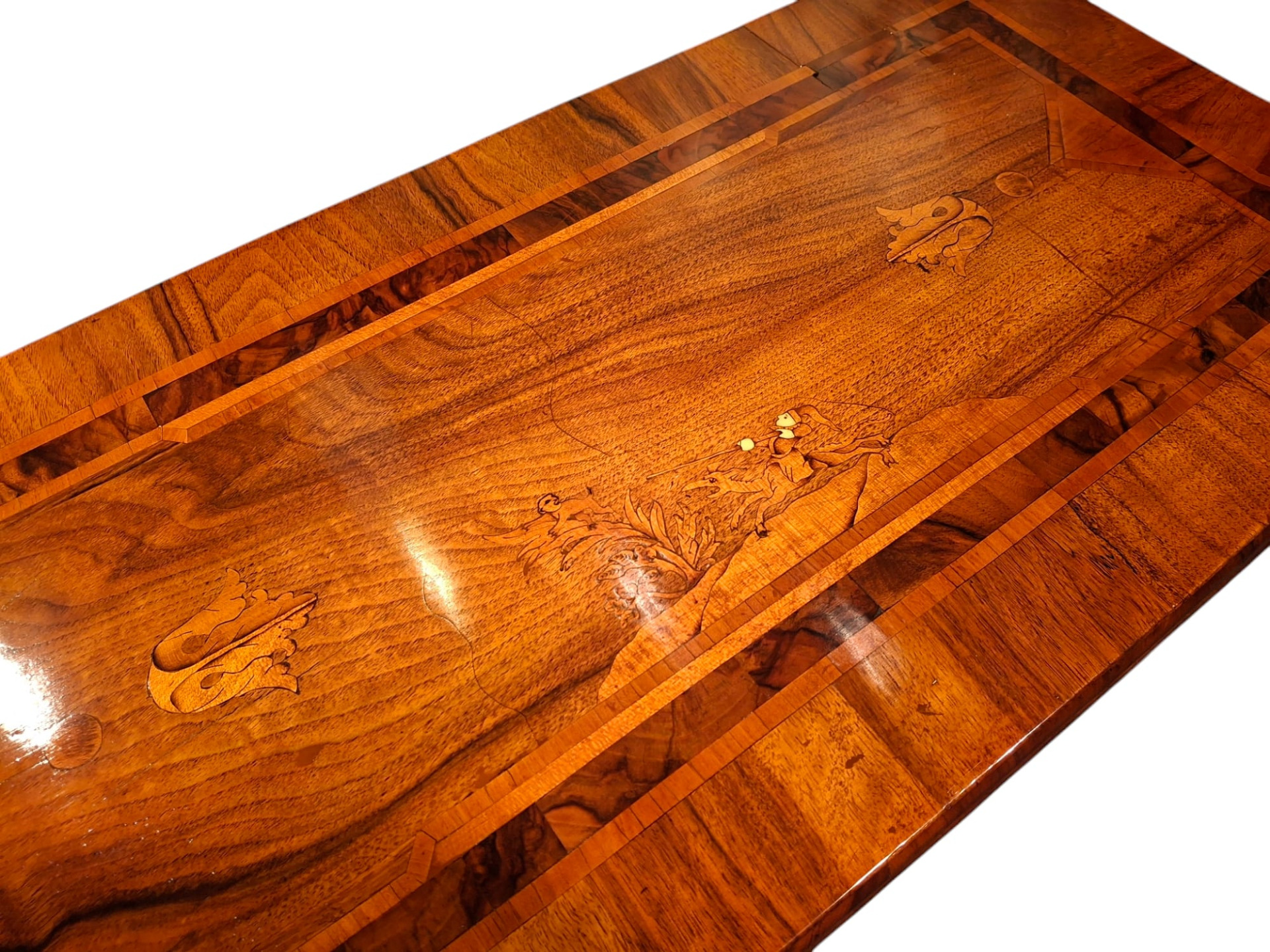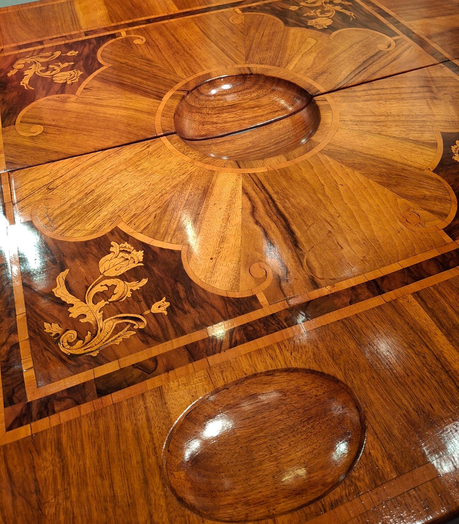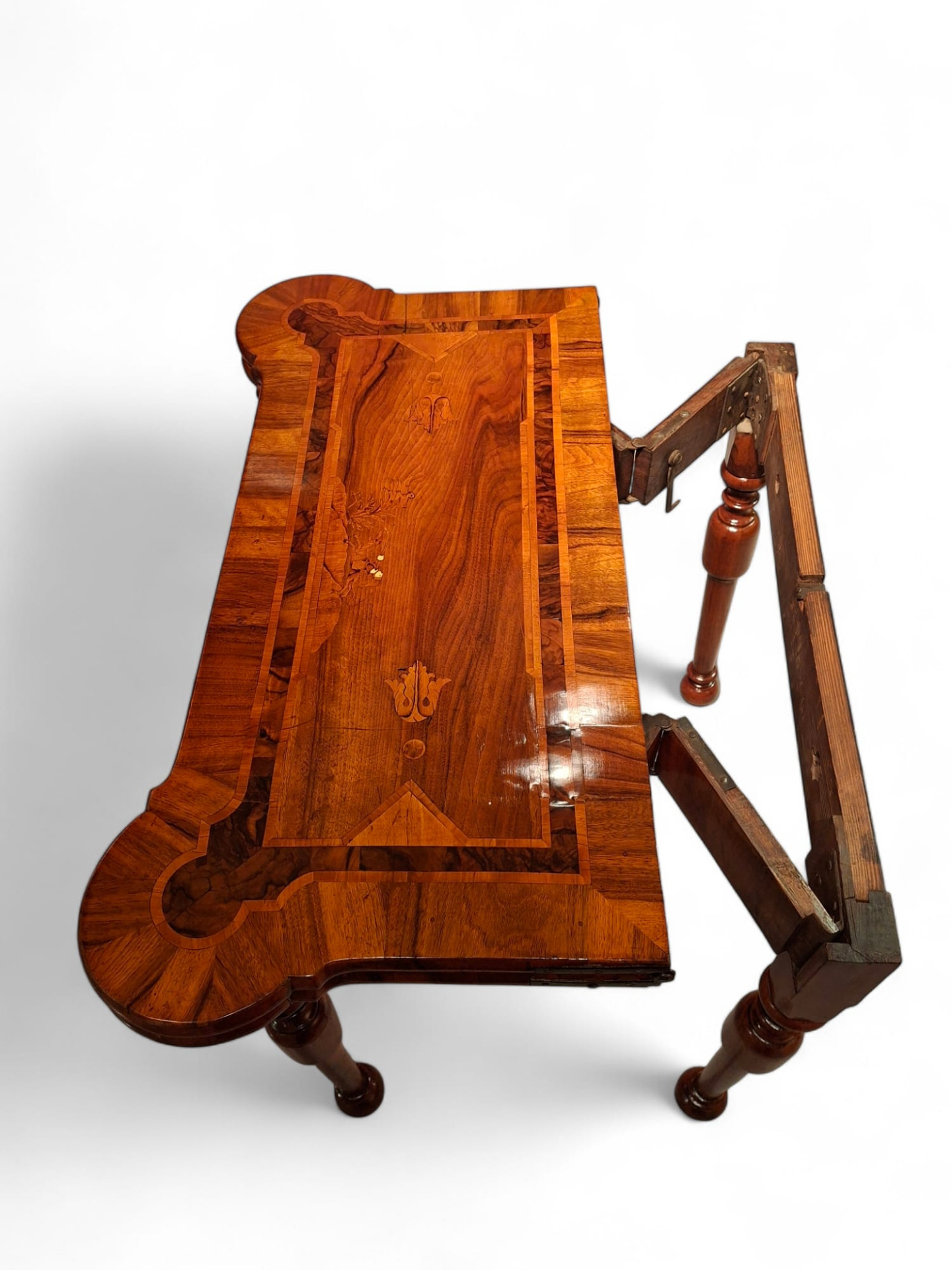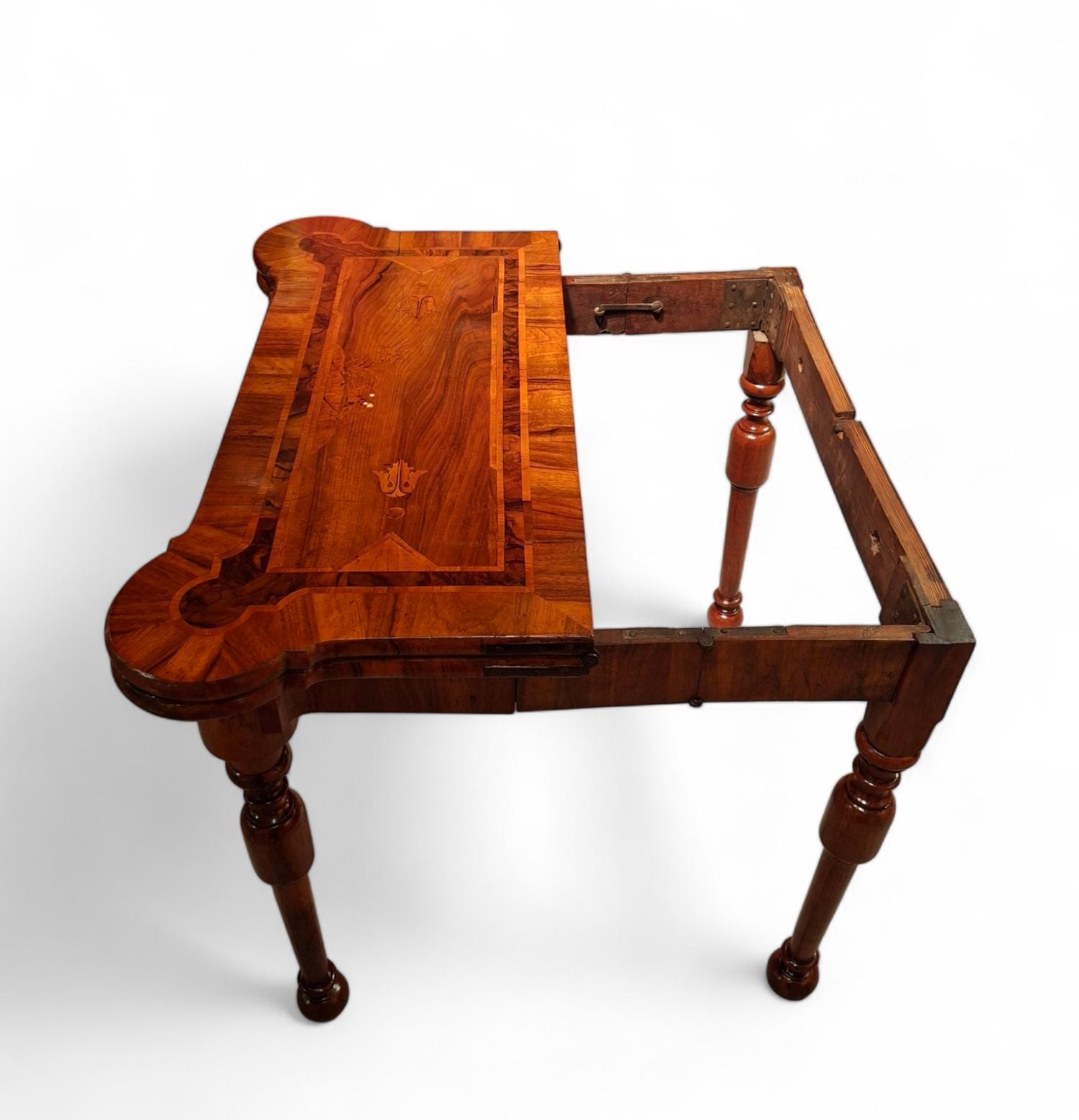 Louis XV game table, veneered and finely inlaid wood, Venetian cabinetmaking, 18th century, very good condition, maximum dimensions of the open table 88.5x84 cm, height 74 cm.