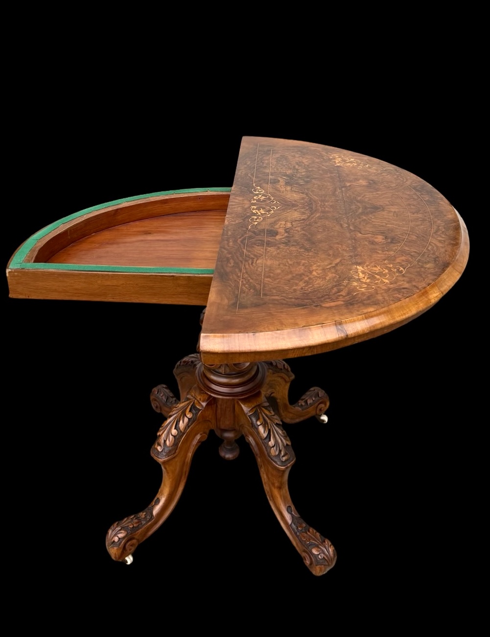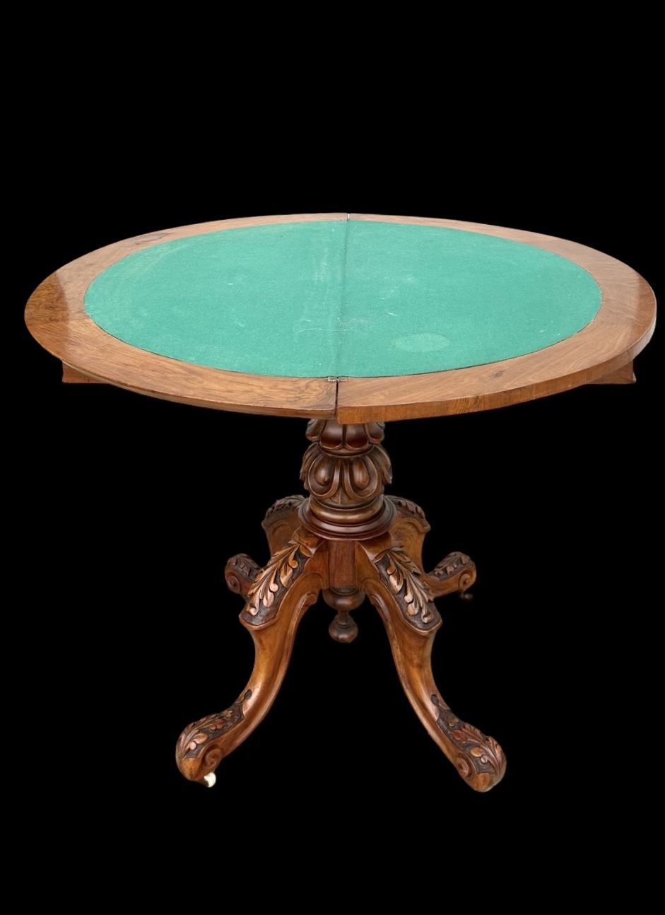Walnut veneer burr game console table with floral inlay. Rotating split top with internal drawer. Leg with four feet. Cm 46 (92 open). H: cm 74
