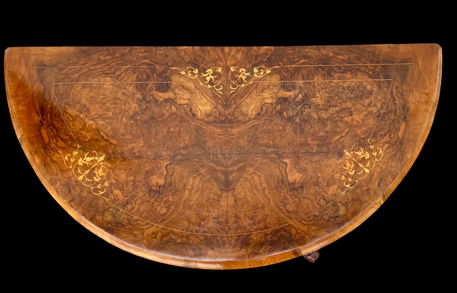 Walnut veneer burr game console table with inlay.