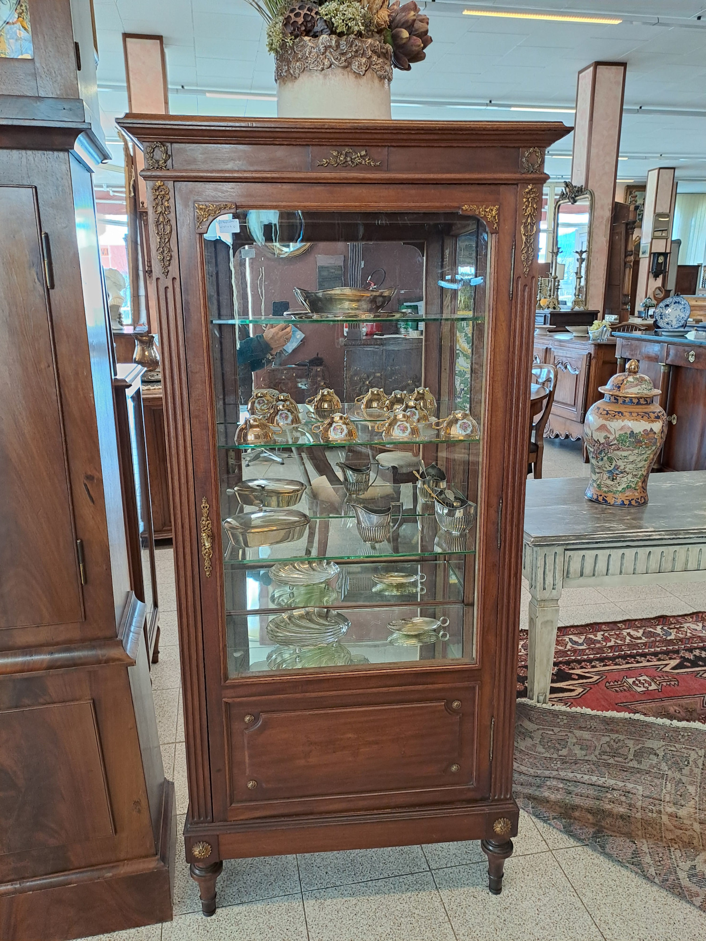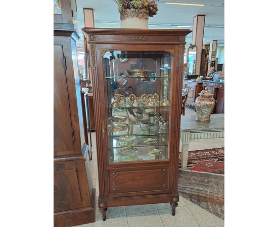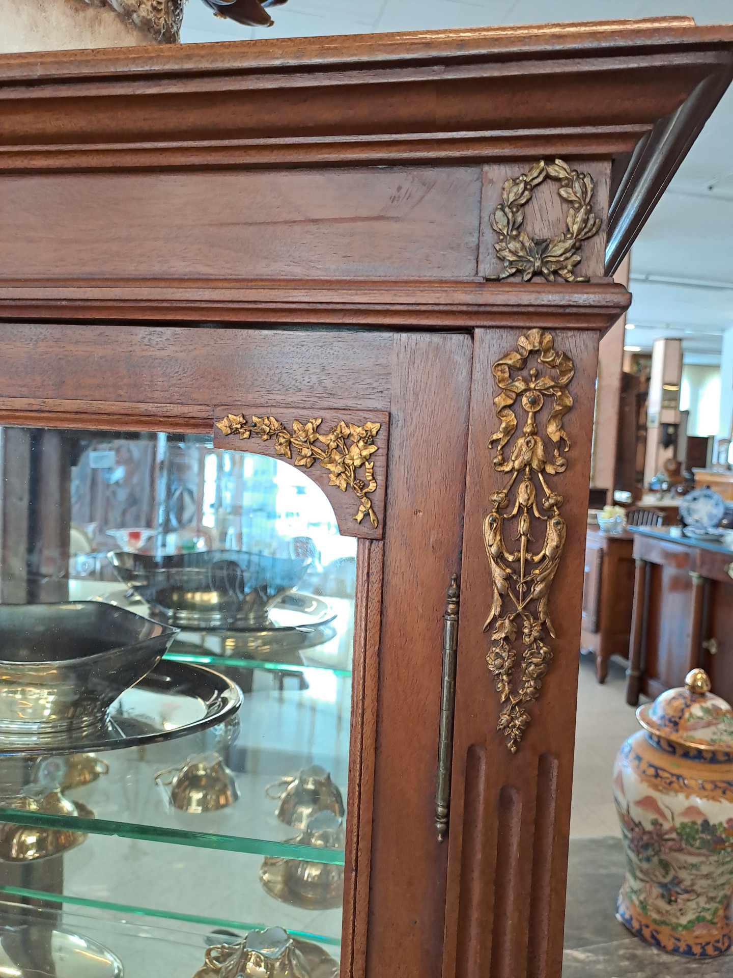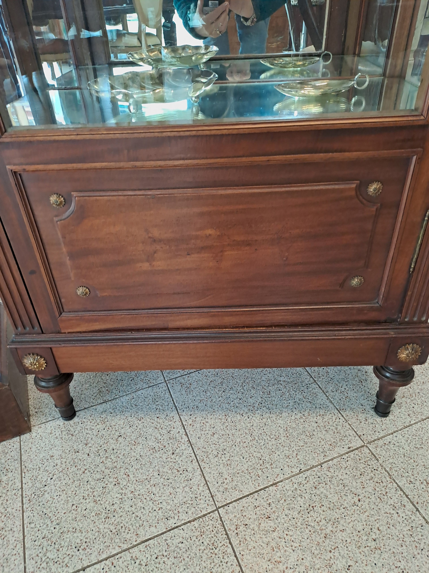 Inside, it has 3 glass shelves, one mirror shelf, and a small wooden shelf in the lower part.