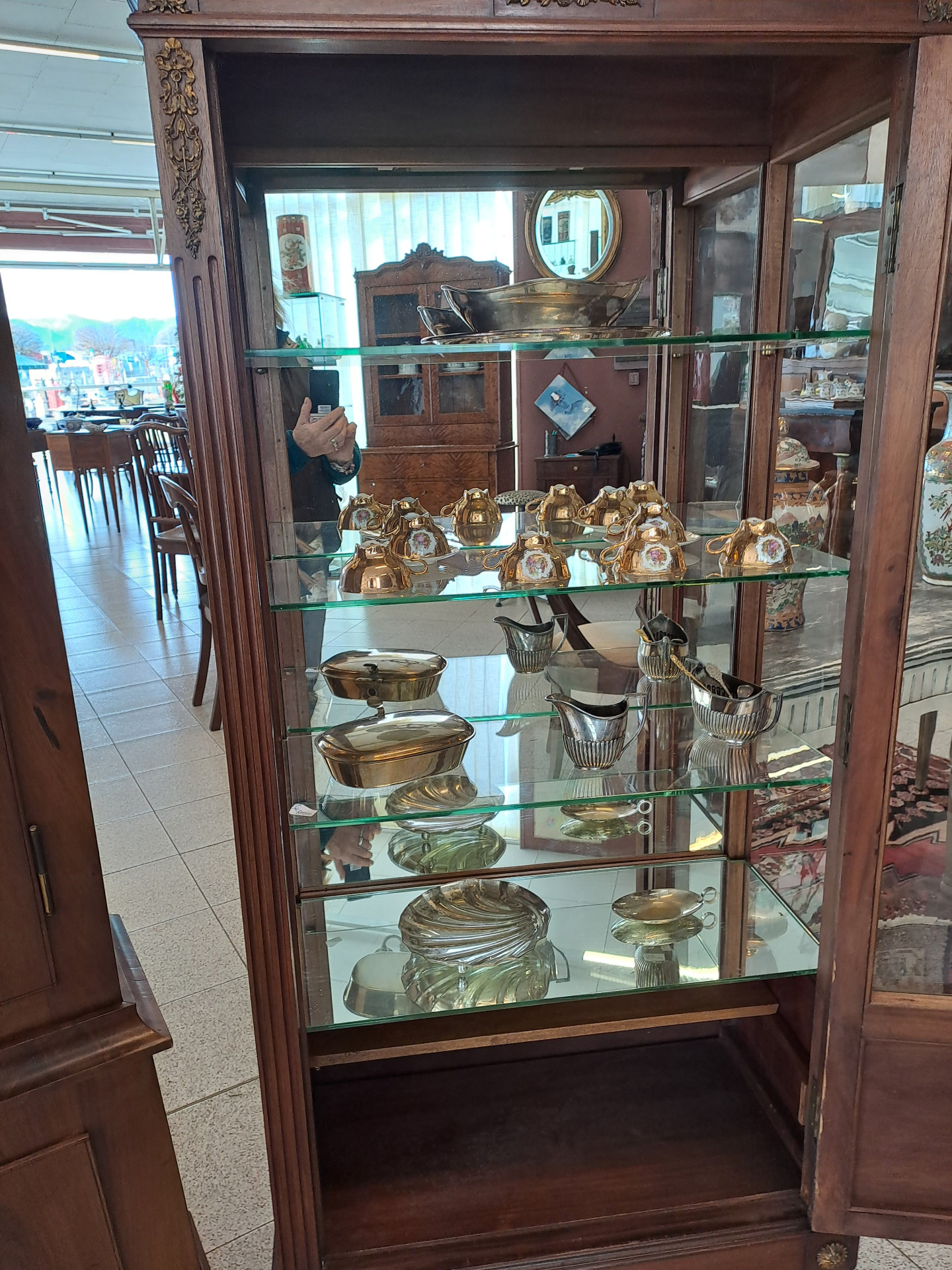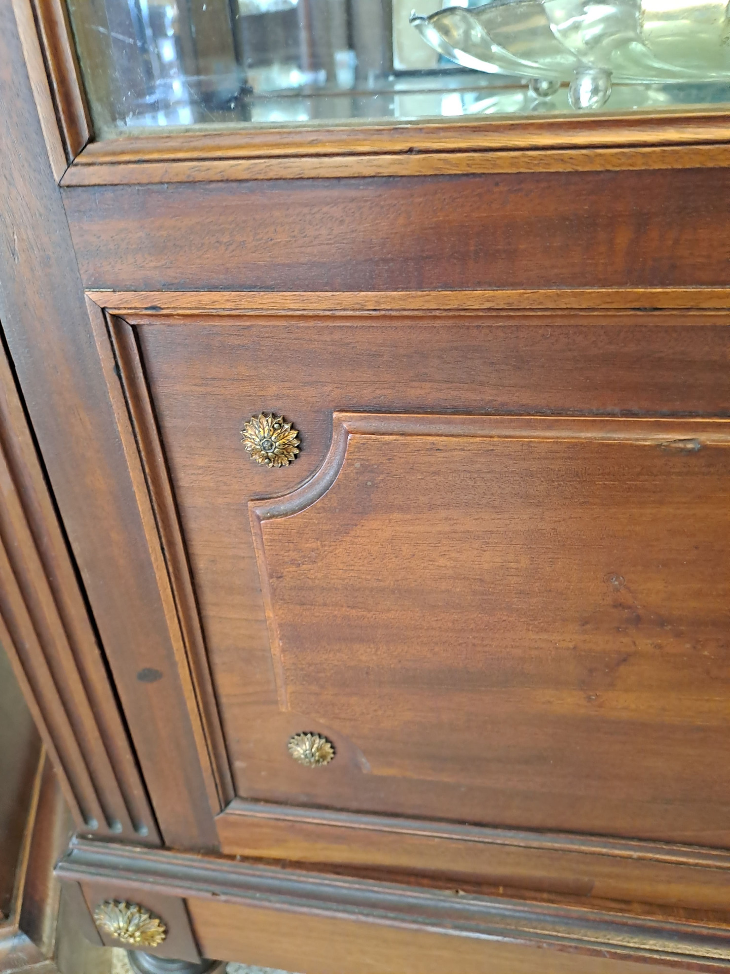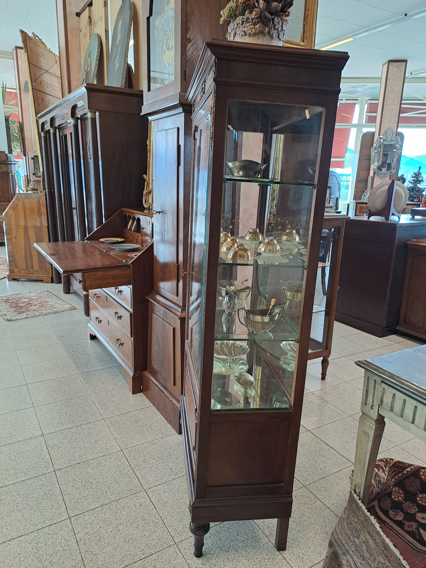 Inside, it has 3 glass shelves, one mirror shelf, and a small wooden shelf in the lower part.