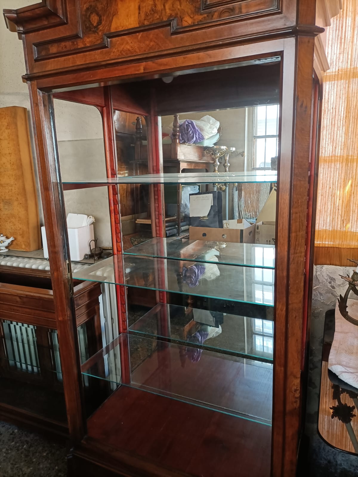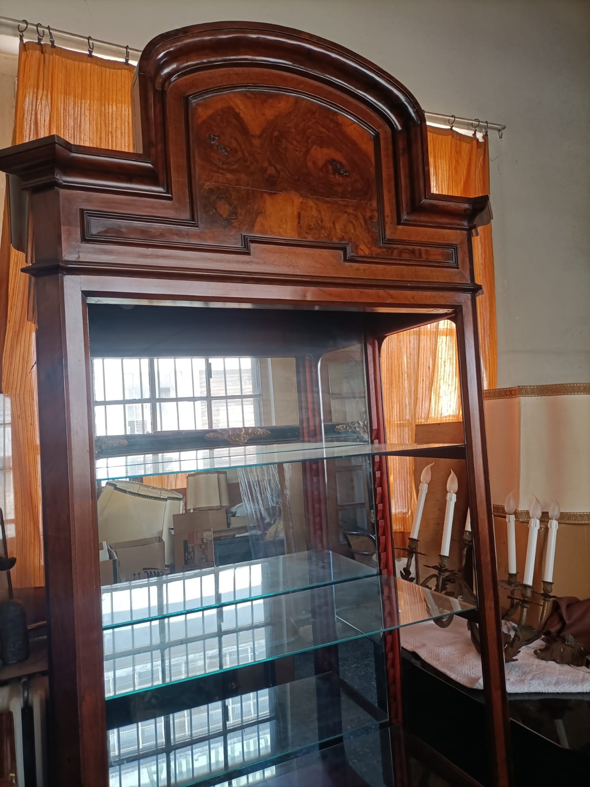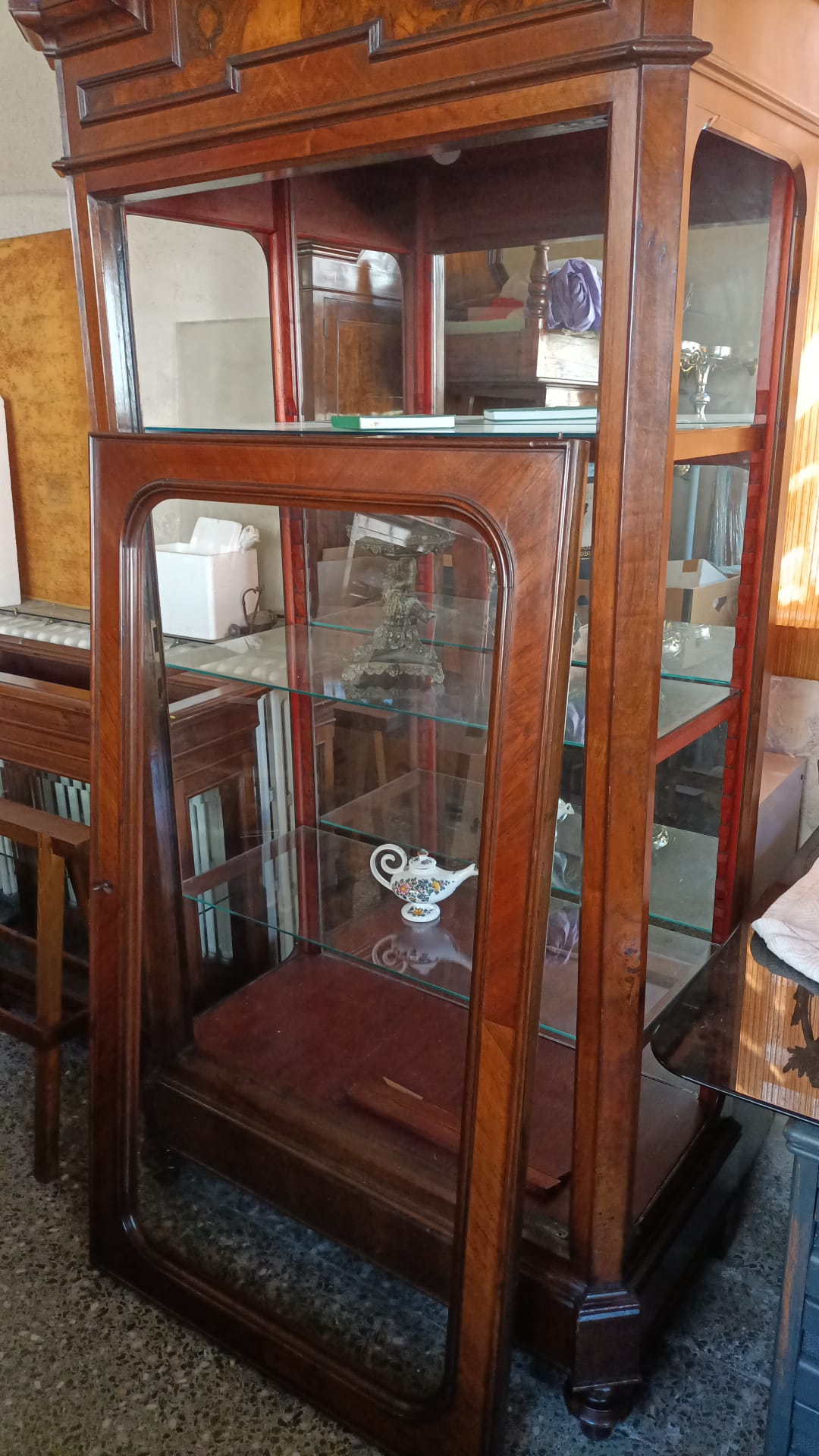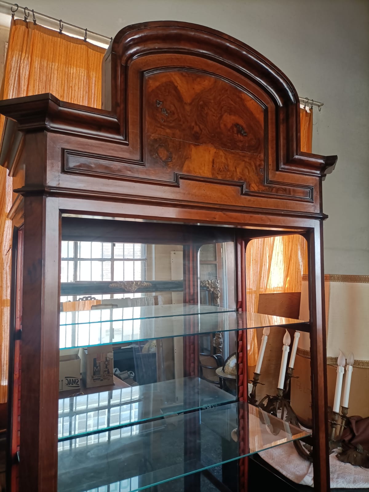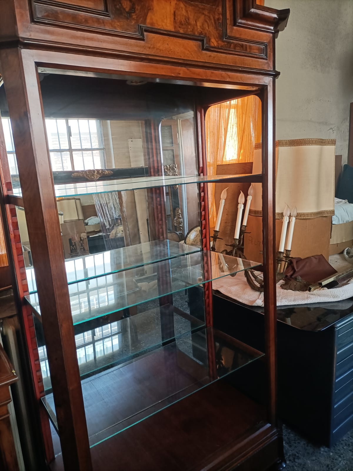 Single-door display cabinet in walnut and walnut burl with lighting system.