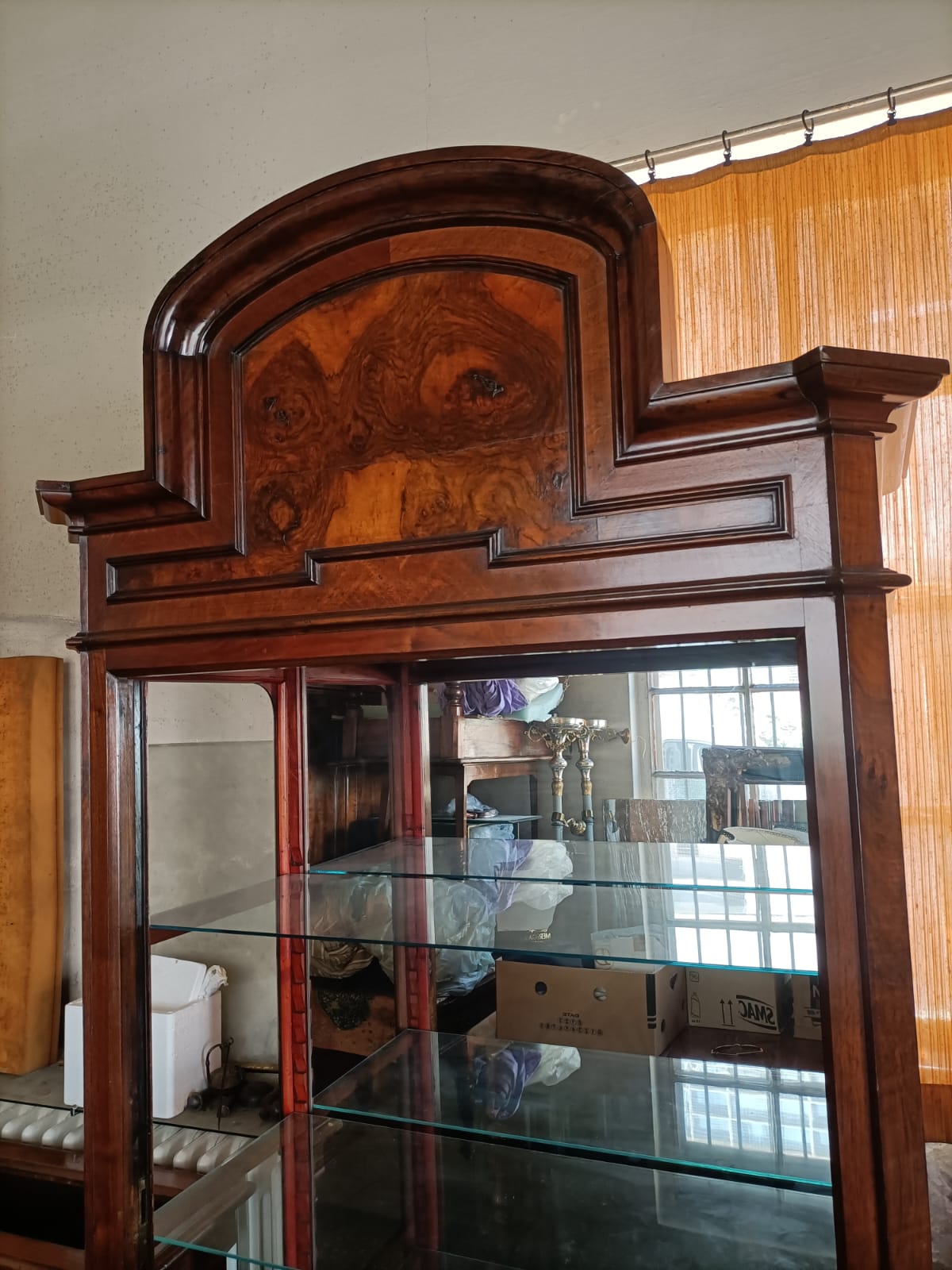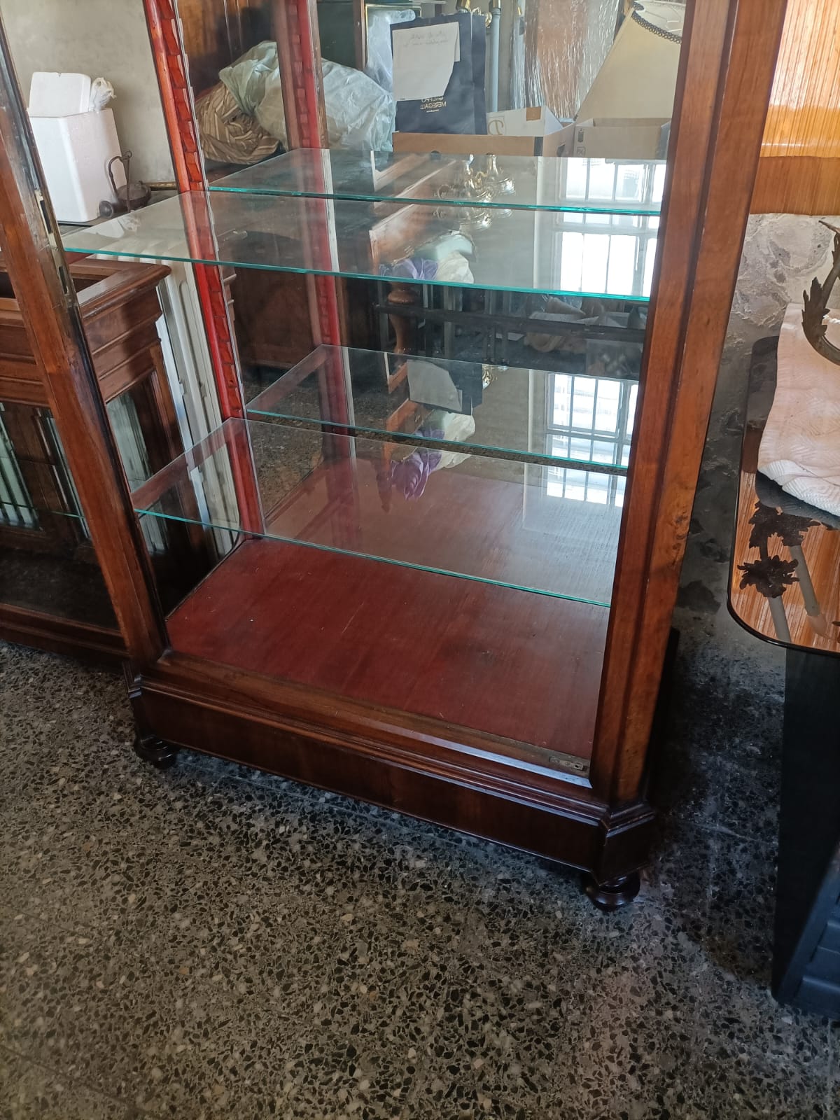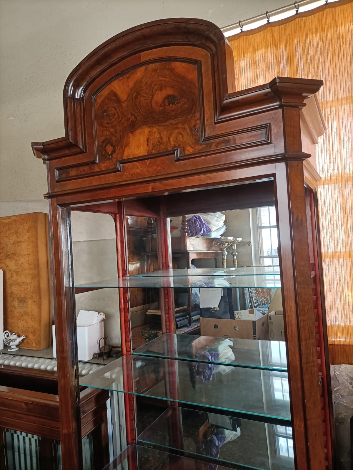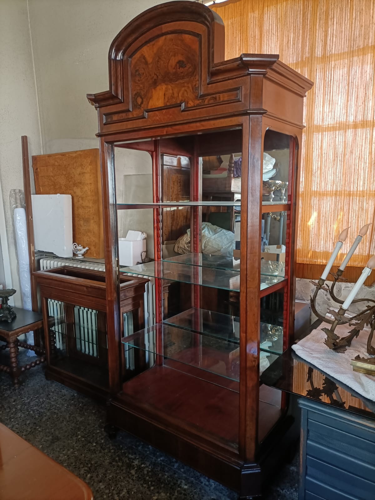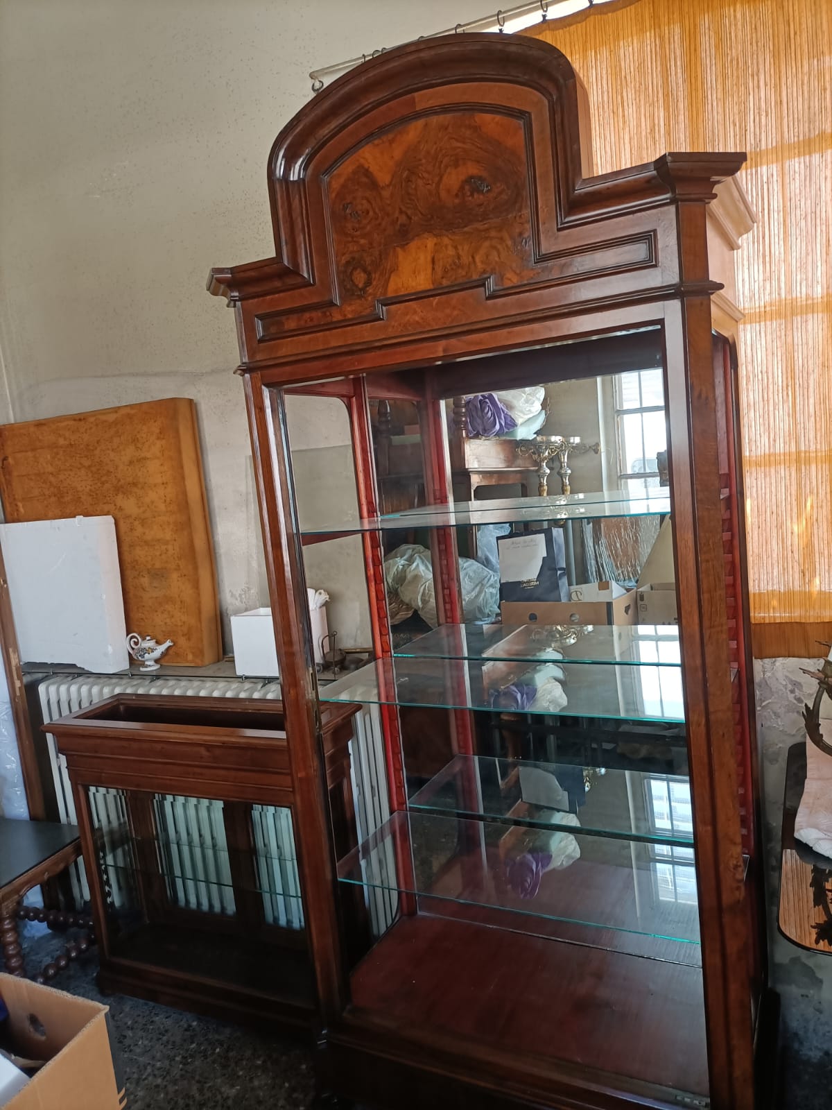 Single-door display cabinet in walnut and walnut burl with lighting system.