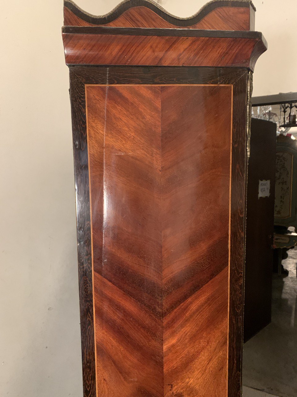 Made with an architectural shape, entirely veneered in various woods with gilded bronze applications (minor breaks and losses, one glass broken).
