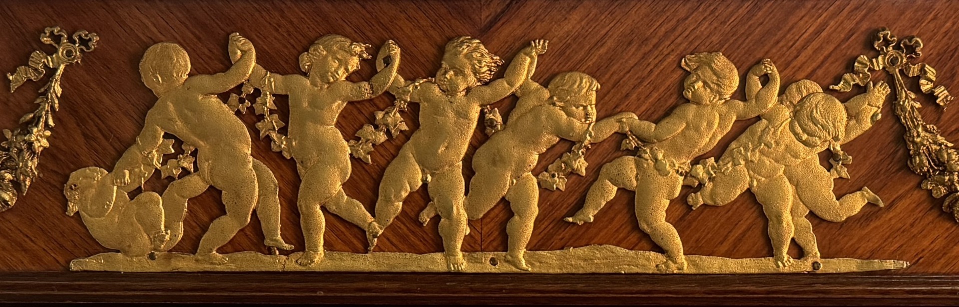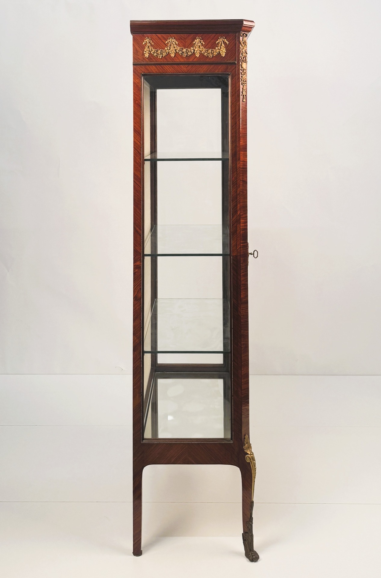 Vetrina impiallacciata in bois de rose, Francia, fine XIX - inizi del XX secolo, arricchita da fregi in bronzo dorato, fronte e fianchi in vetro, fascia superiore decorata da una danza di putti tra ghirlande di fiori ripetute sui fianchi un fregio a trofei musicali agli angoli, gambe arcuate terminanti in scarpette metalliche. All'interno tre ripiani in vetro.