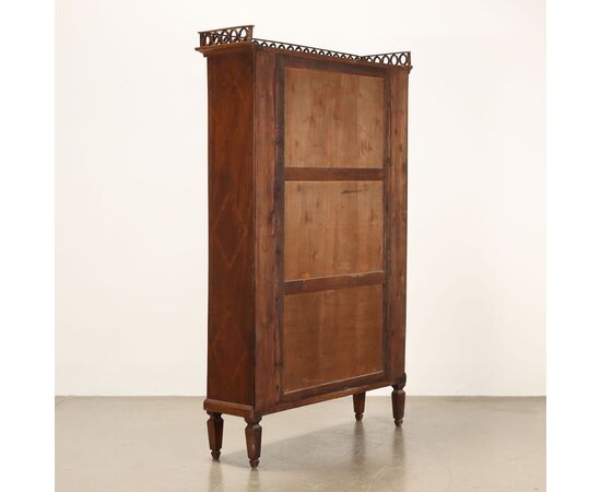 Vetrina in noce con inserti in ulivo, ricavata dall'alzata di una libreria due corpi, Fronte con ante a vetro, balaustra traforata, piedi tronco piramidali. Interno rivestito in velluto con quattro ripiani. Italia, fine XVIII Secolo.