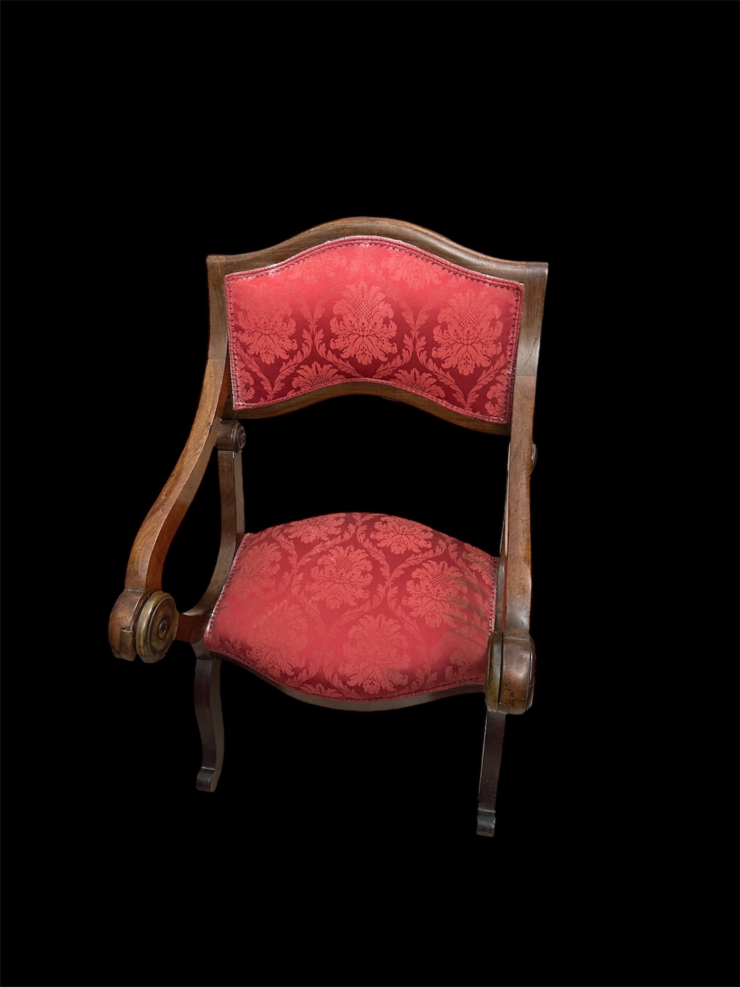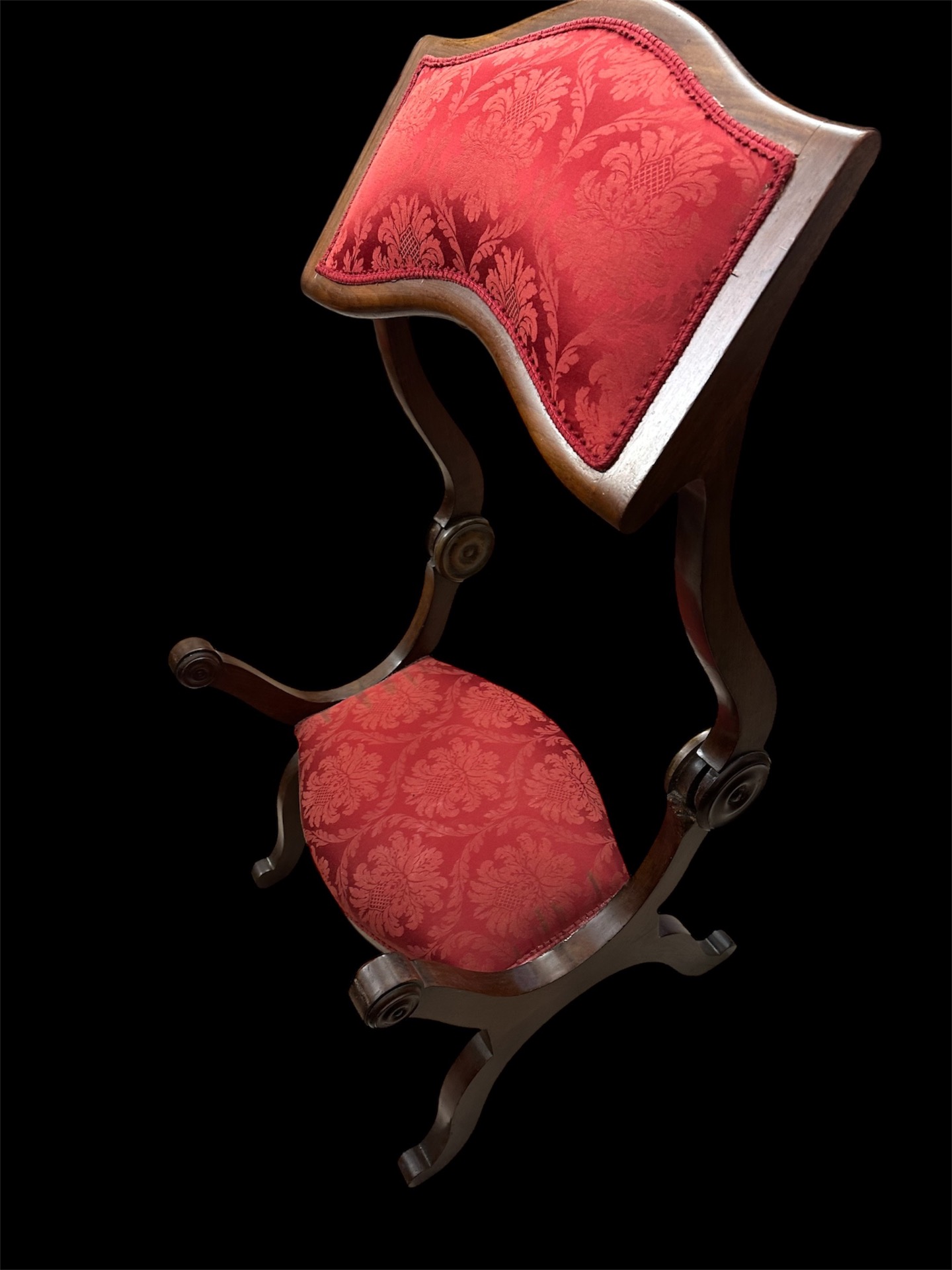 Armchair with movable backrest to transform into a kneeler with red upholstery. France 19th century