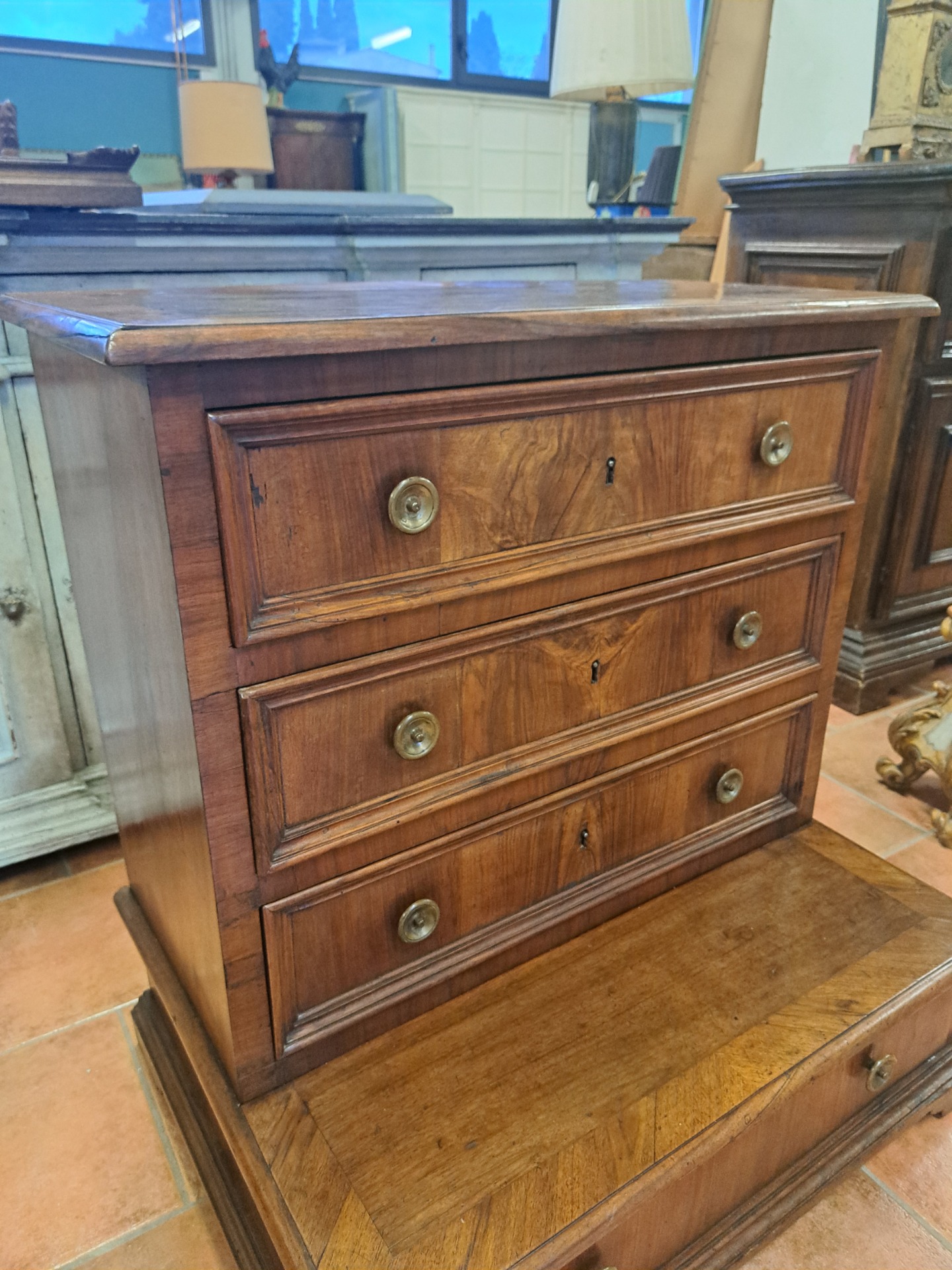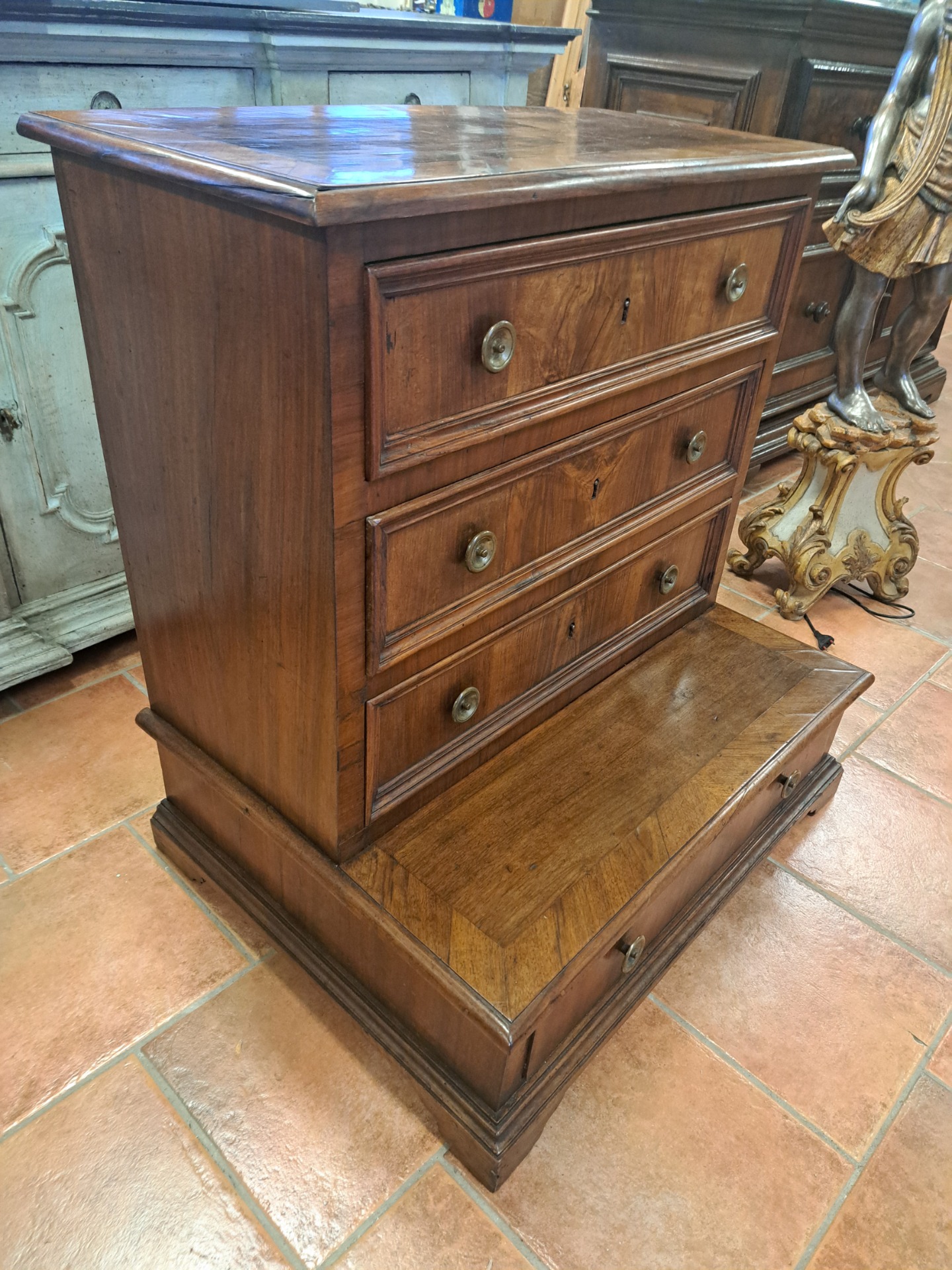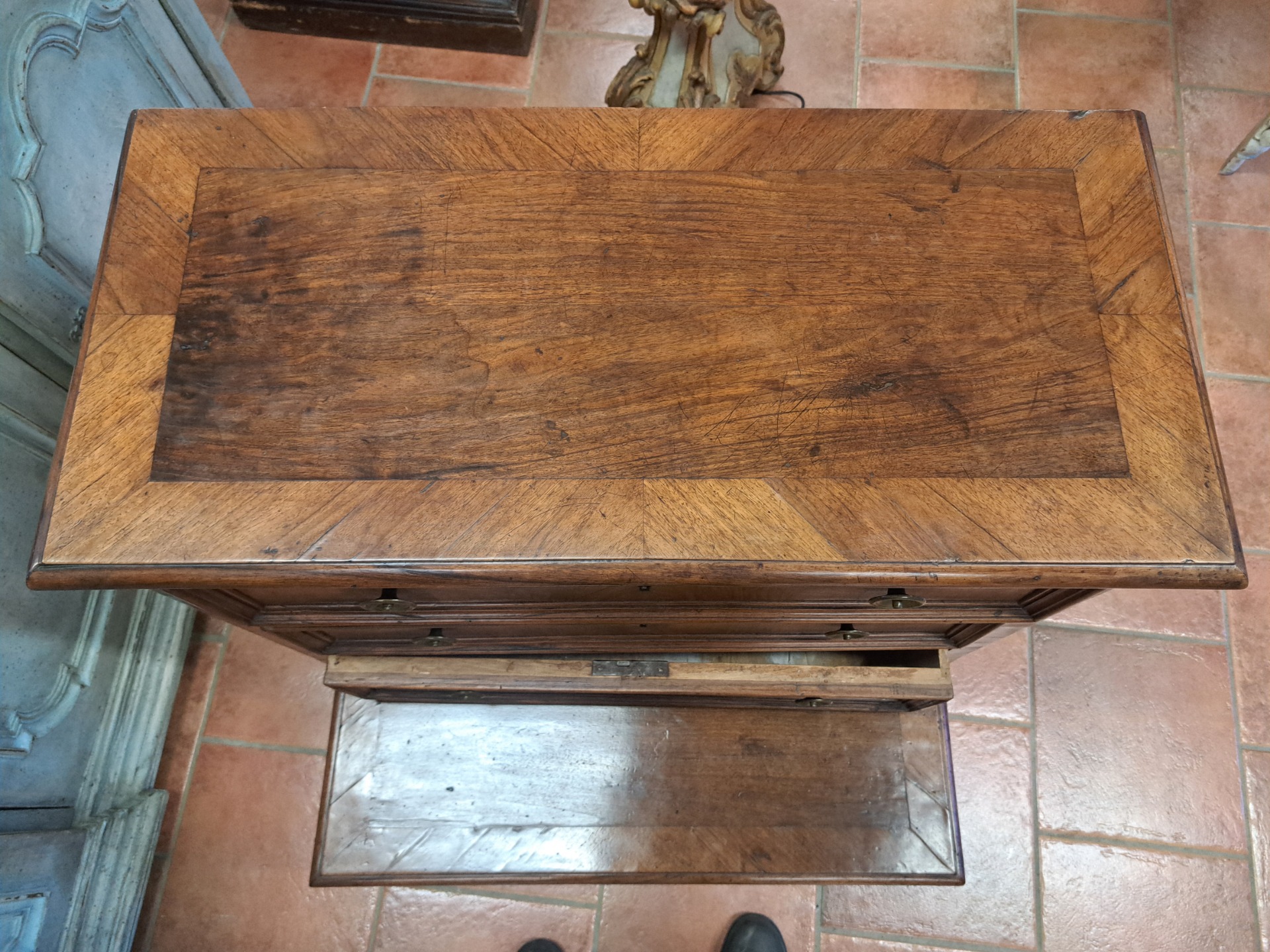 Beautiful walnut veneered prie-dieu from the first half of the 18th century, 4 drawers, catkin interiors in the tradition of Tuscan cabinet making, original locks and knobs. Measurements: 89 x 67 (depth at the upper surface 42 cm), height 95.