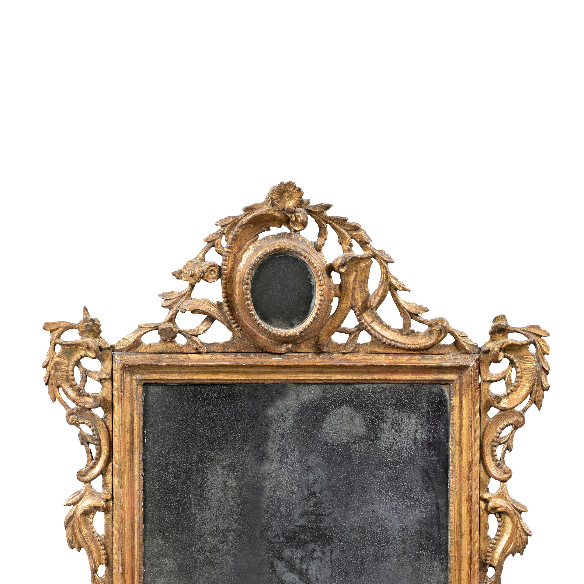 Made entirely of carved and gilded wood. Louis XV style decorations with elegant volutes, curls with a central medallion. Antique mirror, probably not from the same period.