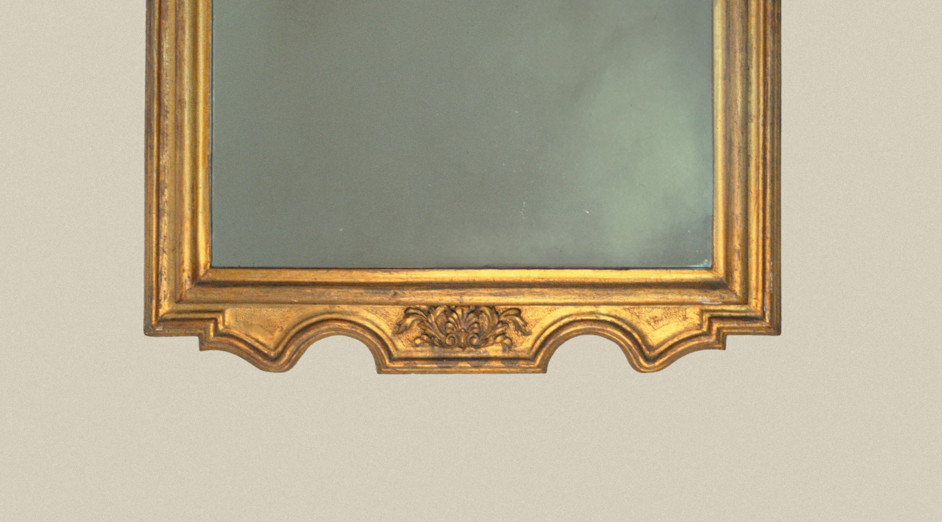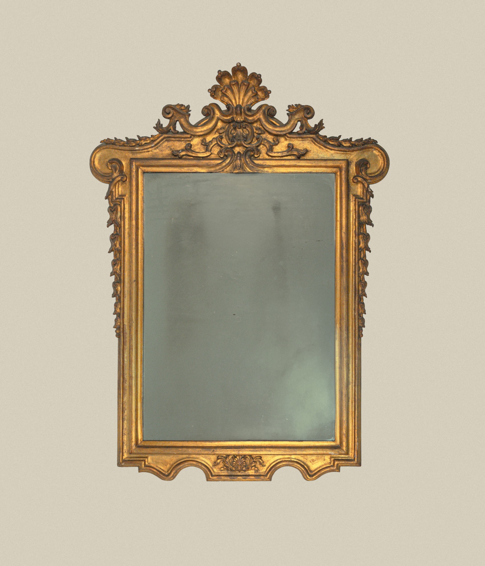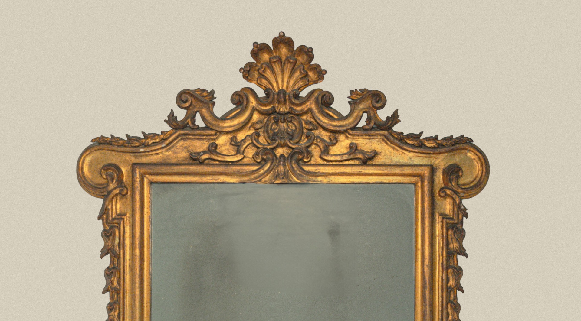 Carved and gilded wooden mirror, 19th century, cyma with opposing volutes centering a rocaille decoration, cm 174x127