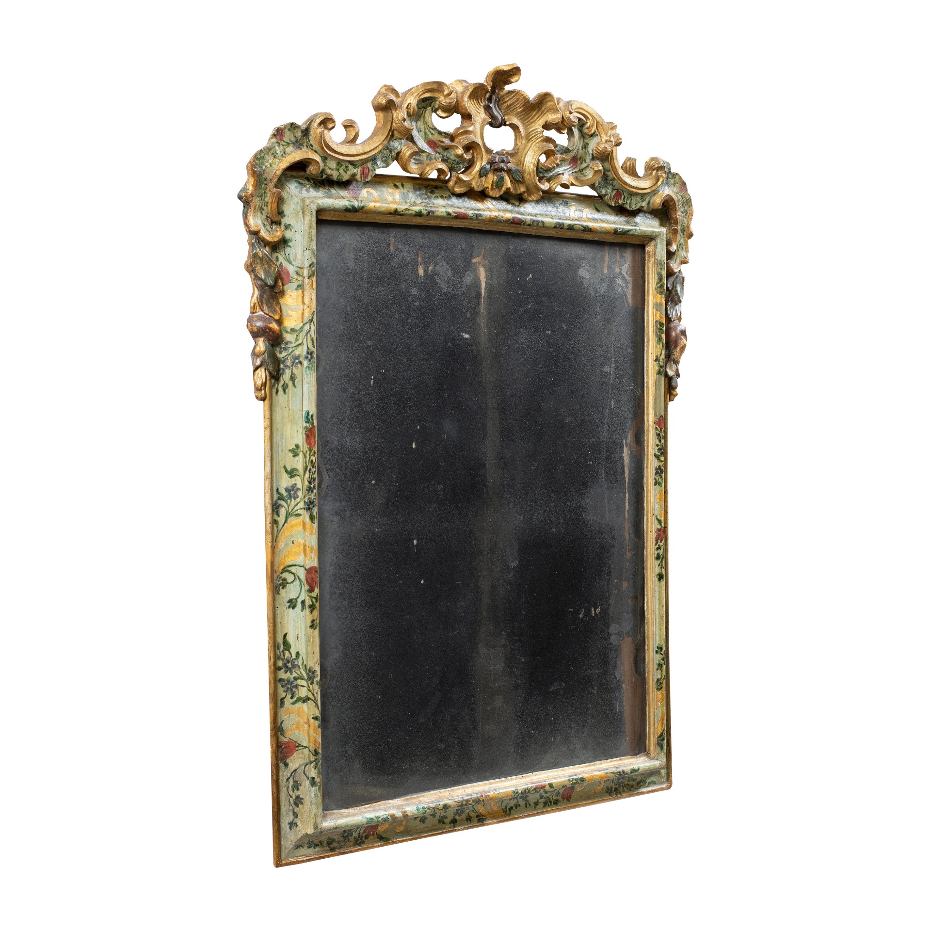 Carved and lacquered wooden mirror. Venice, 18th century. 102 x 81 cm. Made entirely of carved, lacquered, gilded and painted wood. Rococo model with an elegant carved crest featuring “Rocaille” motifs. Pictorial decorations with floral motifs on a green background. - All...