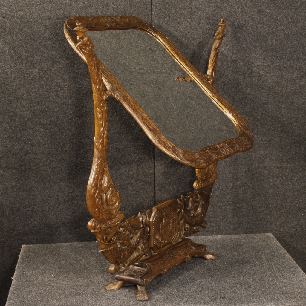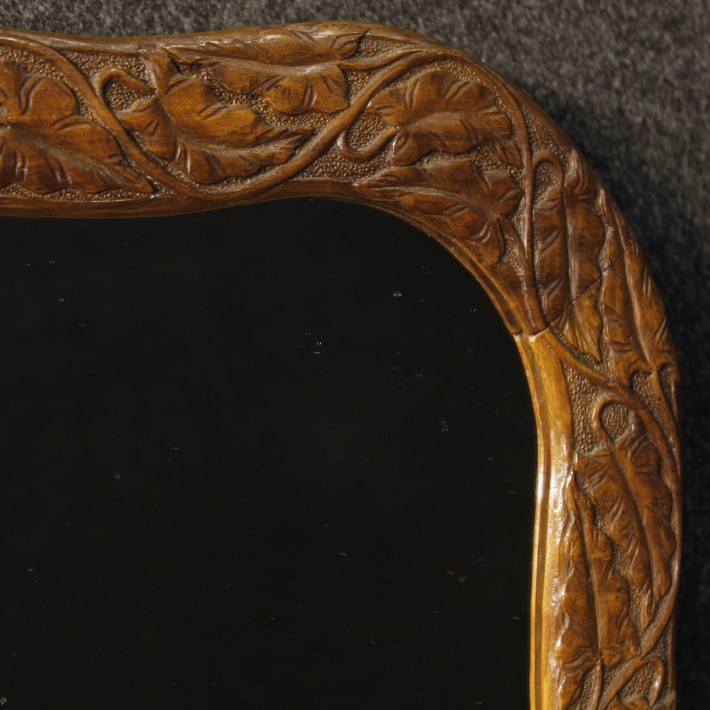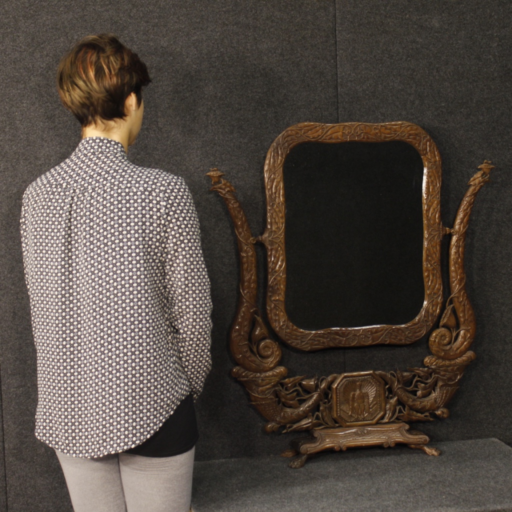 French Art Nouveau cheval mirror from the 20th century. Finely carved and chiseled object in beech wood for antique dealers and collectors. Beautifully decorated bedroom or living room cheval mirror supported by four zoomorphic feet (see photo). Object that has recently undergone a cleaning and conservative restoration intervention. Cheval mirror richly adorned with floral decorations and central coat of arms on the base (see photo). In good condition with some small signs of restoration.