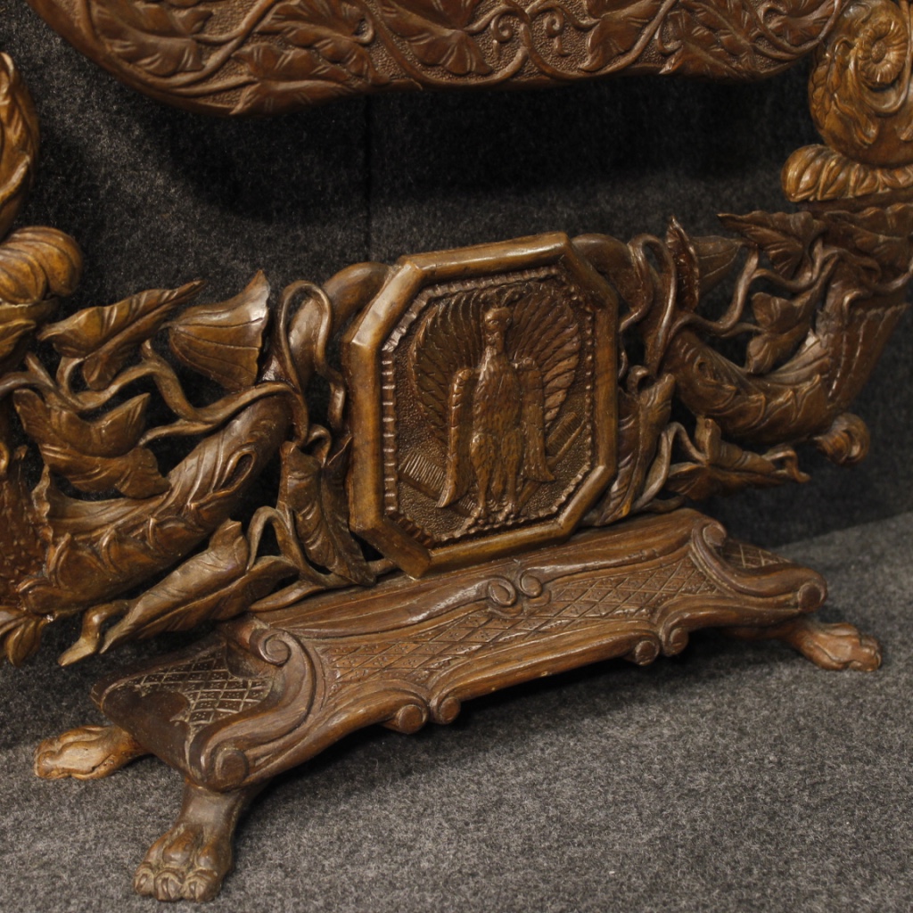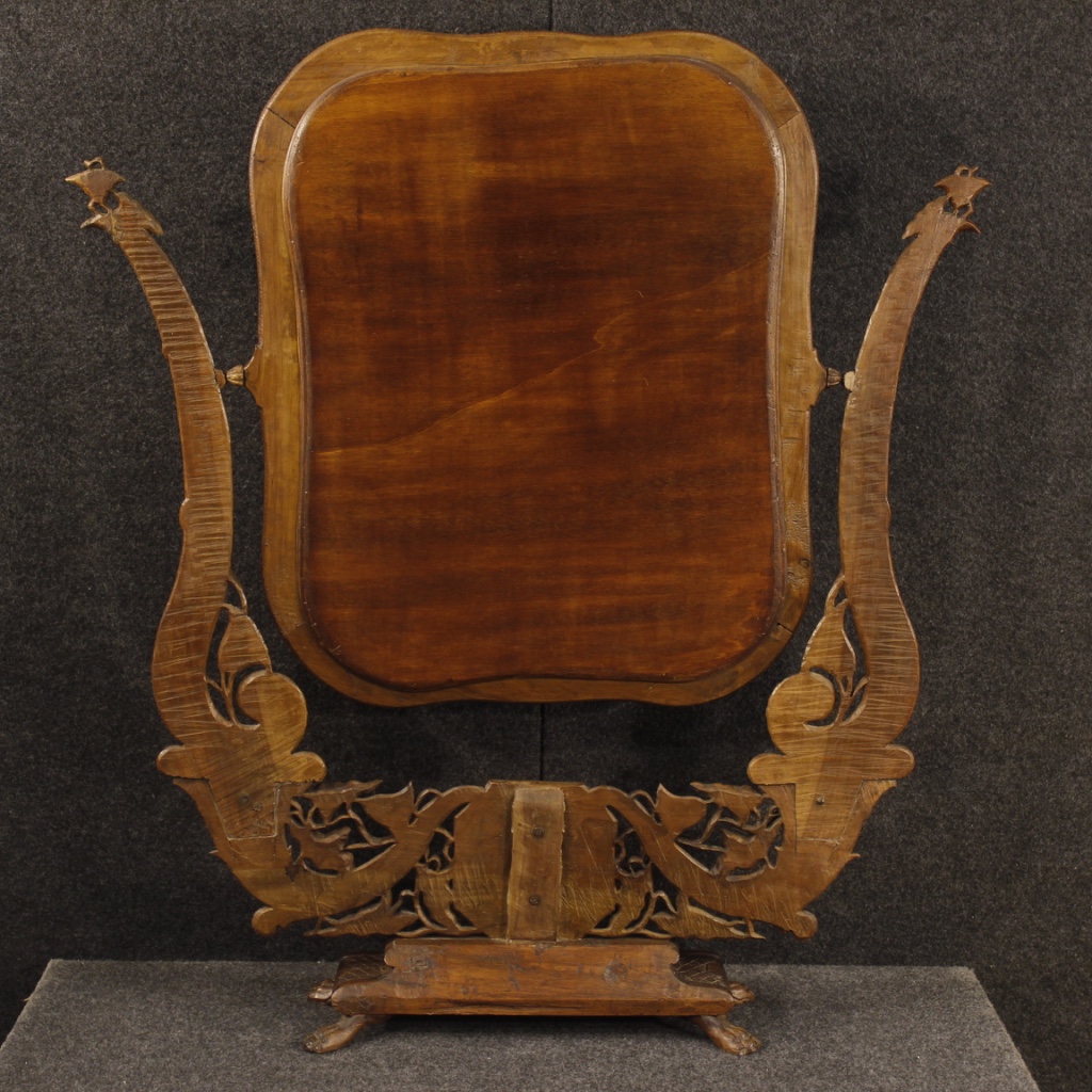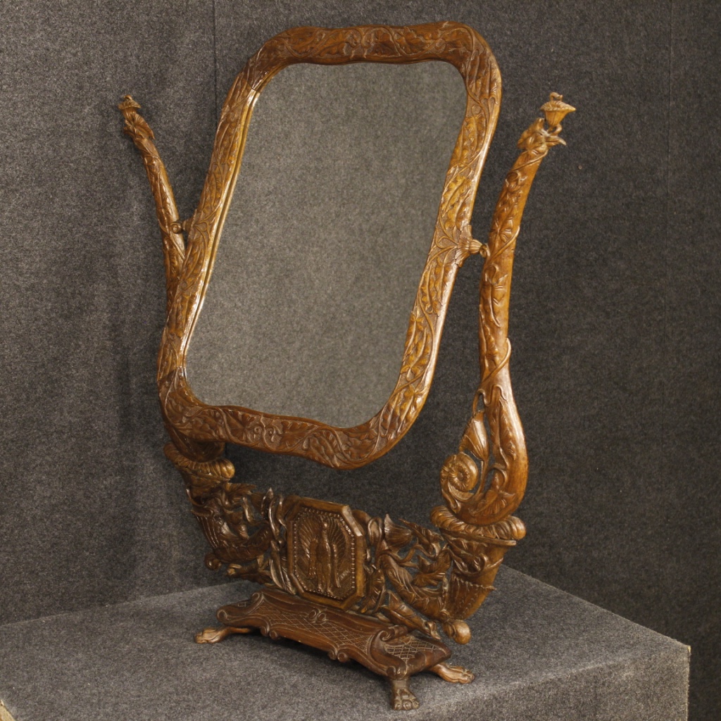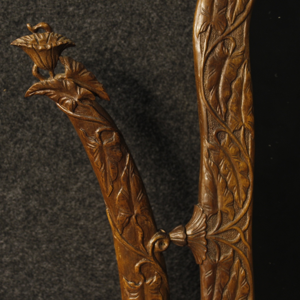 French Art Nouveau cheval mirror from the 20th century. Finely carved and chiseled object in beech wood for antique dealers and collectors. Beautifully decorated bedroom or living room cheval mirror supported by four zoomorphic feet (see photo). Object that has recently undergone a cleaning and conservative restoration intervention. Cheval mirror richly adorned with floral decorations and central coat of arms on the base (see photo). In good condition with some small signs of restoration.