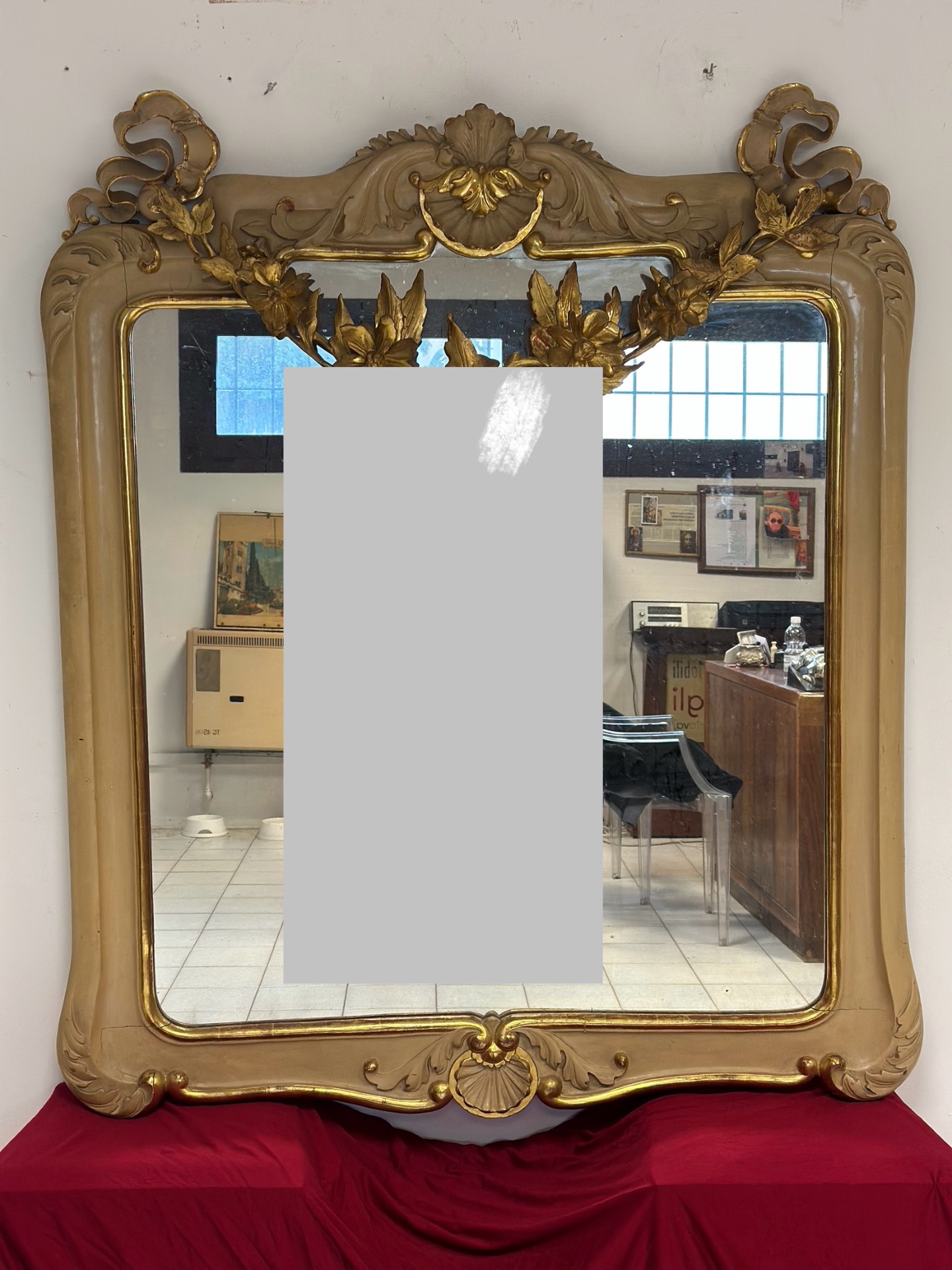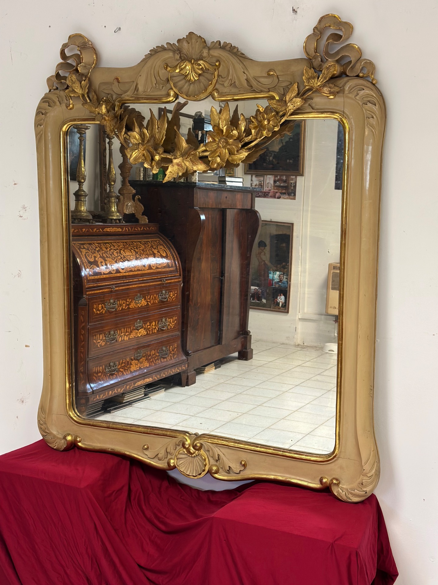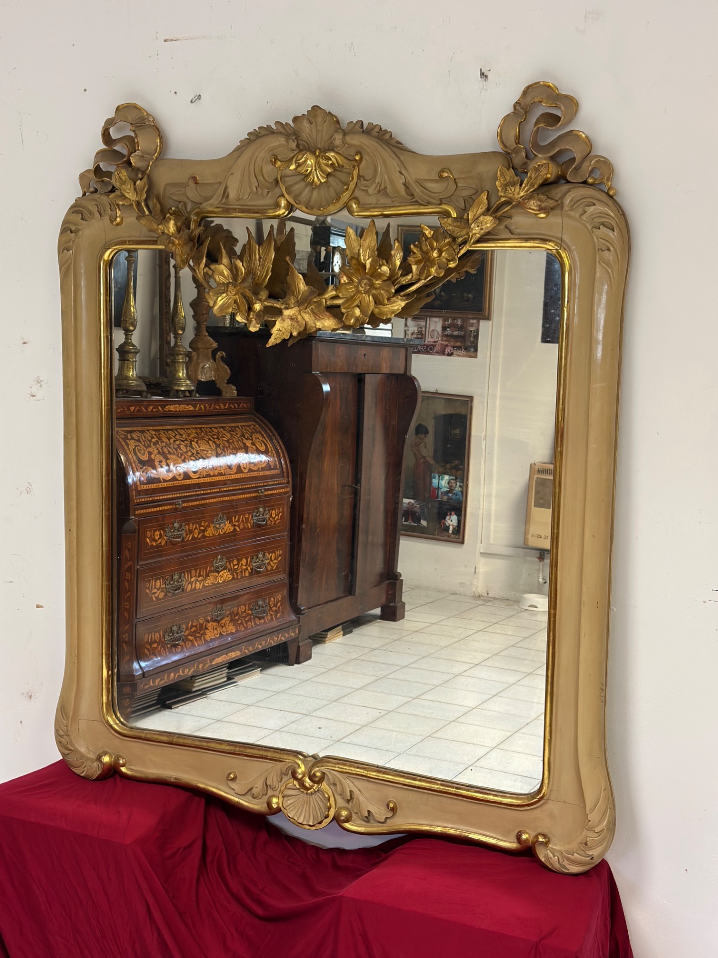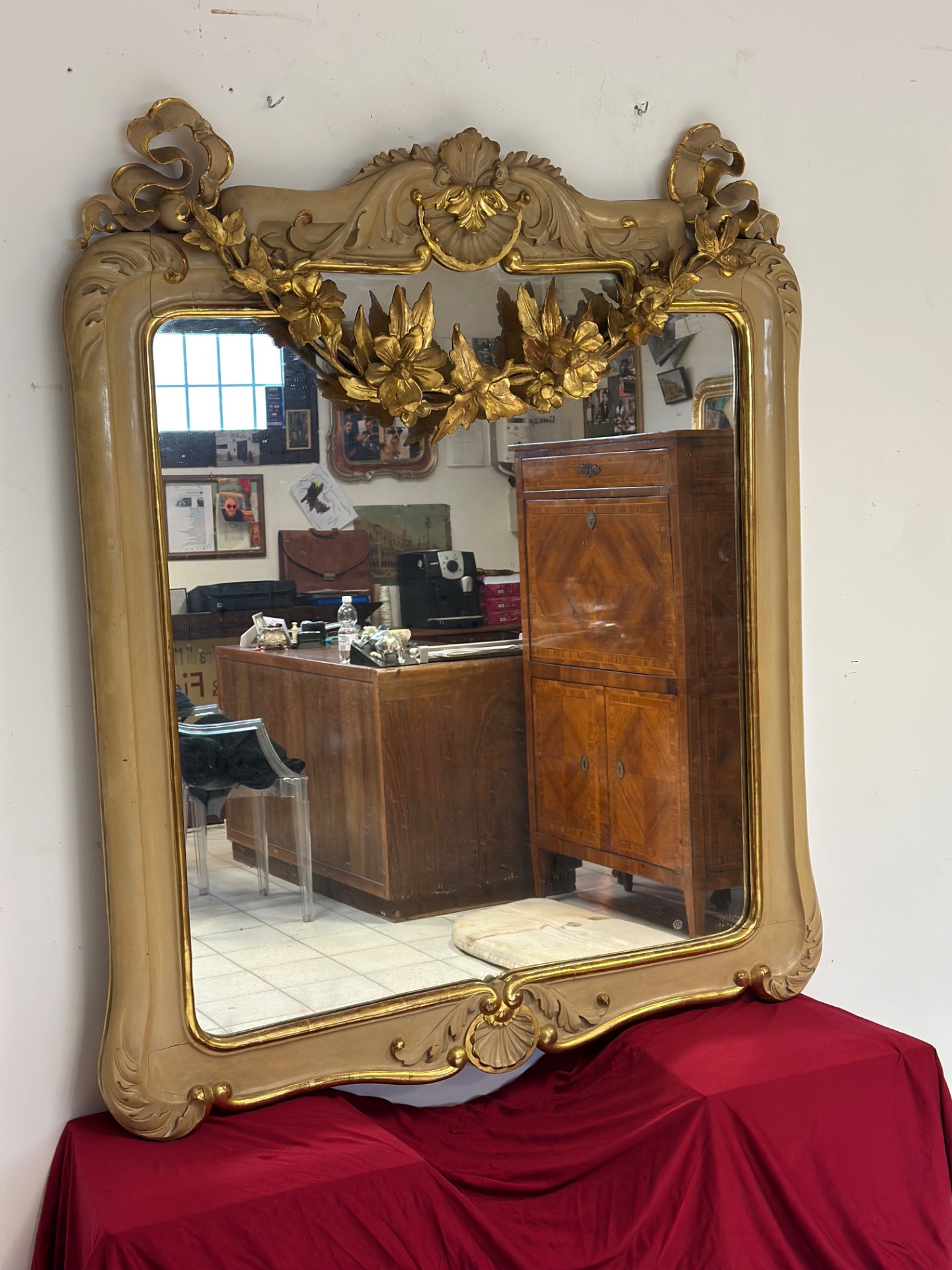 Important carved wood lacquered and gilded mirror, Charles X period, Siena, features a festoon in the upper part with floral motifs, mercury glass.