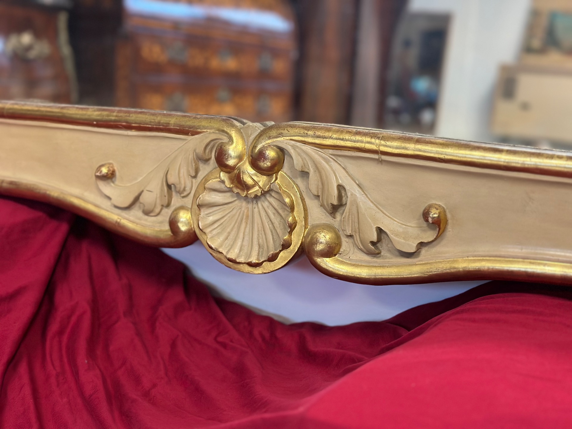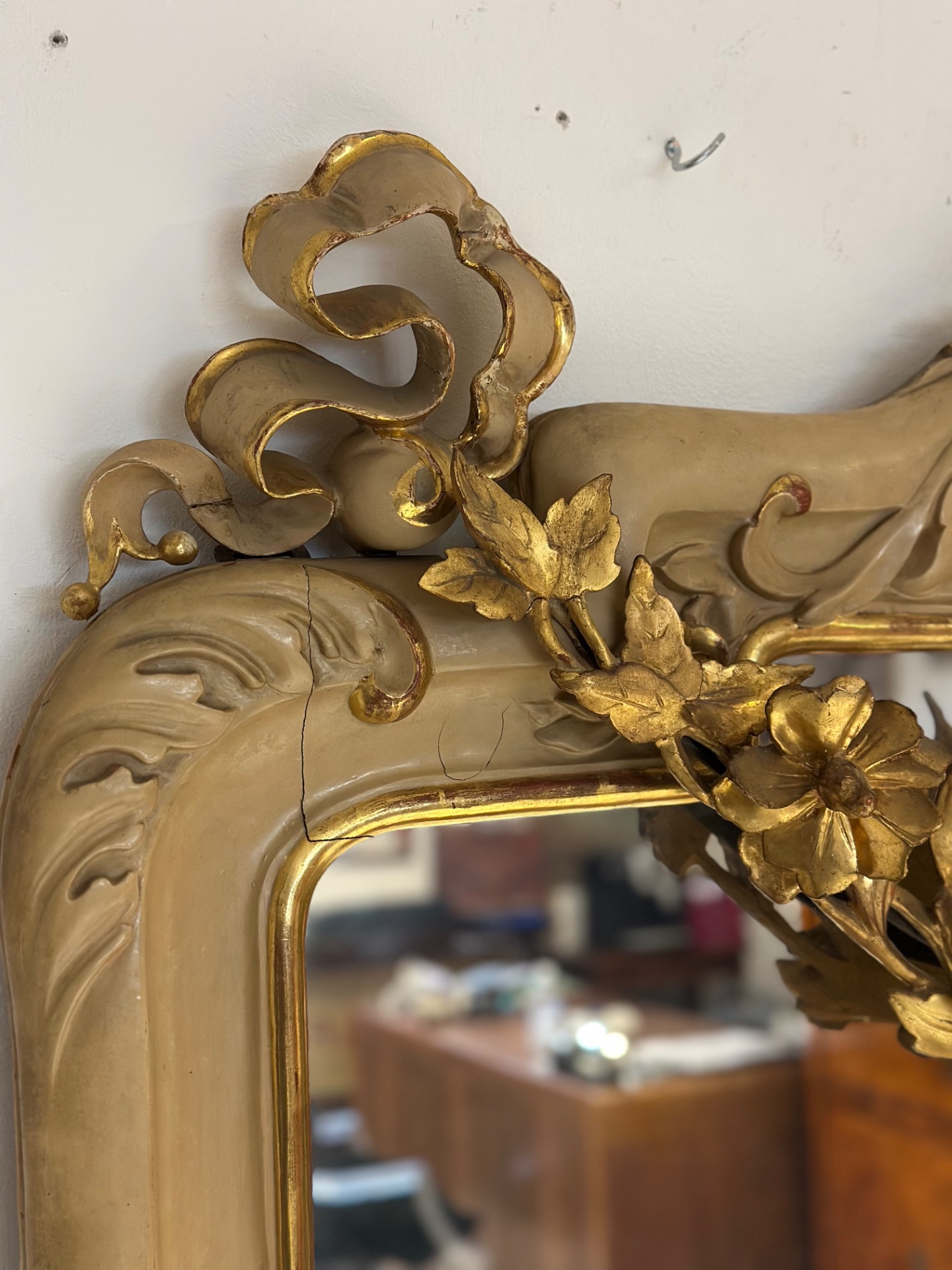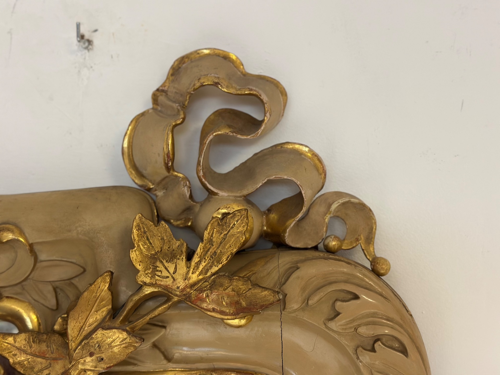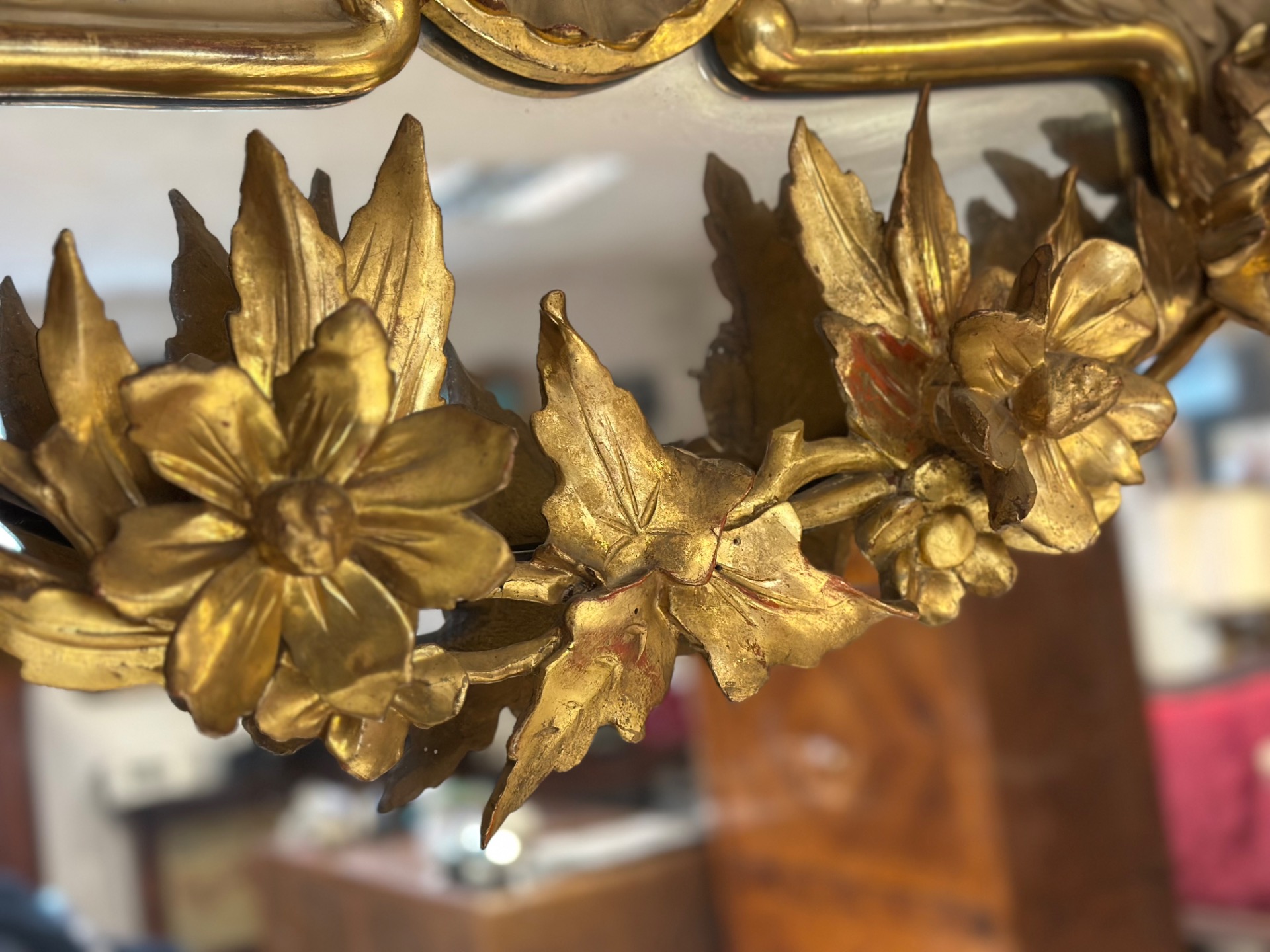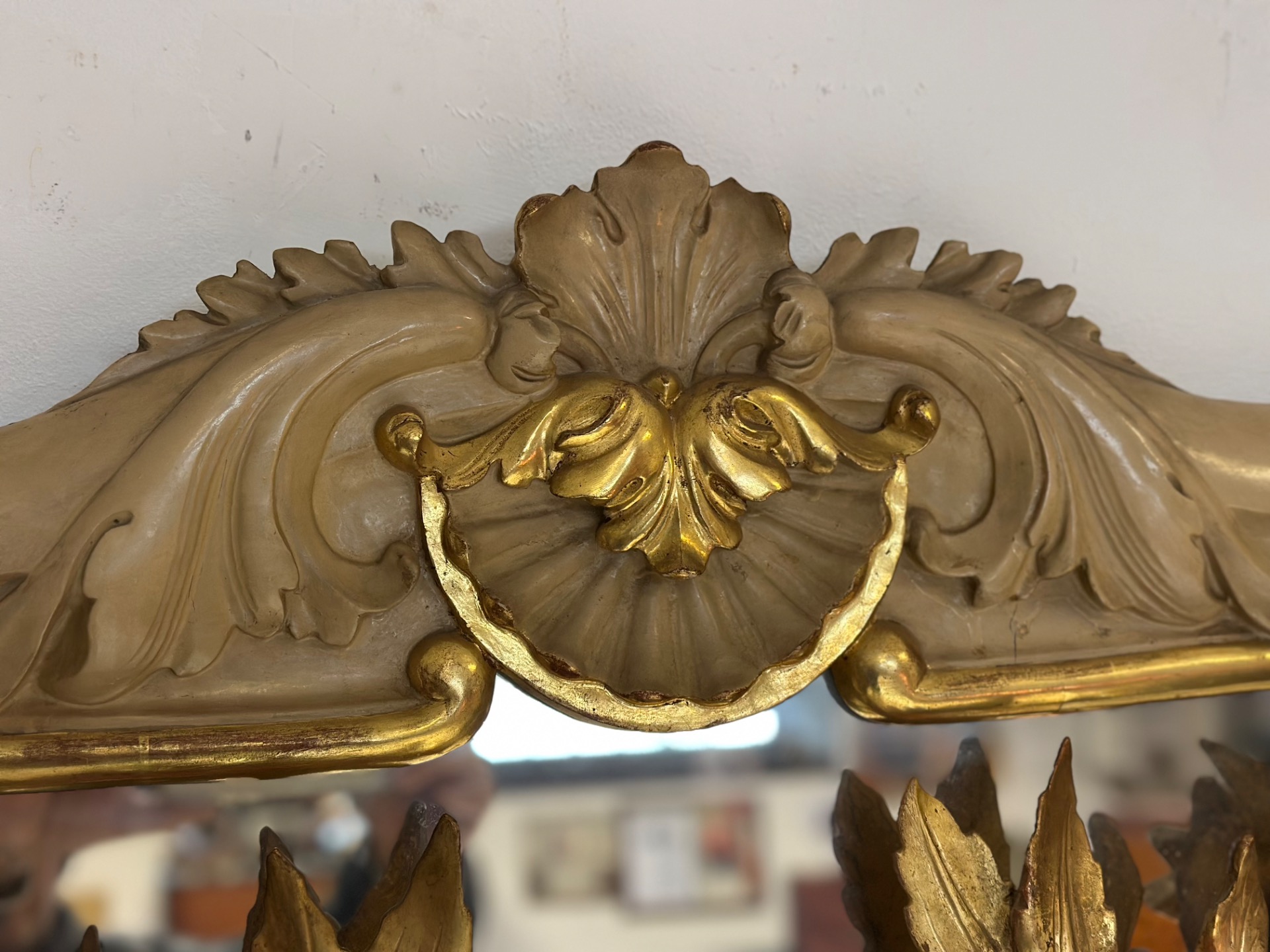 Important carved wood lacquered and gilded mirror, Charles X period, Siena, features a festoon in the upper part with floral motifs, mercury glass.
