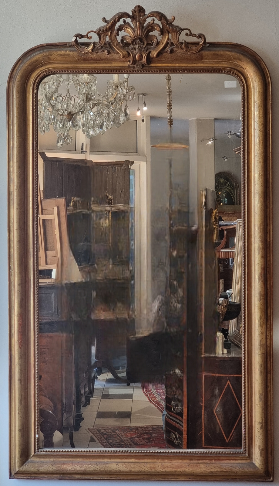 Elegant Louis Philippe mirror in gilded pastille with gold leaf, datable to the mid-19th century. The frame, rectangular in shape with rounded corners, features refined engraved and chased decoration with stylized foliage and bunches of grapes, which enliven the gilded surface with a delicate interplay of light and shadow. The central crest, entirely modeled in pastille, is adorned with volutes and acanthus leaves arranged symmetrically around a central shell motif, according to the typical taste of the Louis Philippe period. The gilding, original, retains a warm and uniform patina, with minimal wear and slight retouching compatible with age. The mirror appears to be coeval, with slightly oxidized silvering that gives depth and softness to the reflection. Dimensions: 150 × 84 cm. For more information, photos or technical details, please do not hesitate to contact us. Worldwide shipping available with professional packaging.