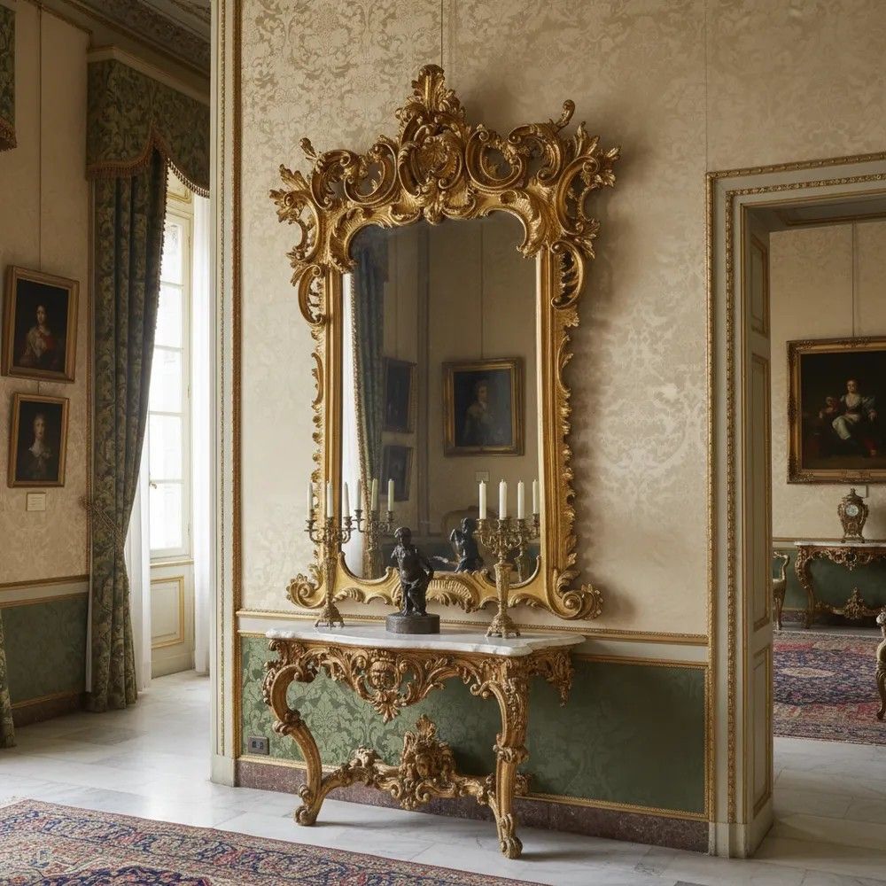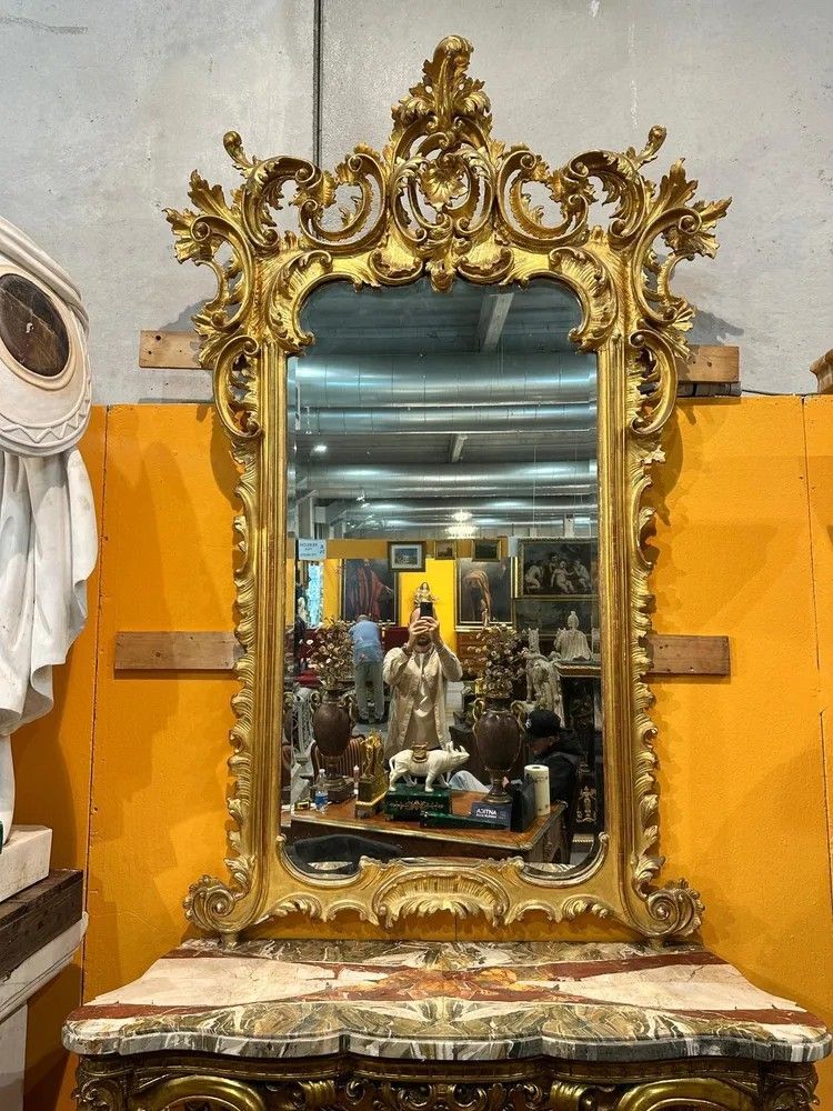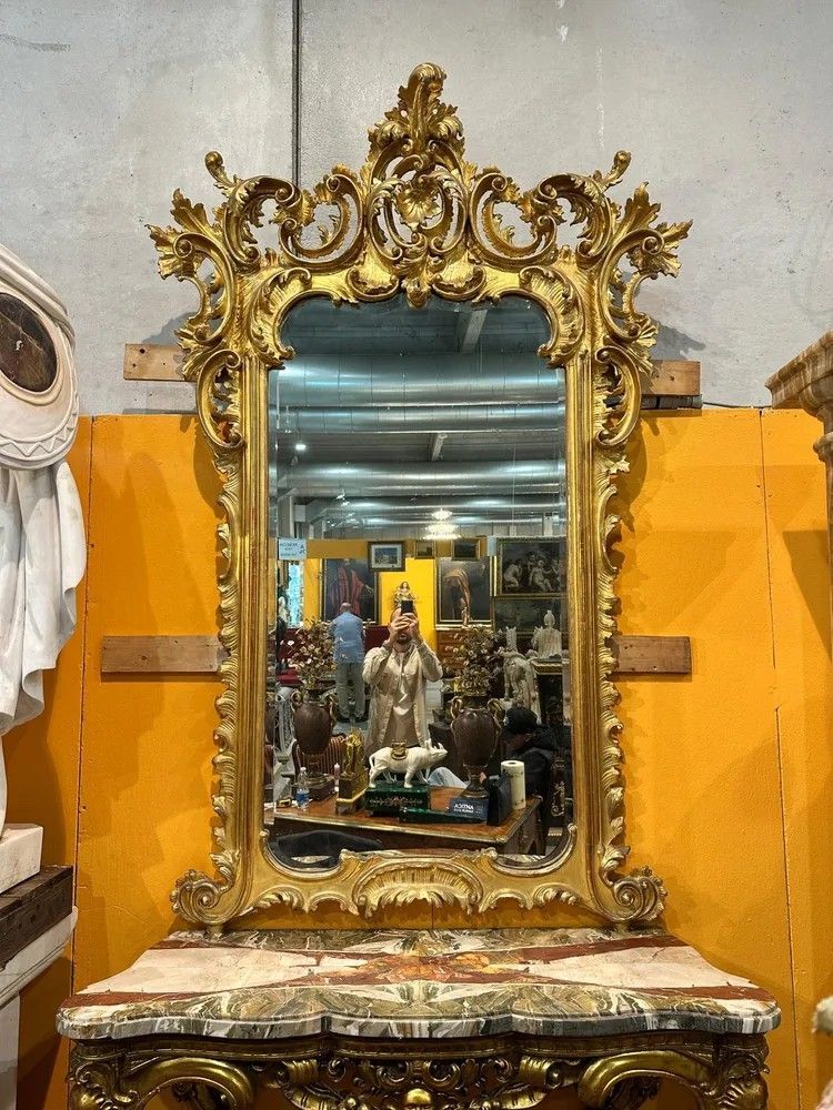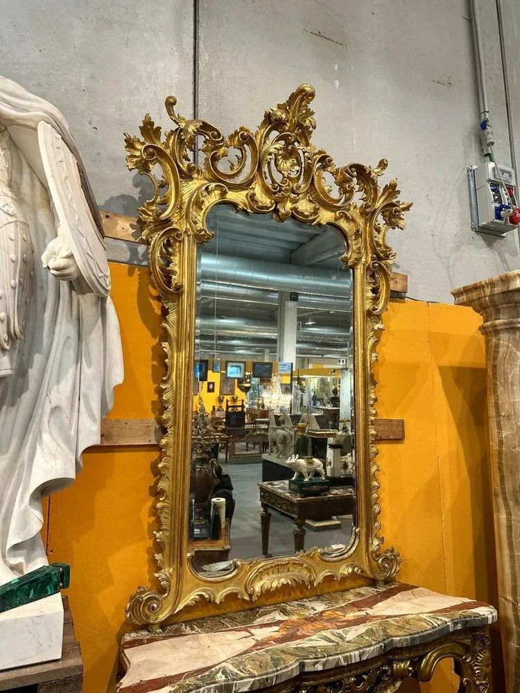 Ad ogni sguardo questa specchiera Luigi Filippo svela la raffinatezza dell’ebanisteria ottocentesca. Il sontuoso telaio in legno intagliato è un trionfo di volute, foglie d’acanto e riccioli rocaille, modellati a mano con un virtuosismo che solo i migliori atelier francesi dell’epoca potevano garantire. Ogni curva è rivestita da una doratura a foglia oro zecchino 24,5 k, stesa con la tecnica tradizionale a missione e brunita per far vibrare la luce con riflessi caldi e setosi.L’altezza di 245 cm le dona una presenza scenica irresistibile: collocata su una console o semplicemente appoggiata a pavimento, amplifica lo spazio e nobilita l’ambiente con la sua luminosità dorata. Epoca: XIX secolo, ca. 1850Stile: Luigi FilippoMateriale: legno di tiglio e pioppo finemente intagliatoDoratura: foglia oro zecchino 24,5 kDimensioni: H 245 cm – larghezza massima ca. 156 cmProvenienza: collezione privata italiana.Destinata originariamente a dimore nobiliari, oggi diventa il dettaglio decisivo per un salone contemporaneo, un ingresso scenografico o la suite di un hotel di charme. La sua maestà dialoga con stucchi, boiserie ma anche con interni minimal, creando un contrasto di eleganza senza tempo.Stile: Luigi Filippo Materiale: LegnoAltezza (cm): 245Larghezza (cm): 156Epoca: XIX Secolo - 1800