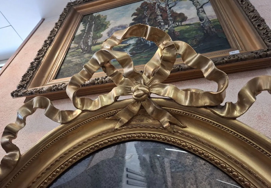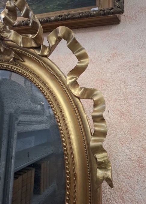 Period: early 18th century Description: Oval gilded mirror with a ribbon crest Dimensions: H 115 cm - Width 86 cm. Shipping costs to be paid by the customer. For more information: info@antichitadaziano.com