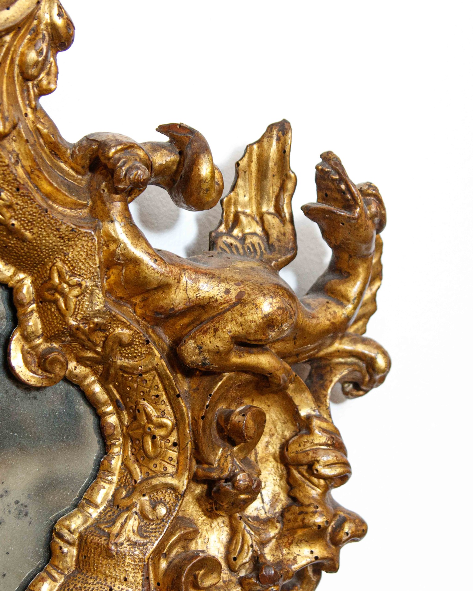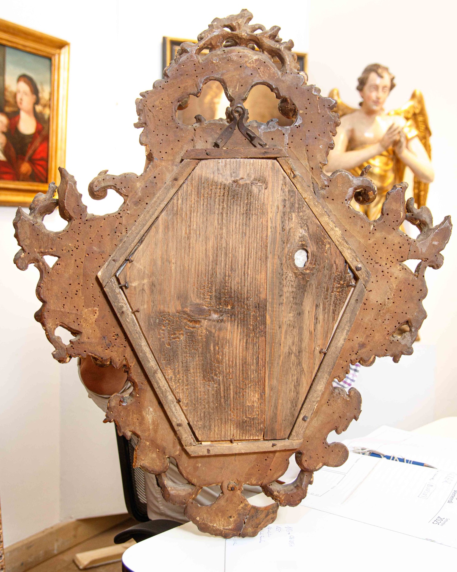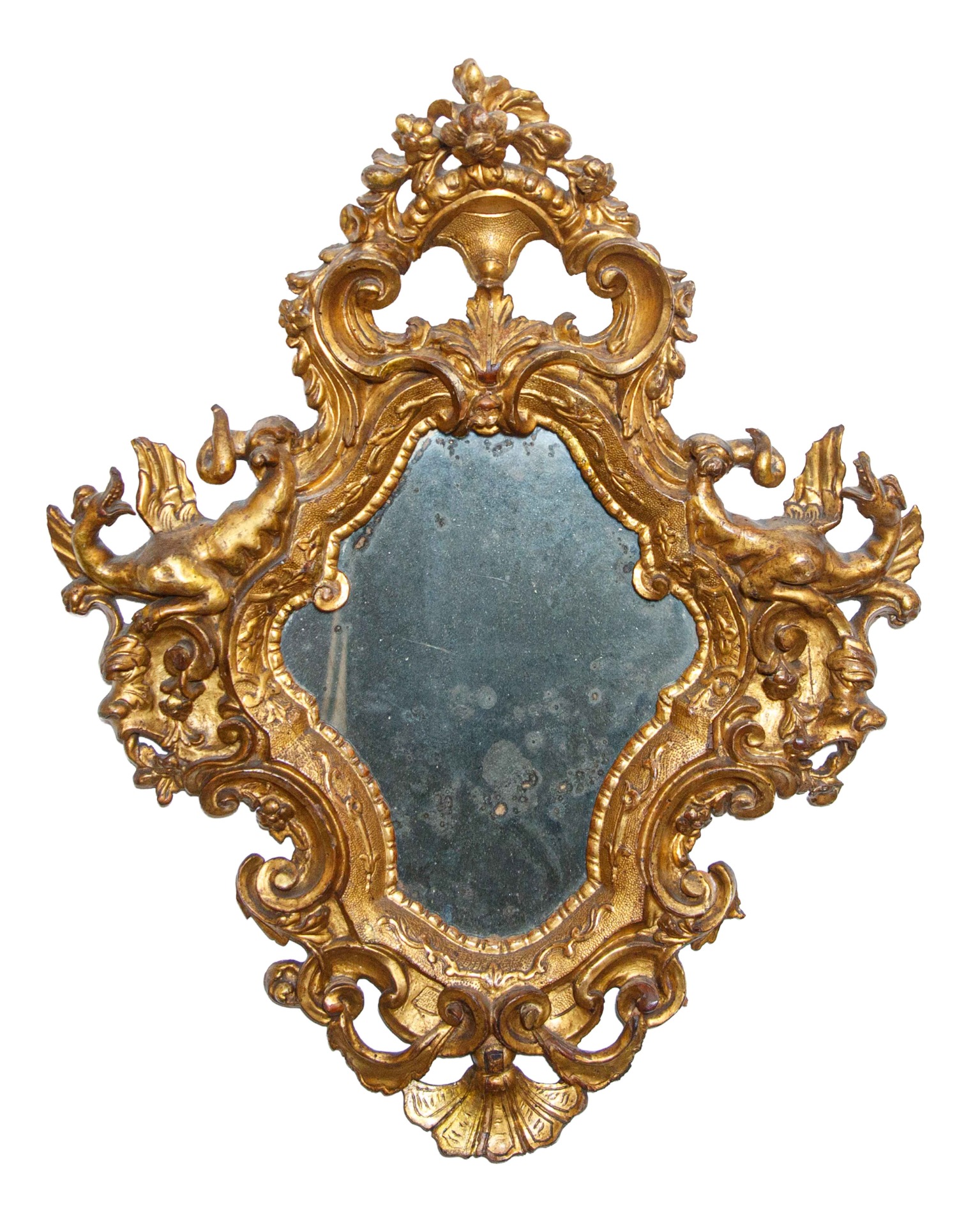 A mid-18th century Venetian-made mirror that follows the Rococo taste that became established in the lagoon during this period, both in the field of furniture and more generally in Venetian art. The undulating shape of the frame that surrounds the mirror is reflected in the fan-shaped mirror models then made in Venice; the same decoration of the frame uses elements and shapes typical of the era: volutes, vegetal elements, in particular in the flowers of the crest, and animals, such as the specular sea dragons on the outermost concave edges, or the shell on the bottom, another recurring element in Venetian decorations. The opulence of the ornaments carved in wood and gilded, however, manages not to weigh down the structure of the mirror which is graceful, delicate and light as a whole, following the canons of the Rococo style.