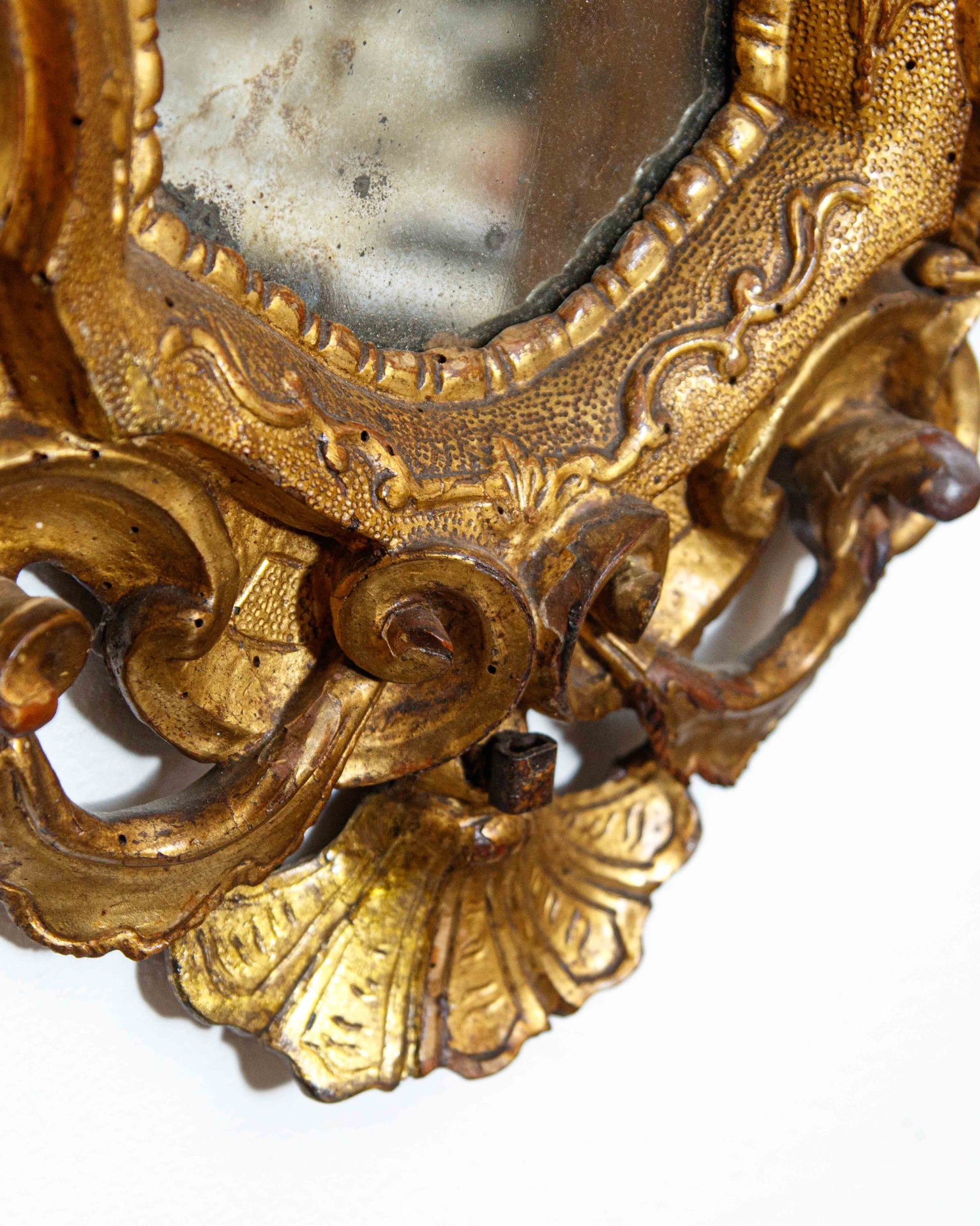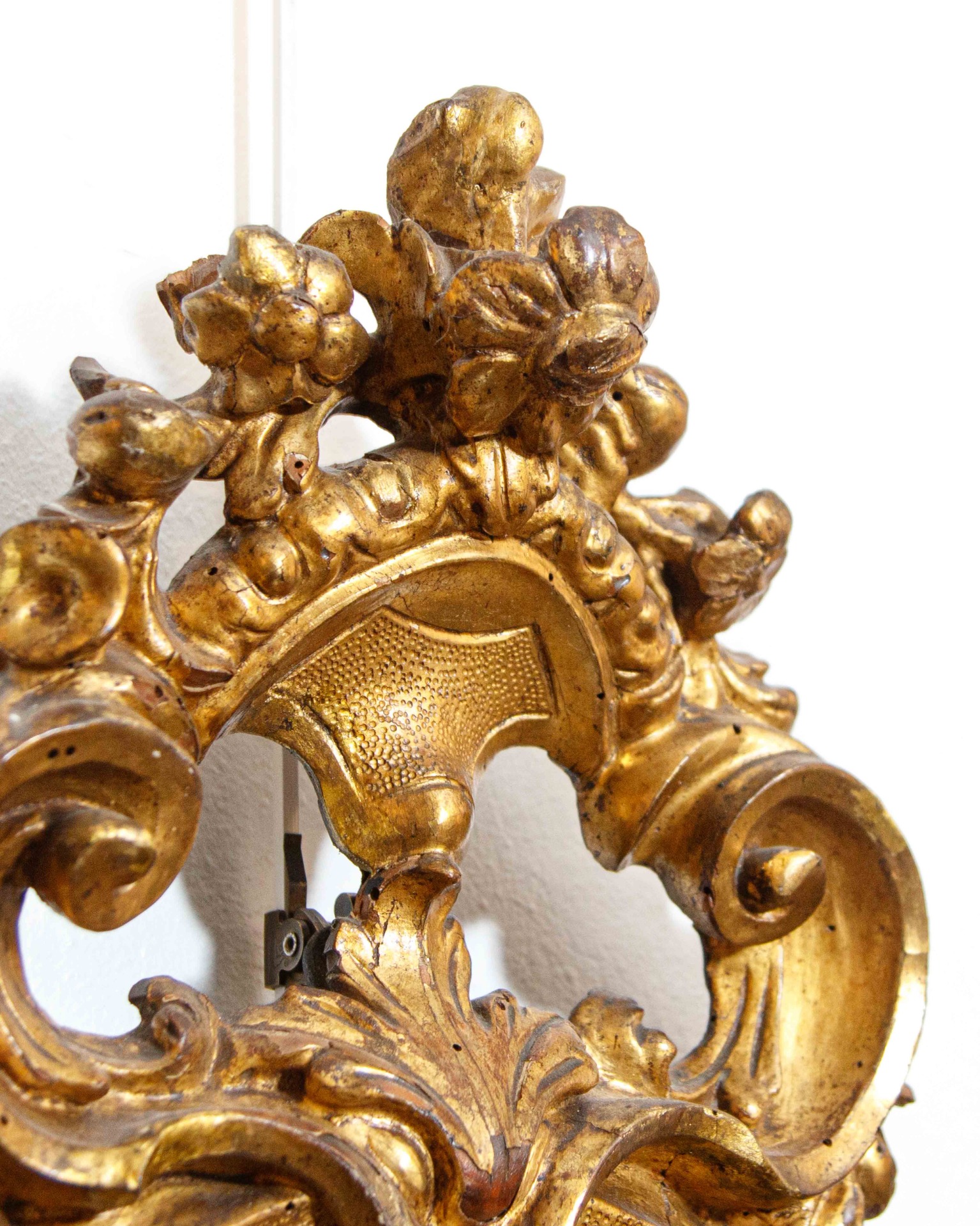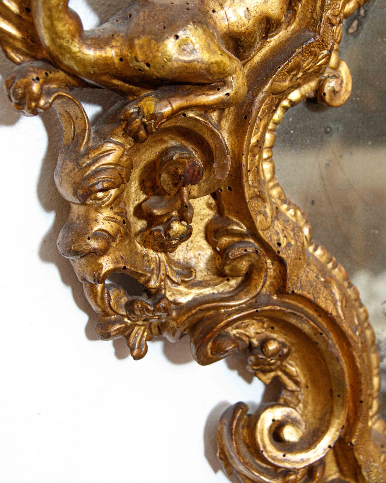 A mid-18th century Venetian-made mirror that follows the Rococo taste that became established in the lagoon during this period, both in the field of furniture and more generally in Venetian art. The undulating shape of the frame that surrounds the mirror is reflected in the fan-shaped mirror models then made in Venice; the same decoration of the frame uses elements and shapes typical of the era: volutes, vegetal elements, in particular in the flowers of the crest, and animals, such as the specular sea dragons on the outermost concave edges, or the shell on the bottom, another recurring element in Venetian decorations. The opulence of the ornaments carved in wood and gilded, however, manages not to weigh down the structure of the mirror which is graceful, delicate and light as a whole, following the canons of the Rococo style.