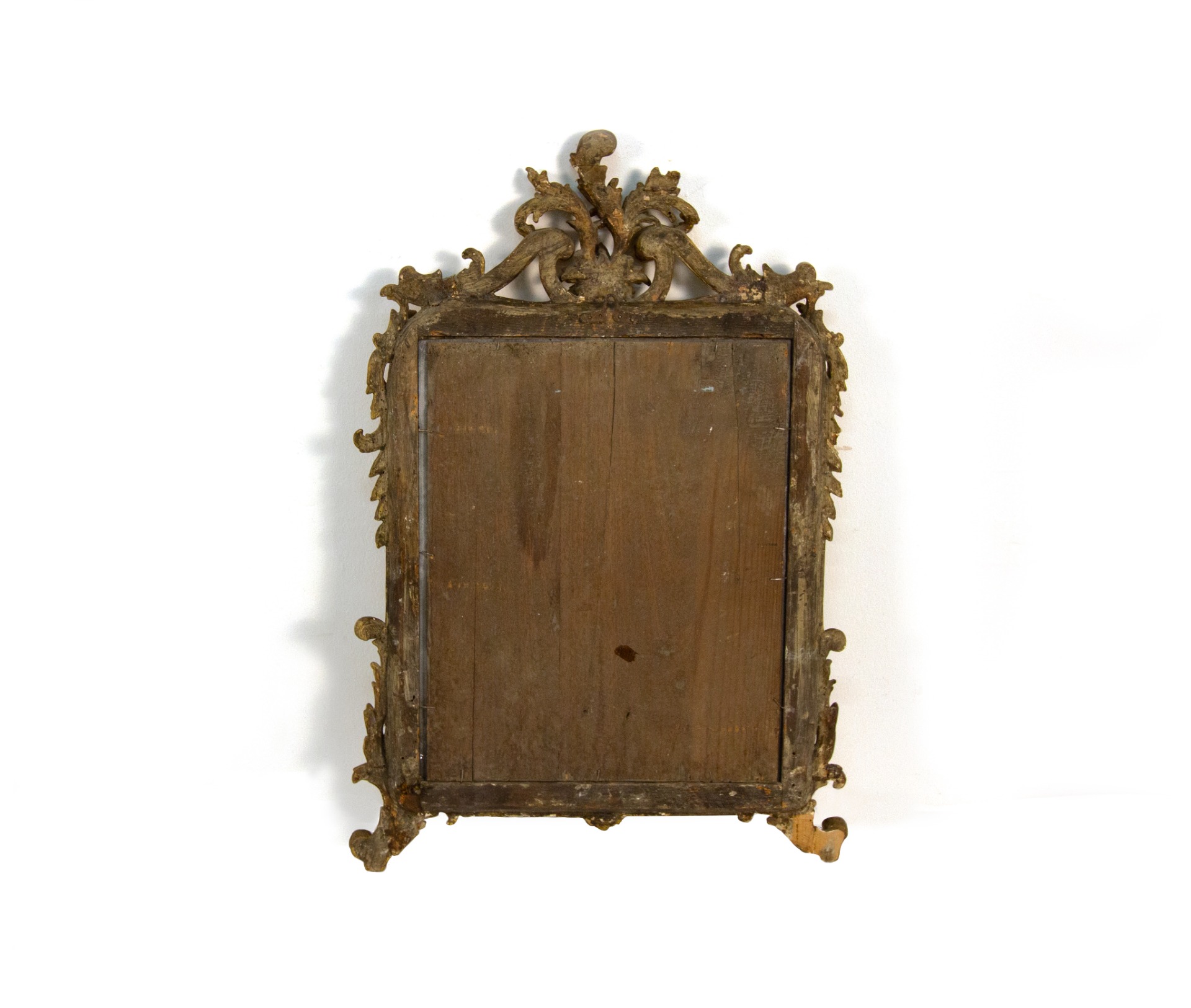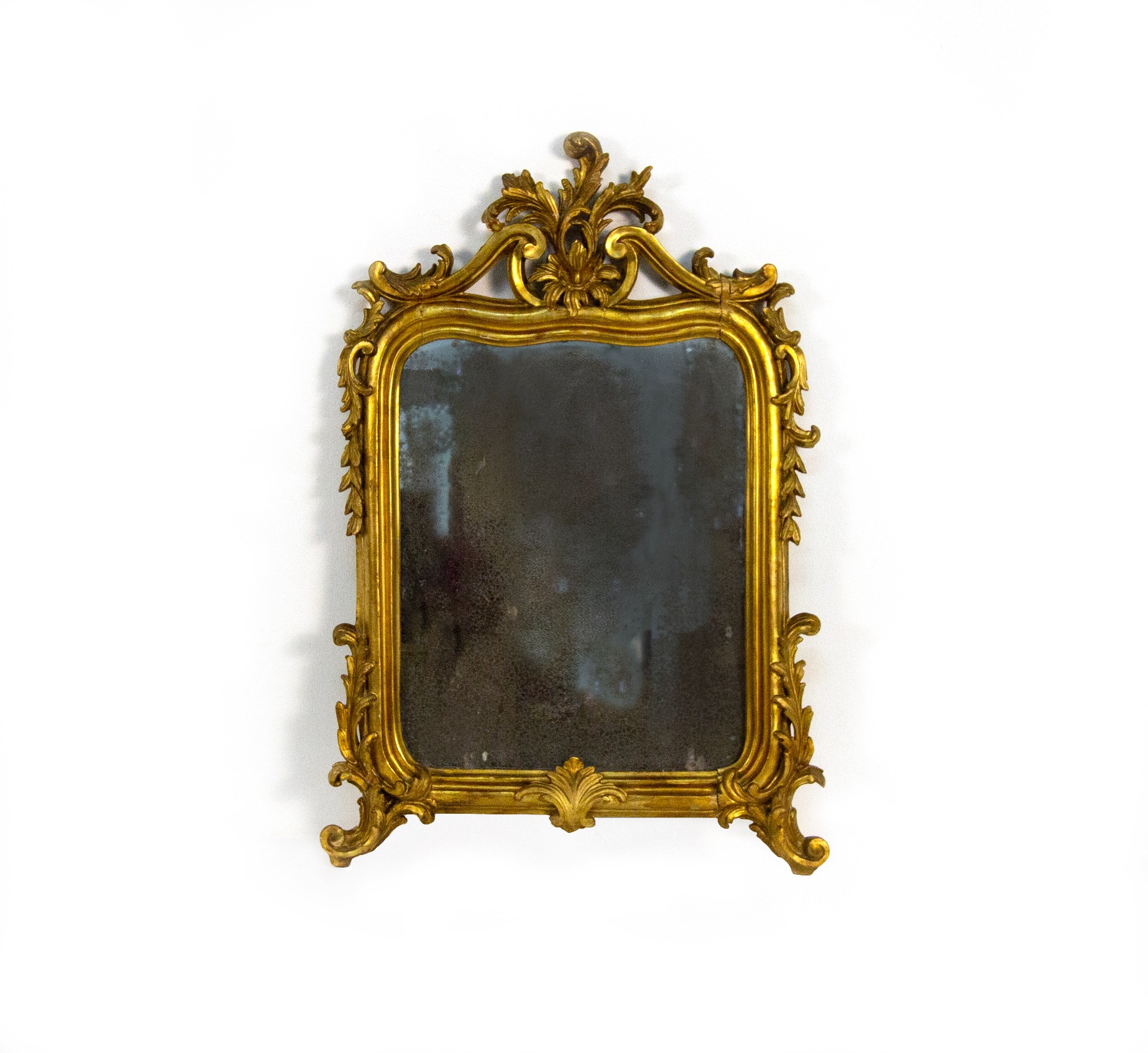Small carved, sculpted, and gilded wooden mirror, 19th century, with an internal frame with rounded and slightly molded corners decorated with opposing volutes. At the base are curl feet and foliate motifs, cm 73x50x6