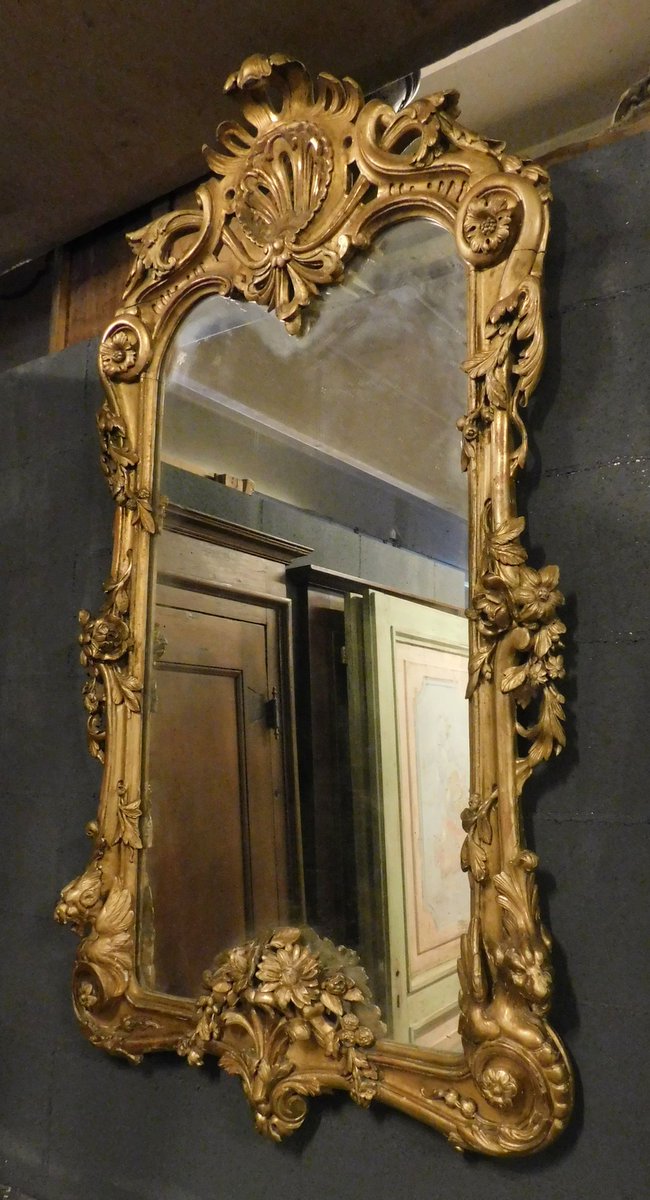 SPECC218 - Specchiera in legno intagliato e dorato. Decori a volute floreali e vegetali. Nella parte superiore è presente una ricca cimasa coronata centrata da conchiglia. La parte inferiore è arricchita con coppia di leoni alati e bouquet di fiori che incorniciano lo...