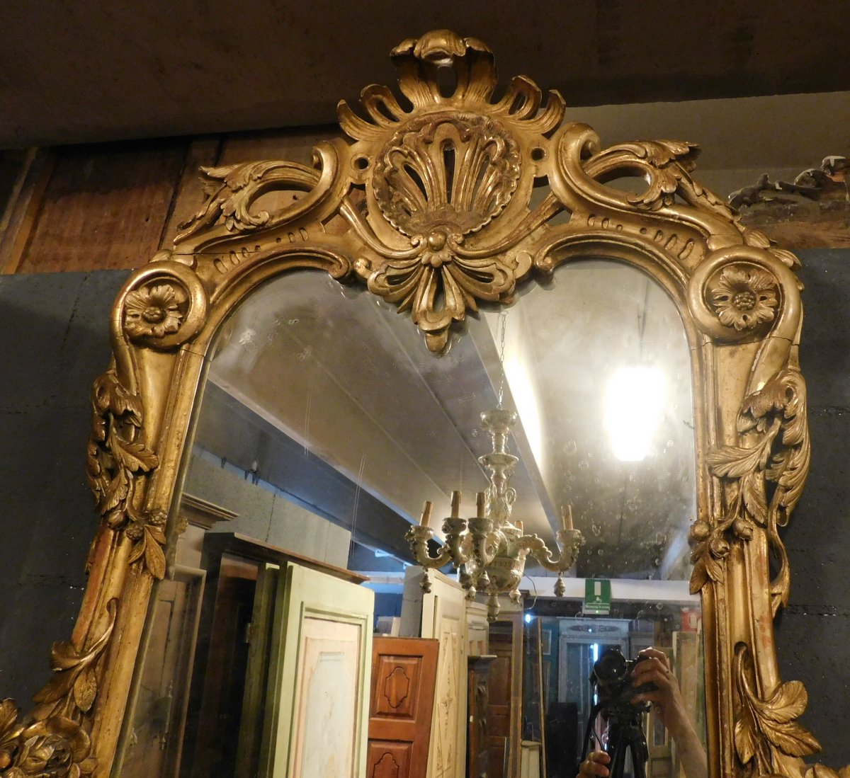 SPECC218 - Specchiera in legno intagliato e dorato. Decori a volute floreali e vegetali. Nella parte superiore è presente una ricca cimasa coronata centrata da conchiglia. La parte inferiore è arricchita con coppia di leoni alati e bouquet di fiori che incorniciano lo specchio. Epoca fine '700. Misura cm L 80 x H 146