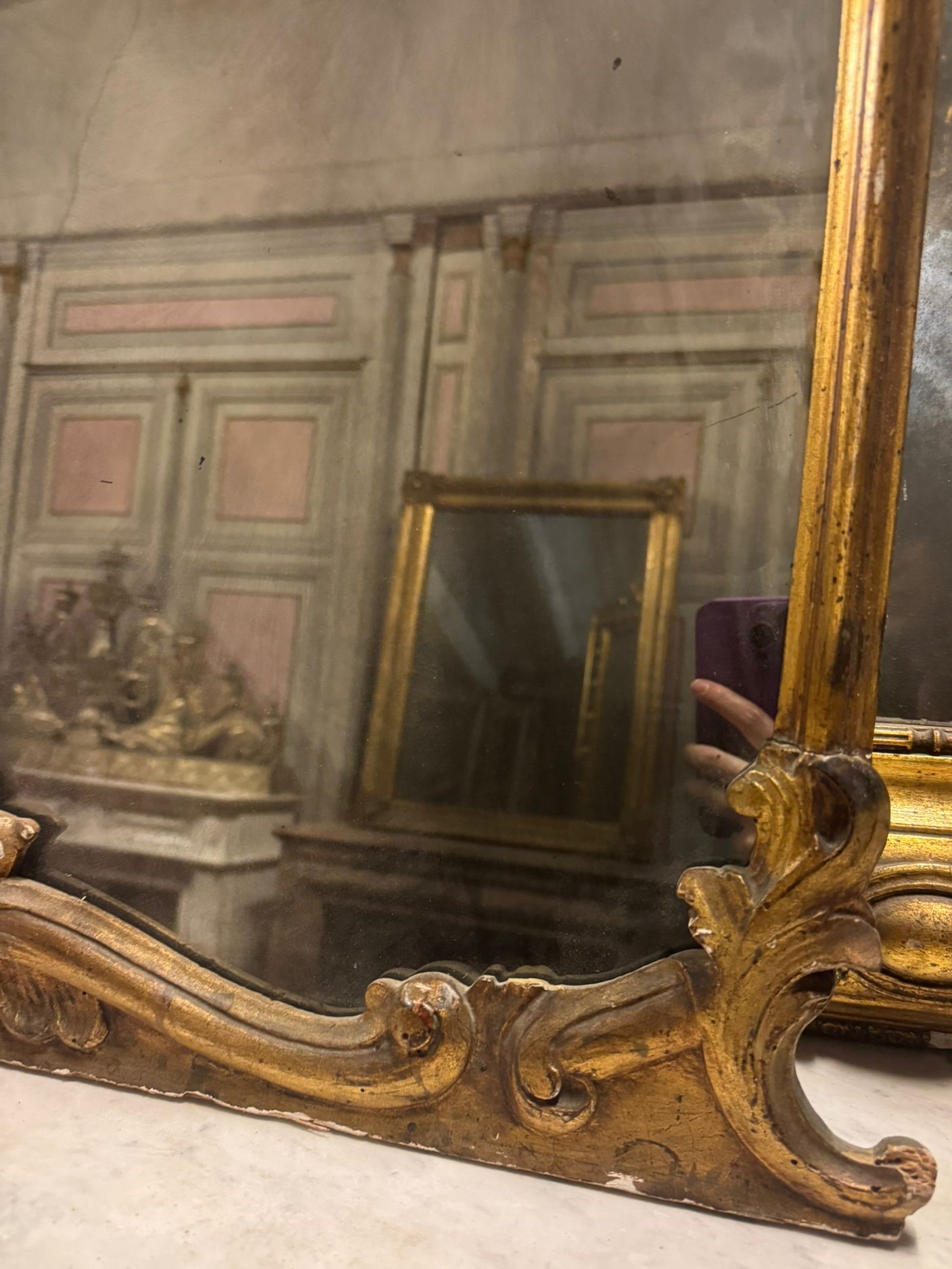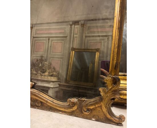 SPECC560 - Mirror in lacquered and gilded wood. Rich decorations with volutes centered by shells. 19th century. Dimensions cm W 85 x H 138