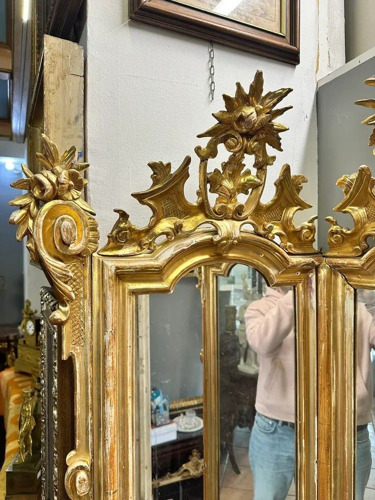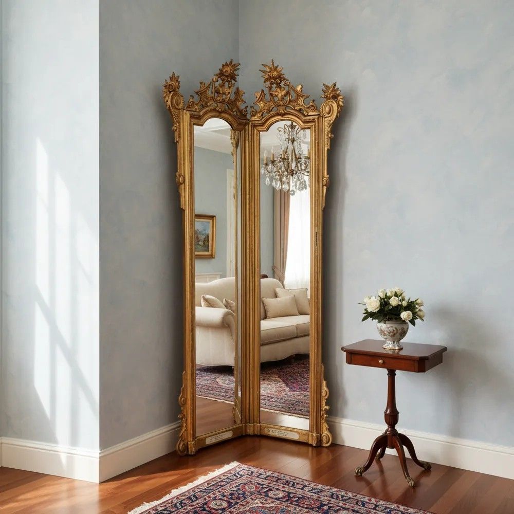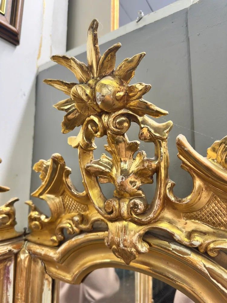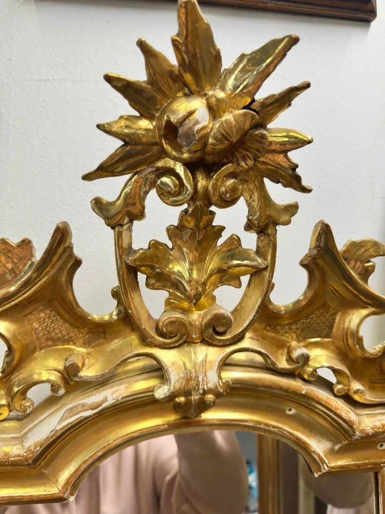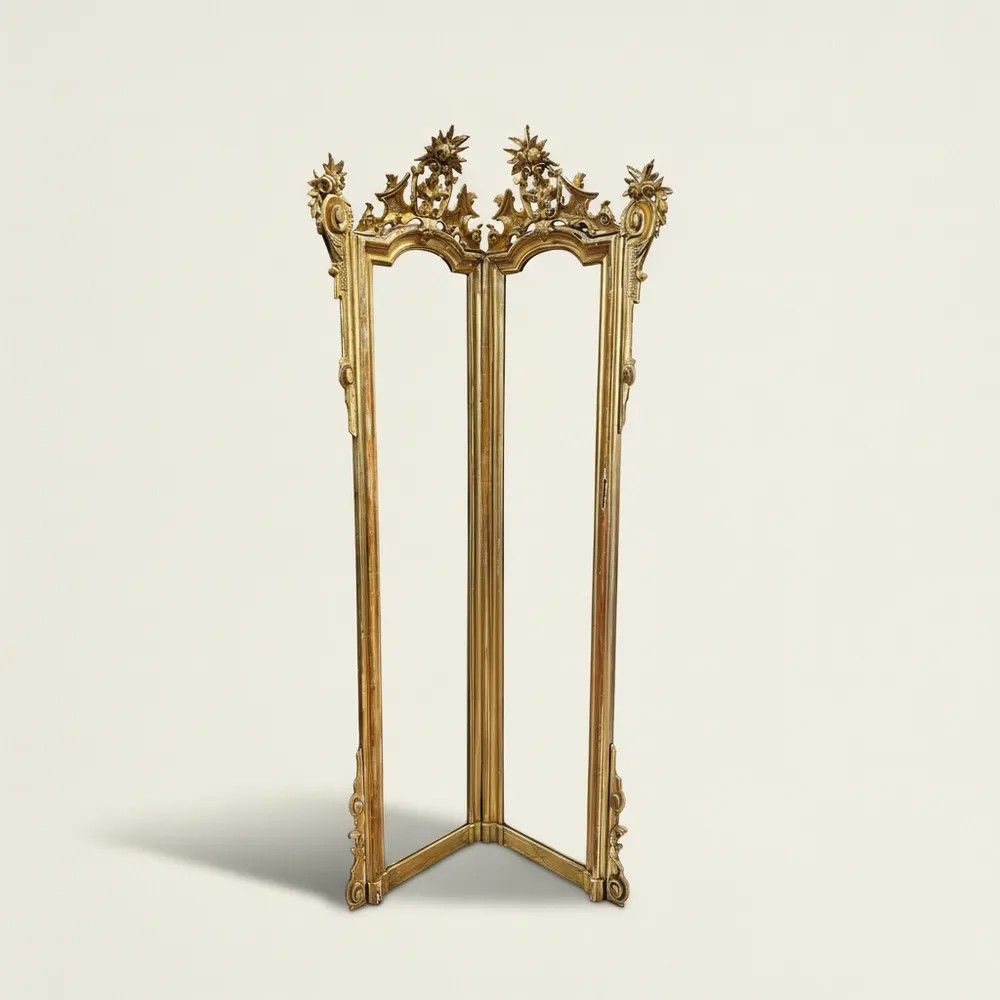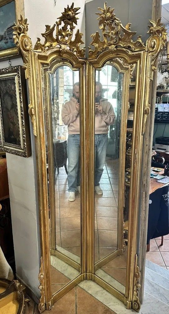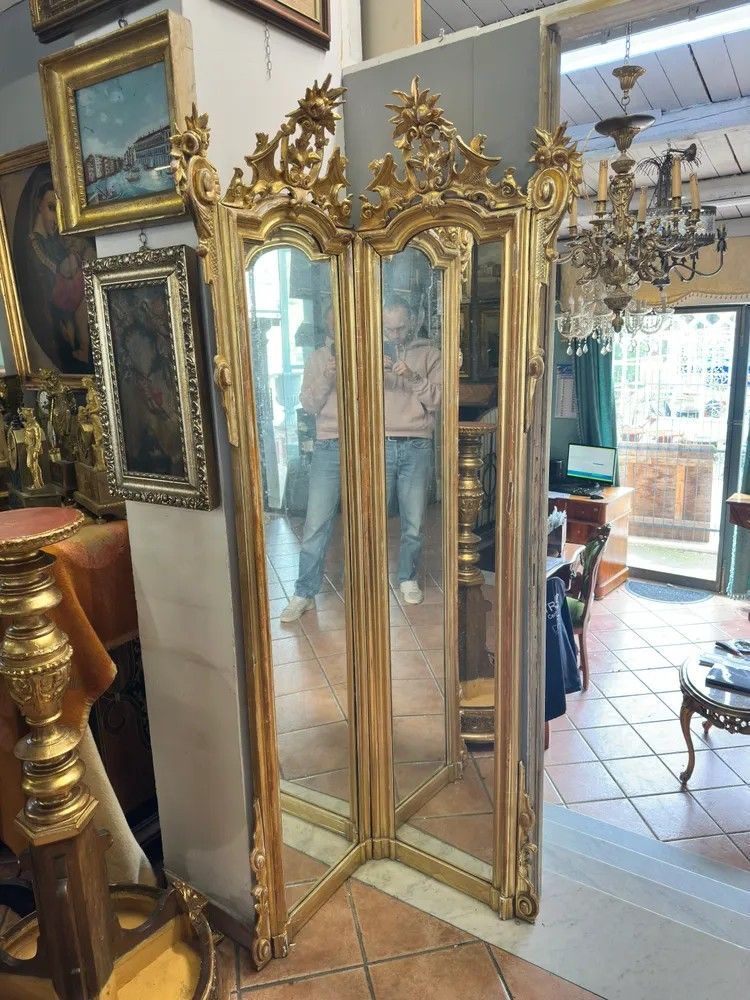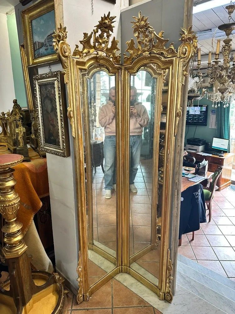 Lasciati conquistare dall’eleganza di questa specchiera angolare Luigi XV, un capolavoro del XVIII secolo che unisce funzionalità e magnificenza decorativa. La struttura a due ante sagomate crea un effetto panoramico che amplia e illumina l’ambiente riflettendo la luce in più direzioni.La cornice in legno intagliato e dorato a foglia oro zecchino presenta sinuose volute rocaille, con cartigli, rosette e foglie di acanto che culminano in elaborati ciuffi floreali scolpiti a mano. La doratura originale, leggermente patinata dal tempo, regala una calda vibrazione dorata impreziosita da piccole usure che testimoniano la storia dell’oggetto.Epoca: metà XVIII secolo, circa 1750Stile: Luigi XV – gusto rocaille franceseMateriale: legno intagliato, doratura a foglia oro zecchinoDimensioni: h 200 cm; lati 60 × 60 cmCondizioni: buona patina originale con normali segni d’età; specchiatura coeva con leggere fioritureGrazie alla pianta a V di 90°, la specchiera si adagia perfettamente nell’angolo di un ingresso, di un salotto o di una camera da letto, diventando un raffinato punto focale. Ideale anche per boutique, showroom o hall d’hotel che desiderano offrire un tocco di lusso d’epoca.Ogni dettaglio di questo oggetto racconta la maestria degli artigiani del Settecento: l’intaglio profondo, le cornici modanate, i delicati riccioli che incorniciano lo specchio e i piedini terminanti in eleganti motivi fogliacei.Un pezzo unico, pronto a trasformare qualsiasi spazio in un ambiente di charme d’altri tempi.Stile: Luigi XV Materiale: LegnoAltezza (cm): 200Larghezza (cm): 60 x 60Epoca: XVIII Secolo - 1700