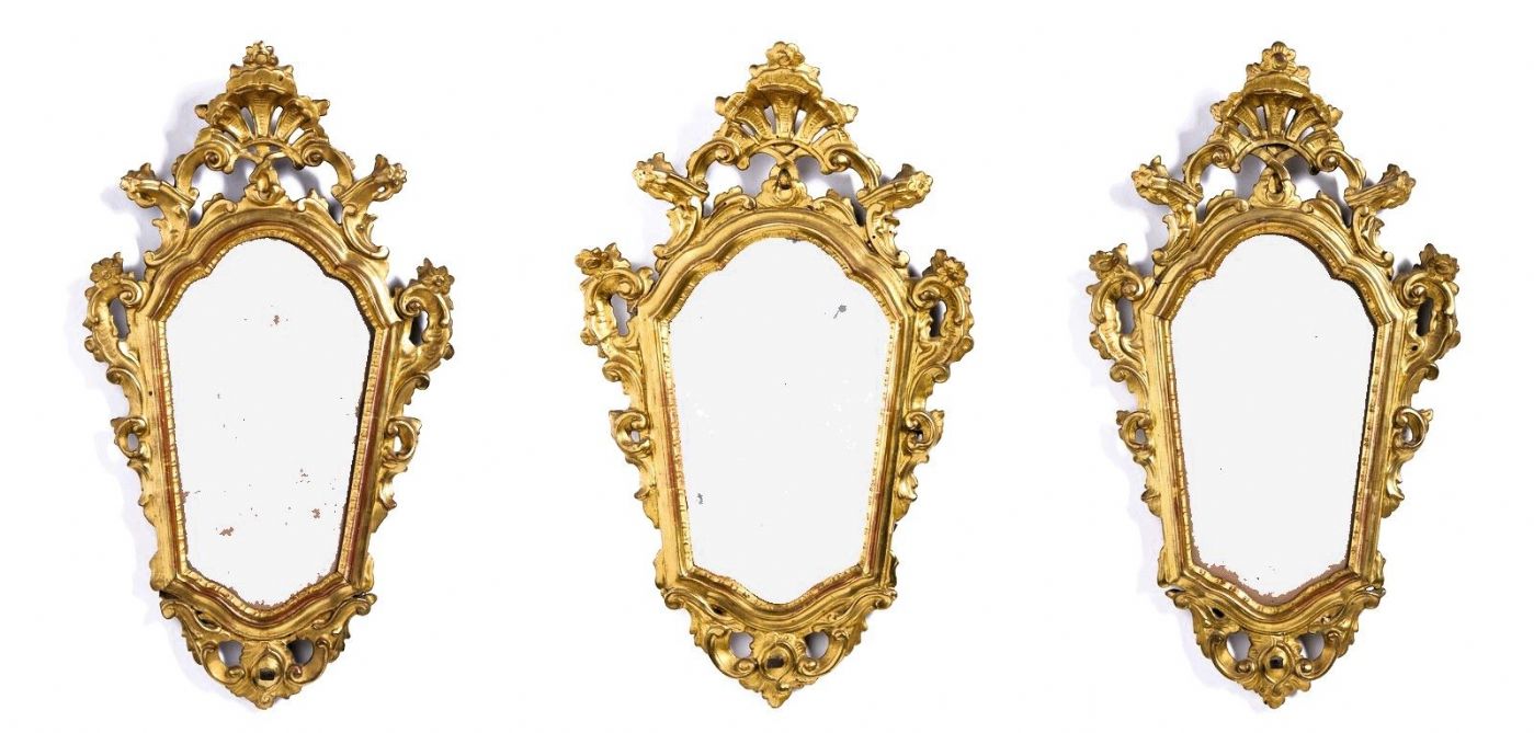 Rare group of 3 elegant mirrors in carved and gilded wood with "rocaille" friezes and floral motifs in Louis XV style.