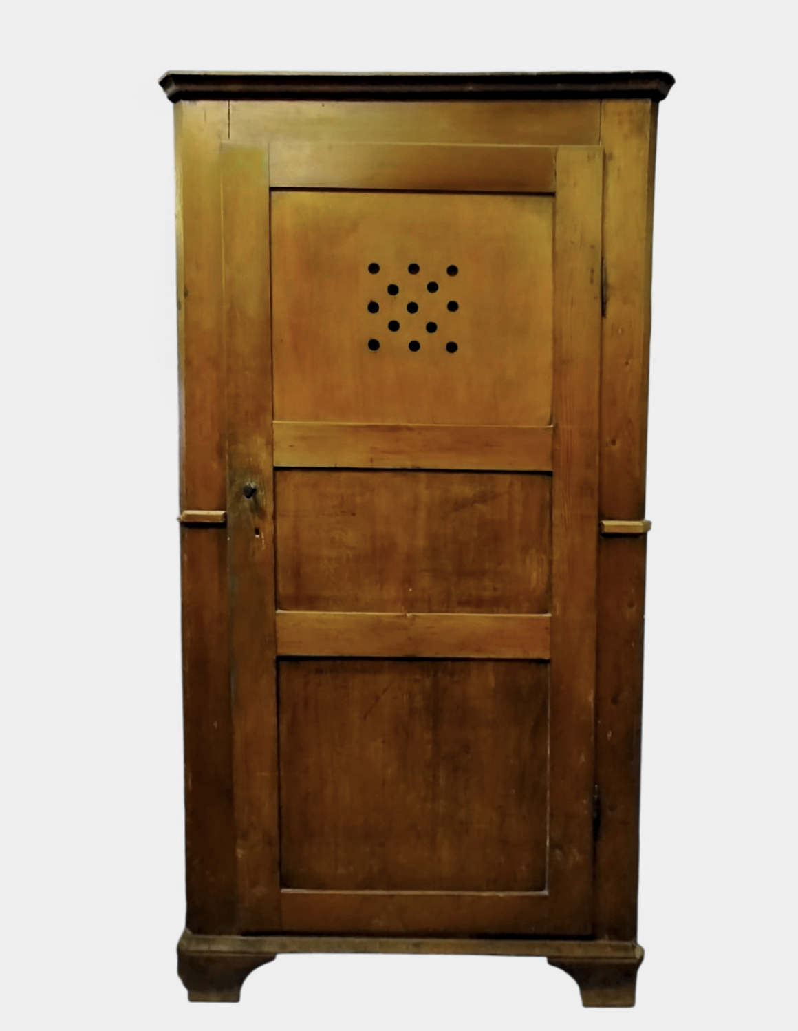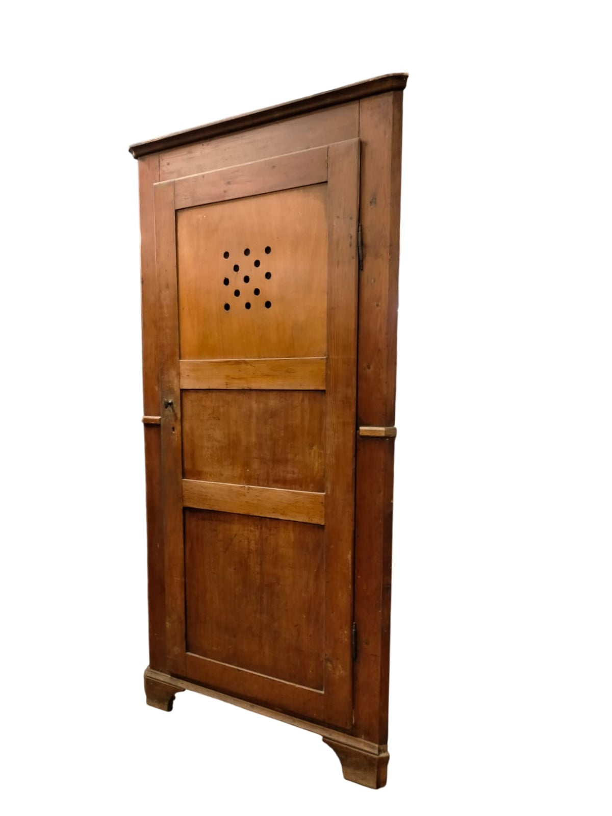 Angoliera romagnola della seconda metà dell’Ottocento in abete e tavolo romagnolo anni ’30/’40 in olmo massiccio, due pezzi di valore storico e artigianale, perfettamente abbinabili per stile, materiali ed epoca. Nello sportello superiore l'angoliera ha fori originali per conservare le vivande, caratteristica tipica della tradizione romagnola.