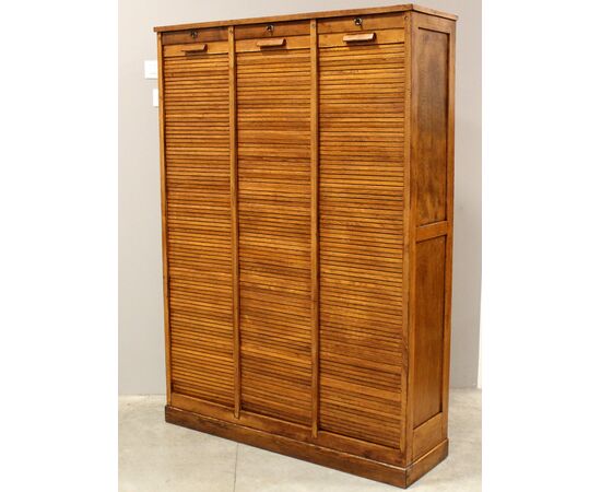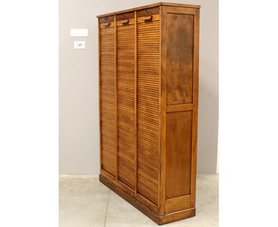 Classificatore a serranda tripla In rovere  Epoca primi '900 Misure: larghezza 128 cm , profondità 38 cm , altezza 180 cm Restaurato (vedere foto) Sulle reali condizioni dell'oggetto valutare le fotografie in quanto hanno valore prioritario e non discutibile. Rilasciamo Certificato di...