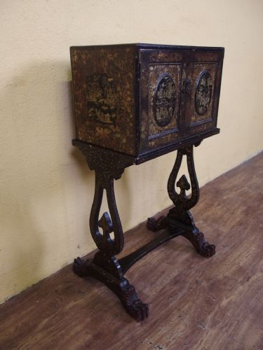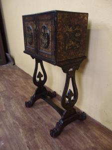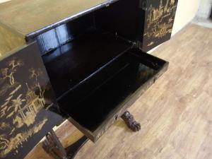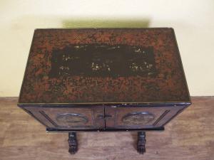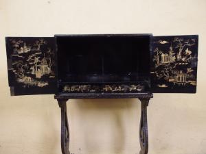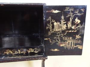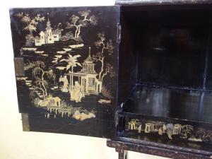 Beautiful black lacquered small cabinet of Chinese origin, oriental style, second half of the 19th century.The item is completely original and needs some restoration (SEE PHOTOS). Note the quality of the paintings; the top detaches from the base.