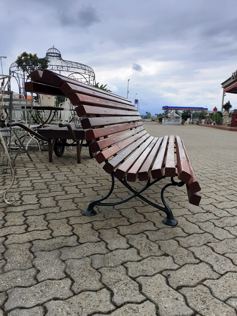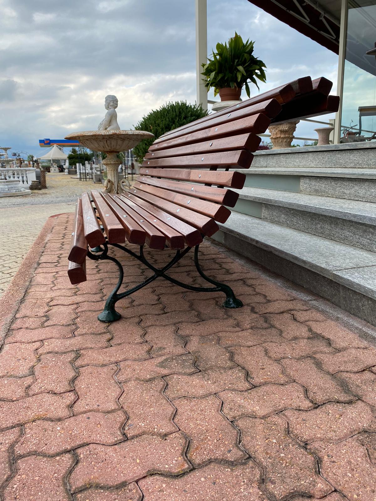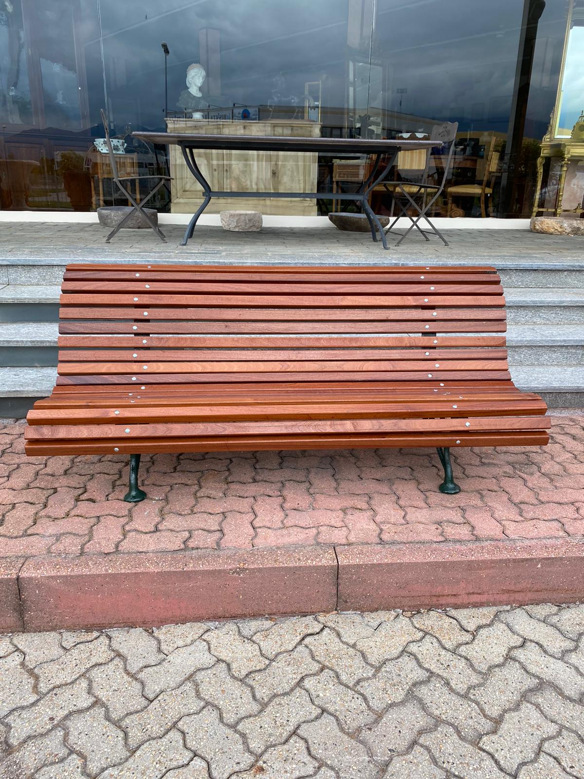 With antique cast iron legs and mahogany wood slats.