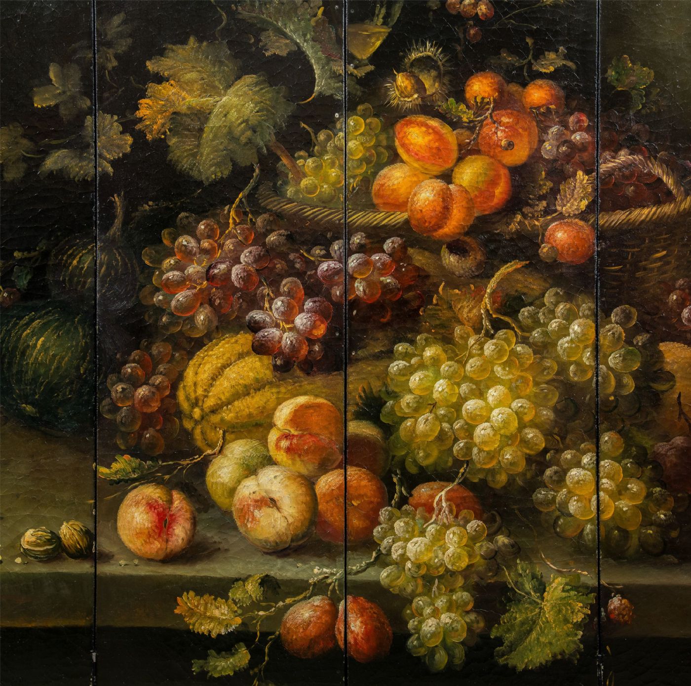 Wooden frame covered in leather. Entirely painted depicting a still life with pumpkins and fruit.