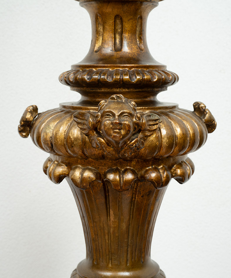 The central stem features dense foliate carving on the base and at the top, while the center presents beading alternating with cherub heads.