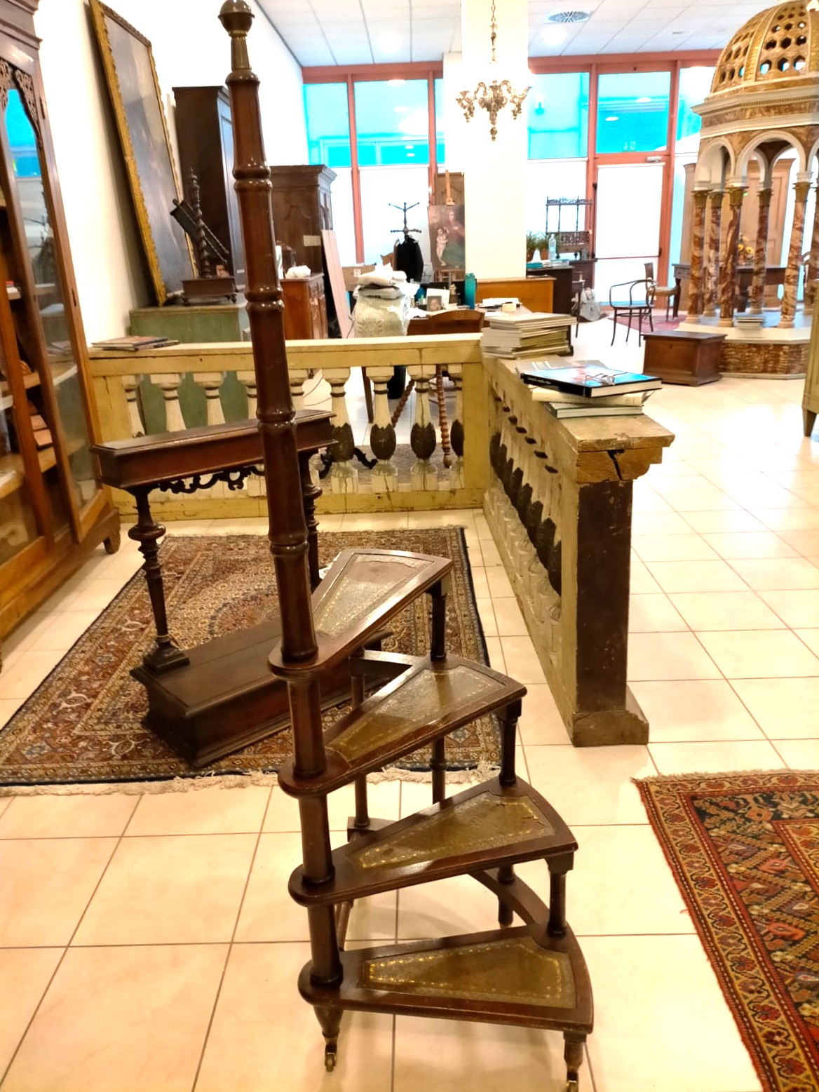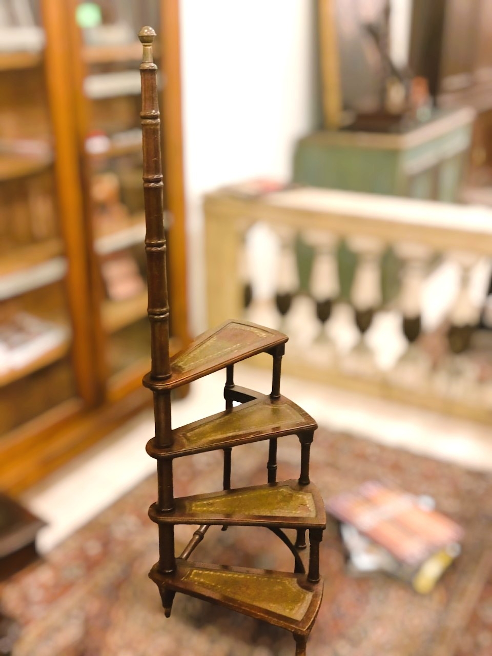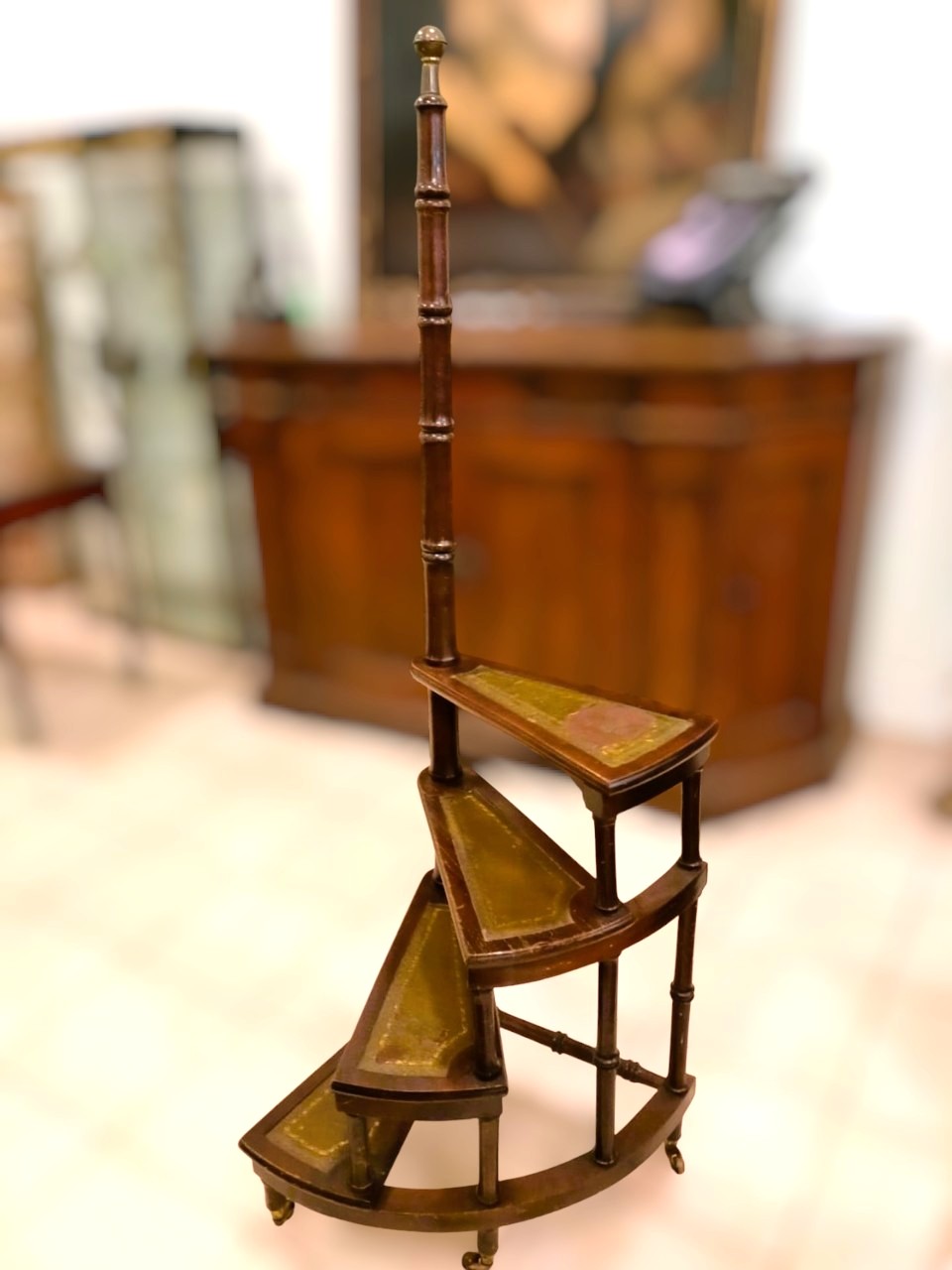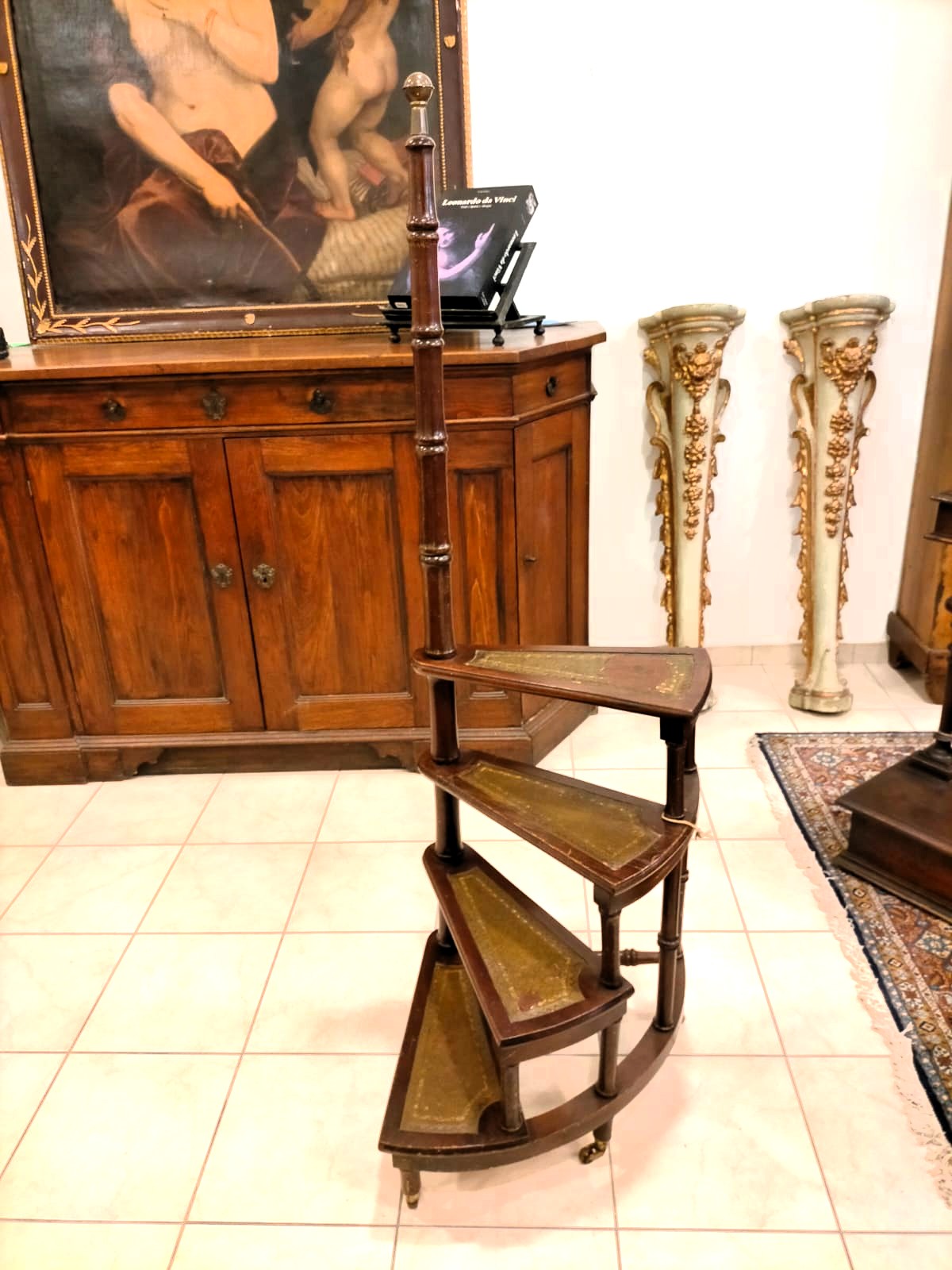Scala a chiocciola inglese in mogano – primi Novecento Elegante piccola scala a chiocciola da biblioteca/libreria, inglese, realizzata in pregiato mogano. I quattro scalini, sormontati da pelle verde con delicata stampa in oro, poggiano su colonne tornite, la guida, anch’essa tornita si conclude con un pomello in ottone Le rotelle in ottone permettono di spostare la scala con facilità La scala, alta 162 (con la guida) ha 4 gradini alti 78 cm, ha una larghezza e profondità di 49,5 cm, dimensioni perfette per librerie domestiche o studi. Questo pezzo unisce funzionalità e fascino vintage, rappresentando un bell’ elemento d’arredo. Altezza totale: 162 cm Altezza gradini: 78 cm Larghezza e profondità: 49,5 cm Per qualsiasi informazione o per ottenere fotografie aggiuntive, non esitare a contattarci. Ti invitiamo a venire a trovarci in negozio per scoprire di persona la nostra collezione. Offriamo un ampio ventaglio di servizi di restauro, sia completo che conservativo, dedicato a ciascun pezzo della nostra collezione. Effettuiamo spedizioni in tutta Italia e all’estero, con massima cura e sicurezza. I dettagli del trasporto vengono definiti in modo personalizzato, per garantire la tua piena soddisfazione.