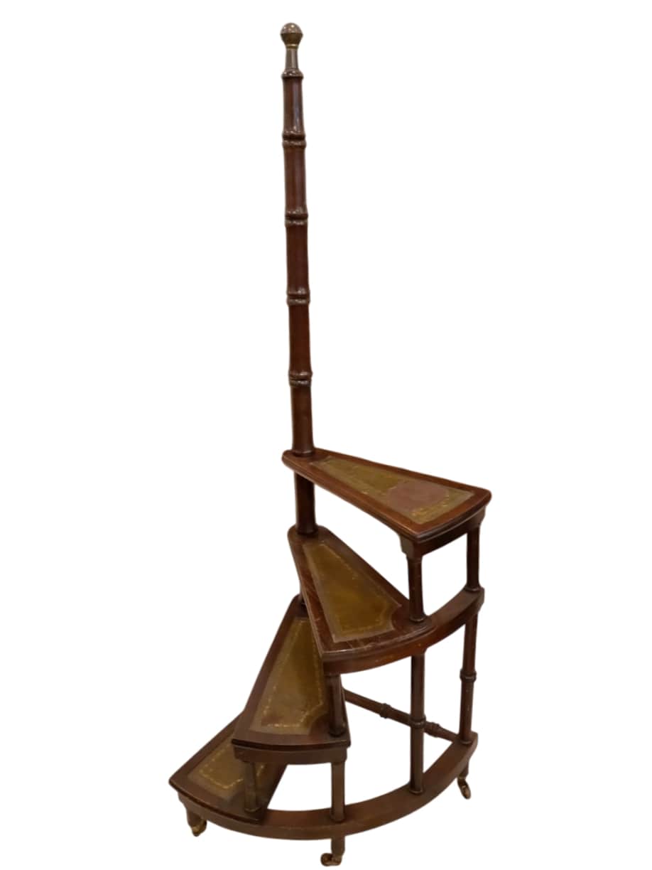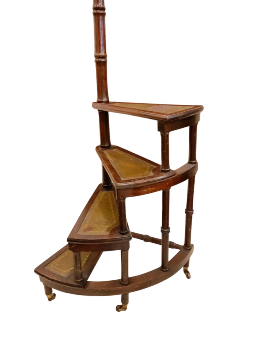 Scala a chiocciola inglese in mogano – primi Novecento Elegante piccola scala a chiocciola da biblioteca/libreria, inglese, realizzata in pregiato mogano. I quattro scalini, sormontati da pelle verde con delicata stampa in oro, poggiano su colonne tornite, la guida, anch’essa...